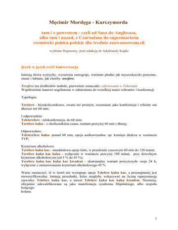 Męcimir Mordęga - Kurczymorda tam i z powrotem - czyli od Sasa do Anglosasa, albo tam i nazad, z Czarnolasu do supermarketu rozmówki polsko-polskie dla średnio zaawansowanych wybrane fragmenty, pod redakcją dr Adeltraudy Kupki język w język czyli konwersacja Istnieją słowa wytrychy, wyrażenia samograje, warianto płodne jak myszoskoczki pustynne, znane i lubiane, jak choćby- terefere. Terefere ma źródłosłów arabski, pierwotnie oznaczało: referowanie w Teheranie Współcześnie stanowi uogólnienie w odniesieniu do wszelkiej maści referatów i konferencji. Typologia: Terefere - bezokolicznikowe, zwane też prostym, rozumiane jako konferencje i referaty nie dłuższe niż 60 min; I odpowiednio Teleterefere - telekonferencja, do 60 min; Terefere kuku - z okolicznikiem czasu, wariant powyżej 60 min i dłużej; Odpowiednio: Teleterefere kuku- ponad 60 min, opcja audiowizualna: np. komisja śledcza w wariancie TVP; Kryterium alkoholowe: Terefere kuku kac - standardowa opcja kuku, w przedziale czasowym 60 min do 120 minut; Terefere kuku kac kuku - wyłącznie w wariancie powyżej 180 minut, przy dowolnym kryterium alkoholowym (od 5 % do 45 %); Terefere kuku kac kuku kac kwadrat - ekstremalny wariant powyższych: sesja 24 h, wyłącznie z zastosowaniem kryterium alkoholowego 45 % Warto zaznaczyć, iż w teorii nie występuje opcja Telefere kuku kac, a przynajmniej jest nieweryfikowalna. Istnieją przesłanki, które mogłyby wskazywać na liczną reprezentację zjawiska: Telefere kuku kac, a nawet Telefere kuku kac kuku kwadrat. Niemniej, oficjalnie zakwalifikowane są jako manifestacja syndromu filipińskiego, albo zespołu bolącego kolana. 1 Język a inwersja znaczeniowa W odpowiedzi na wysoką koniunkturę na prostotę językową „żeby żyło się łatwiej”, przygotowałem krótkie zestawienie powszechnie znanych wyrazów i zwrotów, modyfikując jedynie ich warstwę znaczeniową, z intencją uproszczeń norm aktualnie obowiązujących wg słowników. Pierwotne znaczenie: Tyrania - archaiczna kategoria HR, i rzeczownik pochodny: Tyran Propozycja: Ty rania? – zamiast dłuższego zwrotu: Czy się zraniłeś/ zraniłaś/skaleczyłeś/skaleczyłaś? Natomiast, rzeczownik tyran w formie dopełniacza r.m. l. poj.: tyrana, przy założeniu zmiennej intonacji, z powodzeniem zastąpi niektóre formy wulgarne: agresywnie: Ty rana ?! zamiast: Jebnąć ci? ! z ubolewaniem: Ty rana ... – zamiast: Ale mi zajebałeś.... Kutas-kutasik, dawniej - rodzaj pędzelka, pompona u pasa. Obecnie funkcjonuje wyłącznie jako wulgaryzm, forma obraźliwa, także na określenie członka męskiego. Tutaj propozycja polega na swoistej znaczeniowej inwersji. Pompon - zamiast zwulgaryzowanego kutas. Opcjonalnie: Pomponisko, kiedy epitet ma być mocniejszy, i wg gradacji najsilniejszy akcent: Pomponuch - osoba, wobec której żywimy chęć popełnienia dotkliwego rękoczynu. Aktualna wersja: - Przypierdolić ci skurwielu! brzmiałaby zatem: - Ty rana! Pomponuch! Analogicznie, kutas na określenie penisa, zastąpimy wyrazem Pędzel. Odpowiednio: Pędzelek - członek dziecięcy, inaczej siusiaczek, opcjonalnie – członek męski niewielkich gabarytów. Dalej: Pędzlisko - w odniesieniu do członków męskich, antropologicznie powiązanych z rasą czarną. I tak wyrażenie: - Przyciąłeś sobie kutasa? Może brzmieć: - Ty rania pędzelek? I bardziej złożona znaczeniowo forma: Ty rana pomponisko, pędzlisko! Jako zwrot o znaczeniu: Urwę ci kutasa czarny skurwielu! 2 Język a biurokracja Biorąc pod uwagę dokuczliwą biurokratyzację, co odnosi się również do karkołomnych stylistycznie pisemnych wniosków o charakterze oficjalnym, nie ulega kwestii zasadność zmodyfikowania tego stanu rzeczy. Dzięki czemu zaoszczędzimy nie tylko wysiłku, ale też papieru - gdyż nade wszystko: chrońmy lasy tropikalne! Przykład współczesnej formy stosowanej przez wnioskodawcę: Zwracam się z uprzejmą prośbą o ... Ta przesadnie grzecznościowa formuła jest zbyteczna, przecież wnioskodawca występuje już w roli petenta, czyli z założenia „z pokorą i uniżeniem”, „padając do nóżek” i całując po rączkach, pupciach, niepotrzebne skreślić. Wystarczyłoby znacznie prostsze sformułowanie jak: Jest taka sprawa.: tu po dwukropku zwięźle odnotowujemy problem/potrzebę. Przykład przesadnie rozwlekłej formy podania: Do Pana Dziekana prof. n. dr hab. Antoniego Sodomy-Gomorowskiego Zwracam się z uprzejmą prośbą o anulowanie decyzji o skreśleniu z listy studentów 1 semestru, 1 roku studiów, AM, wydział lekarski – na kierunku stomatologia. Prośbę swą motywuję faktem, iż decyzja została podjęta omyłkowo, na skutek opóźnienia w złożeniu egzaminu praktycznego z przedmiotu – operowanie wiertłem masywnym. Pragnę nadmienić, iż rzeczony egzamin zdałem zaocznie – w lokalu mieszkalnym przy al. Unii 16/32, wywierciwszy otwór o średnicy 2 cm, w materiale beton, wiertarką udarową, celem zawieszenia półki. Zważywszy na zreferowane okoliczności, z całym szacunkiem wnoszę o rehabilitację statusu studenta naszej szacownej Alma Mater. Licząc na pozytywne rozpatrzenie niniejszego podania, z wyrazami szacunku, oraz ubolewania tytułem perturbacji Grzegorz Gżegżółka Wersja proponowana: Servus Tolek Jest taka sprawa: nie zaliczyłem tego koła, ale zajefajnie wymiatam wiertłem. Bądź gościem, i pozwól wrócić na uniwerek. pozdro Grzechu, i sorry za klopot 3 Język a kultura popularna Jak wyrazić sens życia w kilku słowach? Jak napisać dobrą piosenkę? Wszyscy pragniemy miłości, szczęścia, oraz akceptacji, udręczeni lękiem przed alienacją i cierpieniem. Odpowiedź zdaje się znać, absolwent technikum górniczo-hutniczego, 38 letni Krystian Krawczyk ze Zduńskiej Woli. Laureat licznych konkursów, autor i kompozytor wielu szlagierów, żeby wymienić nostalgiczną balladę: „Kota boli ucho” (debiut Ciechocinek 2007), czy napisany w duchu pos