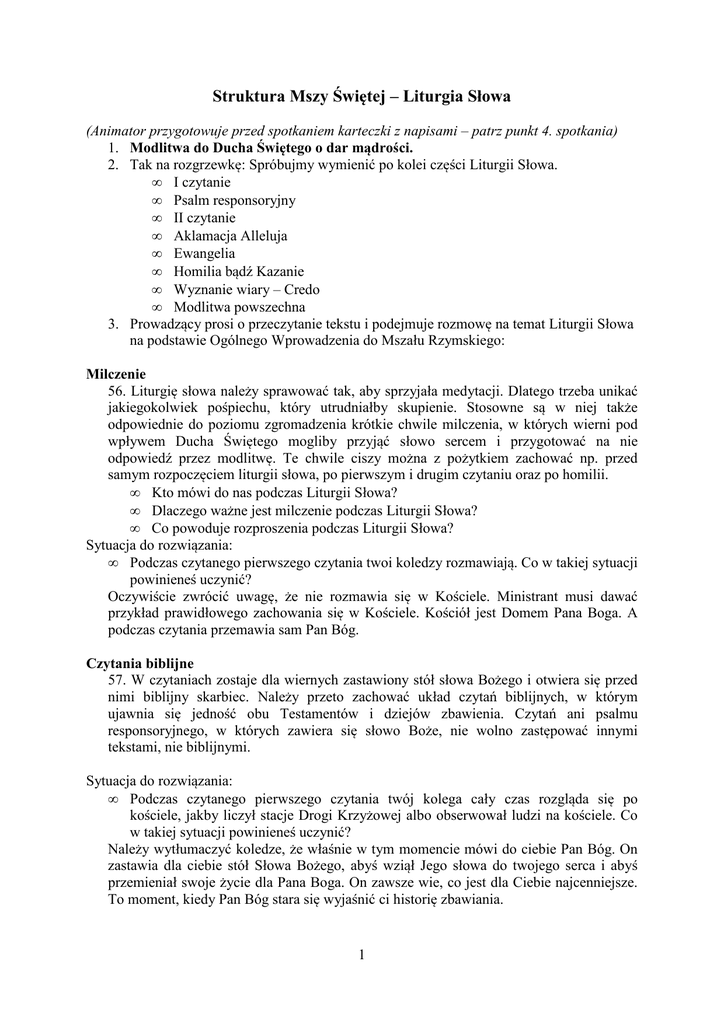 Struktura Mszy Świętej – Liturgia Słowa (Animator przygotowuje przed spotkaniem karteczki z napisami – patrz punkt 4. spotkania) 1. Modlitwa do Ducha Świętego o dar mądrości. 2. Tak na rozgrzewkę: Spróbujmy wymienić po kolei części Liturgii Słowa. • I czytanie • Psalm responsoryjny • II czytanie • Aklamacja Alleluja • Ewangelia • Homilia bądź Kazanie • Wyznanie wiary – Credo • Modlitwa powszechna 3. Prowadzący prosi o przeczytanie tekstu i podejmuje rozmowę na temat Liturgii Słowa na podstawie Ogólnego Wprowadzenia do Mszału Rzymskiego: Milczenie 56. Liturgię słowa należy sprawować tak, aby sprzyjała medytacji. Dlatego trzeba unikać jakiegokolwiek pośpiechu, który utrudniałby skupienie. Stosowne są w niej także odpowiednie do poziomu zgromadzenia krótkie chwile milczenia, w których wierni pod wpływem Ducha Świętego mogliby przyjąć słowo sercem i przygotować na nie odpowiedź przez modlitwę. Te chwile ciszy można z pożytkiem zachować np. przed samym rozpoczęciem liturgii słowa, po pierwszym i drugim czytaniu oraz po homilii. • Kto mówi do nas podczas Liturgii Słowa? • Dlaczego ważne jest milczenie podczas Liturgii Słowa? • Co powoduje rozproszenia podczas Liturgii Słowa? Sytuacja do rozwiązania: • Podczas czytanego pierwszego czytania twoi koledzy rozmawiają. Co w takiej sytuacji powinieneś uczynić? Oczywiście zwrócić uwagę, że nie rozmawia się w Kościele. Ministrant musi dawać przykład prawidłowego zachowania się w Kościele. Kościół jest Domem Pana Boga. A podczas czytania przemawia sam Pan Bóg. Czytania biblijne 57. W czytaniach zostaje dla wiernych zastawiony stół słowa Bożego i otwiera się przed nimi biblijny skarbiec. Należy przeto zachować układ czytań biblijnych, w którym ujawnia się jedność obu Testamentów i dziejów zbawienia. Czytań ani psalmu responsoryjnego, w których zawiera się słowo Boże, nie wolno zastępować innymi tekstami, nie biblijnymi. Sytuacja do rozwiązania: • Podczas czytanego pierwszego czytania twój kolega cały czas rozgląda się po kościele, jakby liczył stacje Drogi Krzyżowej albo obserwował ludzi na kościele. Co w takiej sytuacji powinieneś uczynić? Należy wytłumaczyć koledze, że właśnie w tym momencie mówi do ciebie Pan Bóg. On zastawia dla ciebie stół Słowa Bożego, abyś wziął Jego słowa do twojego serca i abyś przemieniał swoje życie dla Pana Boga. On zawsze wie, co jest dla Ciebie najcenniejsze. To moment, kiedy Pan Bóg stara się wyjaśnić ci historię zbawiania. 1 Psalm responsoryjny 61. Wypada, aby psalm responsoryjny był śpiewany, przynajmniej jeśli chodzi o refren należący do ludu. Psałterzysta więc, czyli kantor psalmu, stojąc na ambonie lub w innym odpowiednim miejscu, wykonuje wersety psalmu, podczas gdy całe zgromadzenie siedzi i słucha oraz uczestniczy w śpiewie poprzez refren, chyba że psalm jest wykonywany w sposób ciągły, czyli bez refrenu. Aby zaś lud łatwiej mógł wykonywać refren psalmu, zostały wybrane pewne teksty refrenów i psalmów, przeznaczone na różne okresy roku albo na dni ku czci różnych grup świętych. Teksty te mogą być stosowane zamiast tekstów odpowiadających czytaniom, ilekroć psalm jest śpiewany. Jeśli nie można śpiewać psalmu, recytuje się go w sposób możliwie najbardziej sprzyjający medytacji nad słowem Bożym. Sytuacja do rozwiązania: • Przed Mszą Świętą dowiadujesz się, że nie będzie organisty. Co w takiej sytuacji powinieneś uczynić? Najlepiej zaproponować księdzu, że jesteś w stanie zaśpiewać psalm responsoryjny. Gdybyś nie posiadał zdolności muzykalnych, psalm możesz przeczytać. Aklamacja przed czytaniem Ewangelii 62. Po czytaniu bezpośrednio poprzedzającym Ewangelię wykonuje się Alleluja lub inny śpiew przewidziany w rubrykach zgodnie z wymogami okresu liturgicznego. Aklamacja ta stanowi samodzielny obrzęd, przez który zgromadzenie przyjmuje i pozdrawia Pana mającego doń przemawiać oraz śpiewem wyznaje wiarę. Wszyscy, stojąc, wykonują tę aklamację pod przewodnictwem scholi albo kantora oraz ją powtarzają; werset zaś śpiewa schola albo kantor. Sytuacja do rozwiązania: • Po przeczytaniu drugiego czytania (w przypadku, gdy aklamację wykonuje organista) lub po aklamacji Alleluja kantor zapomniał złożyć lekcjonarza, a kapłan lub diakon niesie ewangeliarz w stronę Ambony. Co w takiej sytuacji powinieneś zrobić? Należy złożyć lekcjonarz i go schować na półce pod amboną, aby kapłanowi lub diakonowi ułatwić ustawienie ewangeliarza do czytania Ewangelii. Homilia 65. Homilia, będąca częścią liturgii, jest bardzo zalecana: stanowi bowiem pokarm konieczny dla podtrzymania chrześcijańskiego życia. Winna być wyjaśnieniem jakiegoś aspektu czytań Pisma świętego albo innego tekstu spośród stałych lub zmiennych części Mszy św. danego dnia, z uwzględnieniem zarówno obchodzonego misterium, jak i szczególnych potrzeb słuchaczy. o Dlaczego ksiądz głosi kazanie lub homilię, czym się one różnią? Wyznanie wiary 67. Symbol, czyli wyznanie wiary, zmierza do tego, aby cały lud zgromadzony dał odpowiedź na słowo Boże zwiastowane w czytaniach Pisma świętego i wyjaśnione w homilii oraz przez wypowiedzenie reguły wiary według formuły zatwierdzonej do użytku liturgicznego przypomniał sobie i uczcił wielkie misteria wiary przed rozpoczęciem ich celebracji w Eucharystii. 2 Modlitwa powszechna 70. Modlitwa powszechna obejmuje zazwyczaj następujące intencje: a) b) c) d) w potrzebach Kościoła, za rządzących państwami i o zbawienie całego świata, za ludzi doświadczonych różnymi trudnościami, za miejscową wspólnotę. 4. Po przeanalizowaniu fragmentów z Ogólnego Wprowadzenia do Mszału Rzymskiego czas na podsumowanie pogłębionej wiedzy na temat Liturgii Słowa. Zagrajmy w: Czym jestem? (Animator przygotowuje przed spotkaniem karteczki z 