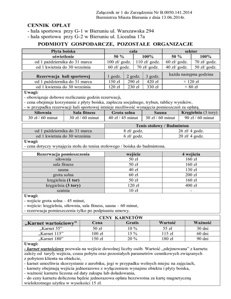 Załącznik nr 1 do Zarządzenia Nr B.0050.141.2014 Burmistrza Miasta Bierunia z dnia 13.06.2014r. CENNIK OPŁAT - hala sportowa przy G-1 w Bieruniu ul. Warszawska 294 - hala sportowa przy G-2 w Bieruniu ul. Licealna 17a PODMIOTY GOSPODARCZE, POZOSTAŁE ORGANIZACJE Płyta boiska oświetlenie od 1 października do 31 marca od 1 kwietnia do 30 września cała 50 % 100% 100 zł/ godz. 110 zł/ godz. 60 zł/ godz. 70 zł/ godz. sektor 50 % 100% 60 zł/ godz. 70 zł/ godz. 40 zł/ godz. 50 zł/ godz. każda następna godzina 1 godz. 2 godz. 3 godz. Rezerwacja hali sportowej od 1 października do 31 marca 150 zł 290 zł 420 zł + 120 zł od 1 kwietnia do 30 września 120 zł 230 zł 330 zł + 80 zł Uwagi: - obowiązuje dobowe rozliczanie godzin rezerwacji, - cena obejmuje korzystanie z płyty boiska, zaplecza socjalnego, trybun, tablicy wyników, - w przypadku rezerwacji hali sportowej istnieje możliwość wynajęcia pomieszczeń za opłatą. Kręgielnia (3 tory) Siłownia Sala fitness Grota solna Sauna 30 zł / 60 minut 30 zł / 60 minut 40 zł / 45 minut 30 zł / 60 minut 90 zł / 60 minut Tenis stołowy / Badminton 8 zł/ godz. 26 zł/ 4 godz. 6 zł/ godz. 20 zł/ 4 godz. od 1 października do 31 marca od 1 kwietnia do 30 września Uwagi: - cena dotyczy wynajęcia stołu do tenisa stołowego / boiska do badmintona. Rezerwacja pomieszczenia wejście siłownia 50 zł sala fitness 50 zł sauna 40 zł grota solna 60 zł kręgielnia (1 tor) 50 zł kręgielnia (3 tory) 120 zł szatnia 10 zł Uwagi: - wejście grota solna – 45 minut, - wejście: kręgielnia, siłownia, sala fitness, sauna – 60 minut, - rezerwacja pomieszczenia tylko po podpisaniu umowy. „Karnet wartościowy” „Karnet 55” „Karnet 115” „Karnet 180” CENY KARNETÓW Cena Gratis 50 zł 10 % 100 zł 15 % 150 zł 20 % 4 wejścia 160 zł 160 zł 130 zł 200 zł 160 zł 400 zł - Wartość 55 zł 115 zł 180 zł Ważność 30 dni 60 dni 90 dni Uwagi: - karnet wartościowy pozwala na wejście dowolnej liczby osób. Wartość „zdejmowana” z karnetu zależy od taryfy wejścia, czasu pobytu oraz pozostałych parametrów cennikowych związanych z pobytem klienta na obiekcie, - karnet umożliwia skorzystanie z aerobiku, jogi w przypadku wolnych miejsc na zajęciach, - karnety obejmują wejścia jednorazowe z wyłączeniem wynajmu obiektu i płyty boiska, - ważność karnetu liczona od daty zakupu lub doładowania, - do ceny karnetu doliczona będzie jednorazowa opłata bezzwrotna za kartę magnetyczną wielokrotnego użytku w wysokości 15 zł. OSOBY FIZYCZNE – bilety PŁYTA BOISKA cała sektor oświetlenie 50 % 100% 50 % 100% od 1 października do 31 marca 45 zł/ godz. 55 zł/ godz. 25 zł/ godz. 30 zł/ godz. od 1 kwietnia do 30 września 25 zł/ godz. 35 zł/ godz. 15 zł/ godz. 20 zł/ godz. od 1 lipca do 31 sierpnia * 10 zł/ godz. 15 zł/ godz. 5 zł/ godz. 10 zł/ godz. * zniżka dotyczy: dzieci, uczniów, studentów do ukończenia 26 roku życia (za okazaniem legitymacji). - opłaty dodatkowe: 10 zł – udostępnienie dodatkowej szatni w hali sportowej. TENIS STOŁOWY BADMINTON od 1 października do 31 marca 4 zł/ godz. 6 zł/ godz. od 1 kwietnia do 30 września 3 zł/ godz. 5 zł/ godz. Uwagi: cena dotyczy wynajęcia stołu do tenisa stołowego / boiska do badmintona. Do 2 osób 20 zł SAUNA Powyżej 2 osób 25 zł Uwagi: wejście sauna – 90 minut. Stawka normalna 5 zł Uwagi: wejście siłownia / sala fitness - 90 minut. Stawka ulgowa 3 zł SIŁOWNIA / SALA FITNESS GROTA SOLNA „Bilety rodzinne” Stawka normalna 8 zł „1 +1” „1 +2” 11 zł 15 zł Stawka ulgowa 5 zł „2 + 1” „2 + 2” 18 zł 20 zł Uwagi: - wejście grota solna: 45 minut, - dzieci do ukończenia 3 r. ż.: wstęp wolny. ZAJĘCIA AEROBIKU / JOGI Uwagi: obowiązuje regulamin prowadzonych zajęć 8 zł / zajęcia do godz. 16.00 od godz. 16.00 do 19.00 1 tor 3 tory 1 tor 3 tory Poniedziałek 15 zł * 40 zł * 20 zł 50 zł wtorek – czwartek 15 zł * 40 zł * 30 zł 80 zł Piątek 15 zł * 40 zł * 30 zł 80 zł sobota, niedziela, święta 30 zł 80 zł 35 zł 95 zł Bilet rodziny poniedziałek - piątek 15 zł * nie 25 zł nie dotyczy dotyczy sobota, niedziela, święta 25 zł 30 zł * dotyczy wynajęcia w dni wolne od zajęć szkolnych KRĘGIELNIA po godz. 19.00 1 tor 3 tory 25 zł 65 zł 35 zł 95 zł 40 zł 110 zł 45 zł 110 zł 35 zł 40 zł nie dotyczy OSOBY FIZYCZNE - karnety „KARNETY WEJŚCIOWE” od 1 października do 31 marca ZAJĘCIA AEROBIKU / JOGI od 1 kwietnia do 30 września 6 zł razy ilość zajęć - obowiązuje regulamin prowadzonych zajęć. Stawka normalna Stawka ulgowa SIŁOWNIA / SALA FITNESS 16 wejść 65 zł 40 zł miesięczny* 80 zł 60 zł Uwagi: - Z karnetu punktowego „zdejmowana” jest wartość 1 punktu za każde wejście, - czas wejścia określony wg ceny biletu, - karnet ważny 90 dni od daty zakupu lub doładowania, * Karnet imienny, wejście raz dziennie, czas wejścia - 135 minut, ważny 30 dni od daty zakupu. „KARNETY WARTOŚCIOWE” Cena Gratis Wartość Ważność „Karnet 55” „Karnet 115” „Karnet 180” 50 zł 100 zł 150 zł 10 % 15 % 20 % 55 zł 115 zł 180 zł 30 dni 60 dni 90 dni Uwagi: - karnet wartościowy pozwala na wejście dowolnej liczby osób. Wartość „zdejmowana” z karnetu zależy od taryfy wejścia, czasu pobytu oraz pozostałych parametrów cennikowych związanych z pobytem klienta na obiekcie, - karnet umożliwia skorzystanie z aerobiku, jogi w przypadku wolnych miejsc na zajęciach, - karnety obejmują wejścia jednorazowe w wyłączeniem wynajmu obiektu i płyty boiska, - ważność karnetu liczona od daty zakupu lub doładowania. UWAGI OGÓLNE: - Czas korzystania z obiektu liczony jest od momentu wydania do zdania transpordera w kasie. - za każde dodatkowe rozpoczęte 6 minut pobytu na obiekcie naliczana jest proporcjonalna dopłata w wysokości 1/10 ceny biletu, - Do ceny karnetu doliczona będzie jednorazowa opłata bezzwrotna za kartę magnety