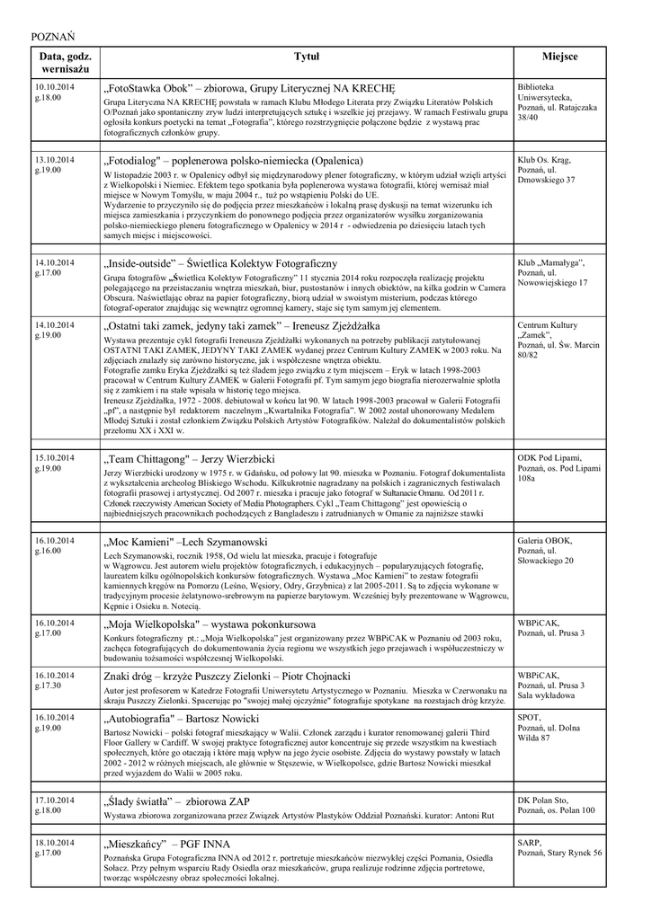 POZNAŃ Data, godz. wernisażu Tytuł 10.10.2014 g.18.00 „FotoStawka Obok” – zbiorowa, Grupy Literycznej NA KRECHĘ 13.10.2014 g.19.00 „Fotodialog" – poplenerowa polsko-niemiecka (Opalenica) 14.10.2014 g.17.00 „Inside-outside” – Świetlica Kolektyw Fotograficzny 14.10.2014 g.19.00 „Ostatni taki zamek, jedyny taki zamek” – Ireneusz Zjeżdżałka 15.10.2014 g.19.00 „Team Chittagong" – Jerzy Wierzbicki 16.10.2014 g.16.00 „Moc Kamieni" –Lech Szymanowski 16.10.2014 g.17.00 „Moja Wielkopolska" – wystawa pokonkursowa 16.10.2014 g.17.30 Znaki dróg – krzyże Puszczy Zielonki – Piotr Chojnacki 16.10.2014 g.19.00 „Autobiografia" – Bartosz Nowicki 17.10.2014 g.18.00 „Ślady światła” – zbiorowa ZAP 18.10.2014 g.17.00 „Mieszkańcy” – PGF INNA Grupa Literyczna NA KRECHĘ powstała w ramach Klubu Młodego Literata przy Związku Literatów Polskich O/Poznań jako spontaniczny zryw ludzi interpretujących sztukę i wszelkie jej przejawy. W ramach Festiwalu grupa ogłosiła konkurs poetycki na temat „Fotografia”, którego rozstrzygnięcie połączone będzie z wystawą prac fotograficznych członków grupy. W listopadzie 2003 r. w Opalenicy odbył się międzynarodowy plener fotograficzny, w którym udział wzięli artyści z Wielkopolski i Niemiec. Efektem tego spotkania była poplenerowa wystawa fotografii, której wernisaż miał miejsce w Nowym Tomyślu, w maju 2004 r., tuż po wstąpieniu Polski do UE. Wydarzenie to przyczyniło się do podjęcia przez mieszkańców i lokalną prasę dyskusji na temat wizerunku ich miejsca zamieszkania i przyczynkiem do ponownego podjęcia przez organizatorów wysiłku zorganizowania polsko-niemieckiego pleneru fotograficznego w Opalenicy w 2014 r - odwiedzenia po dziesięciu latach tych samych miejsc i miejscowości. Grupa fotografów „Świetlica Kolektyw Fotograficzny” 11 stycznia 2014 roku rozpoczęła realizację projektu polegającego na przeistaczaniu wnętrza mieszkań, biur, pustostanów i innych obiektów, na kilka godzin w Camera Obscura. Naświetlając obraz na papier fotograficzny, biorą udział w swoistym misterium, podczas którego fotograf-operator znajdując się wewnątrz ogromnej kamery, staje się tym samym jej elementem. Wystawa prezentuje cykl fotografii Ireneusza Zjeżdżałki wykonanych na potrzeby publikacji zatytułowanej OSTATNI TAKI ZAMEK, JEDYNY TAKI ZAMEK wydanej przez Centrum Kultury ZAMEK w 2003 roku. Na zdjęciach znalazły się zarówno historyczne, jak i współczesne wnętrza obiektu. Fotografie zamku Eryka Zjeżdzałki są też śladem jego związku z tym miejscem – Eryk w latach 1998-2003 pracował w Centrum Kultury ZAMEK w Galerii Fotografii pf. Tym samym jego biografia nierozerwalnie splotła się z zamkiem i na stałe wpisała w historię tego miejsca. Ireneusz Zjeżdżałka, 1972 - 2008. debiutował w końcu lat 90. W latach 1998-2003 pracował w Galerii Fotografii „pf”, a następnie był redaktorem naczelnym „Kwartalnika Fotografia”. W 2002 został uhonorowany Medalem Młodej Sztuki i został członkiem Związku Polskich Artystów Fotografików. Należał do dokumentalistów polskich przełomu XX i XXI w. Jerzy Wierzbicki urodzony w 1975 r. w Gdańsku, od połowy lat 90. mieszka w Poznaniu. Fotograf dokumentalista z wykształcenia archeolog Bliskiego Wschodu. Kilkukrotnie nagradzany na polskich i zagranicznych festiwalach fotografii prasowej i artystycznej. Od 2007 r. mieszka i pracuje jako fotograf w Sułtanacie Omanu. Od 2011 r. Członek rzeczywisty American Society of Media Photographers. Cykl „Team Chittagong” jest opowieścią o najbiedniejszych pracownikach pochodzących z Bangladeszu i zatrudnianych w Omanie za najniższe stawki Lech Szymanowski, rocznik 1958, Od wielu lat mieszka, pracuje i fotografuje w Wągrowcu. Jest autorem wielu projektów fotograficznych, i edukacyjnych – popularyzujących fotografię, laureatem kilku ogólnopolskich konkursów fotograficznych. Wystawa „Moc Kamieni” to zestaw fotografii kamiennych kręgów na Pomorzu (Leśno, Węsiory, Odry, Grzybnica) z lat 2005-2011. Są to zdjęcia wykonane w tradycyjnym procesie żelatynowo-srebrowym na papierze barytowym. Wcześniej były prezentowane w Wągrowcu, Kępnie i Osieku n. Notecią. Konkurs fotograficzny pt.: „Moja Wielkopolska” jest organizowany przez WBPiCAK w Poznaniu od 2003 roku, zachęca fotografujących do dokumentowania życia regionu we wszystkich jego przejawach i współuczestniczy w budowaniu tożsamości współczesnej Wielkopolski. Autor jest profesorem w Katedrze Fotografii Uniwersytetu Artystycznego w Poznaniu. Mieszka w Czerwonaku na skraju Puszczy Zielonki. Spacerując po "swojej małej ojczyźnie" fotografuje spotykane na rozstajach dróg krzyże. Bartosz Nowicki – polski fotograf mieszkający w Walii. Członek zarządu i kurator renomowanej galerii Third Floor Gallery w Cardiff. W swojej praktyce fotograficznej autor koncentruje się przede wszystkim na kwestiach społecznych, które go otaczają i które mają wpływ na jego życie osobiste. Zdjęcia do wystawy powstały w latach 2002 - 2012 w różnych miejscach, ale głównie w Stęszewie, w Wielkopolsce, gdzie Bartosz Nowicki mieszkał przed wyjazdem do Walii w 2005 roku. Wystawa zbiorowa zorganizowana przez Związek Artystów Plastyków Oddział Poznański. kurator: Antoni Rut Poznańska Grupa Fotograficzna INNA od 2012 r. portretuje mieszkańców niezwykłej części Poznania, Osiedla Sołacz. Przy pełnym wsparciu Rady Osiedla oraz mieszkańców, grupa realizuje rodzinne zdjęcia portretowe, tworząc współczesny obraz społeczności lokalnej. Miejsce Biblioteka Uniwersytecka, Poznań, ul. Ratajczaka 38/40 Klub Os. Krąg, Poznań, ul. Dmowskiego 37 Klub „Mamałyga”, Poznań, ul. Nowowiejskiego 17 Centrum Kultury „Zamek”, Poznań, ul. Św. Marcin 80/82 ODK Pod Lipami, Poznań, os. Pod Lipami 108a Galeria OBOK, Poznań, ul. Słowackiego 20 WBPiCAK, Poznań, ul. Prusa 3 WBPi