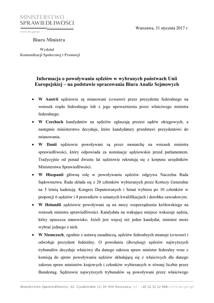 Warszawa, 31 stycznia 2017 r. Biuro Ministra Wydział Komunikacji Społecznej i Promocji Informacja o powoływaniu sędziów w wybranych państwach Unii Europejskiej – na podstawie opracowania Biura Analiz Sejmowych W Austrii sędziowie są mianowani (ernannt) przez prezydenta federalnego na wniosek rządu federalnego lub z jego upoważnienia przez właściwego ministra federalnego. W Czechach kandydatów na sędziów zgłaszają prezesi sądów okręgowych, a następnie ministerstwo decyduje, które kandydatury przedstawi prezydentowi do mianowania. W Danii sędziowie powoływani są przez monarchę na wniosek ministra sprawiedliwości, który odpowiada za nominacje sędziowskie przed parlamentem. Tradycyjnie od ponad dwustu lat sędziowie rekrutują się z korpusu urzędników Ministerstwa Sprawiedliwości. W Hiszpanii główną rolę w powoływaniu sędziów odgrywa Naczelna Rada Sądownictwa. Rada składa się z 20 członków wybieranych przez Kortezy Generalne na 5 letnią kadencję. Kongres Deputowanych i Senat wybiera po 10 członków w proporcji 6 sędziów i 4 prawników o uznanych kwalifikacjach i dorobku zawodowym. W Holandii sędziowie powoływani są na mocy rozporządzenia królewskiego na wniosek ministra sprawiedliwości. Kandydata na wakujące miejsce wskazuje sędzia, który opuszcza stanowisko. Jeżeli jest więcej niż jeden kandydat, minister może wybrać jednego z nich. W Niemczech, zgodnie z ustawą zasadniczą, sędziów federalnych mianuje (ernennt) i odwołuje prezydent federalny. O powołaniu (Berufung) sędziów najwyższych trybunałów decyduje właściwy dla danego zakresu spraw minister federalny wraz z komisją do spraw powoływania sędziów składającą się z właściwych dla danego zakresu spraw ministrów krajowych i członków wybieranych w równej liczbie przez Bundestag. Sędziowie najwyższych trybunałów są powoływani przez właściwego ministra federalnego wspólnie z komisją ds. powoływania sędziów i są mianowani przez prezydenta federalnego. W Szwecji sędziowie sądów powszechnych wszystkich szczebli powoływani są przez ministra sprawiedliwości na wniosek Rady ds. Nominacji Sędziów. Rada składa się z 9 członków i 9 zastępców członków, w tym: 5 sędziów i byłych sędziów powoływanych przez rząd (regeringen); 2 prawników spoza systemu sądownictwa (w tym jedna osoba wykonująca zawód adwokata) wybieranych przez organizacje wskazane przez rząd; 2 przedstawicieli społeczeństwa wybieranych przez parlament. We Włoszech główną rolę w powoływaniu sędziów odgrywają procedury konkursowe oraz Najwyższa Rada Sądownictwa, która jest kolegialnym organem zarządzającym systemem wymiaru sprawiedliwości. W skład Rady wchodzi Prezydent Republiki, Pierwszy Prezes Sądu Najwyższego, Prokurator Republiki i 24 członków, których wybiera ogół sędziów, prokuratorów oraz parlament. W opracowaniu wykorzystano obcojęzyczne akty prawne oraz informacje zamieszczone na stronach internetowych sądów, organizacji i stowarzyszeń sędziowskich, centralnych urzędów i instytucji związanych z kształceniem, powoływaniem i oceną kariery zawodowej sędziów w poszczególnych państwach Unii Europejskiej.