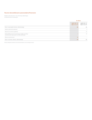Roczne skonsolidowane sprawozdanie finansowe Polityka rachunkowości i inne informacje objaśniające 8. Nieruchomości inwestycyjne Za okre s od 0 1 . 0 1 . 1 2 do 3 1 . 1 2 . 1 2 od 0 1 . 0 1 . 1 1 do 3 1 . 1 2 . 1 1 60 60 Nabycie jednostek zależnych - 2 Wycena do wartości godziwej - (1) Przekwalifikowanie do rzeczowego majątku trwałego nieruchomości używanych na własne potrzeby 1 (1) Zbycie nieruchomości (2) - Sta n n a k o n i ec o k res u o b ro to w eg o 59 60 Sta n n a p o czą tek o k res u o b ro to w eg o Kwoty w tabelach wyrażone są w milionach złotych, o ile nie podano inaczej