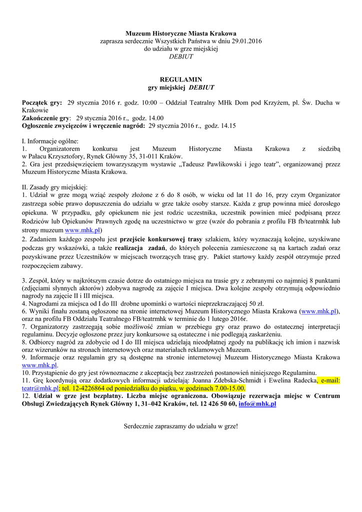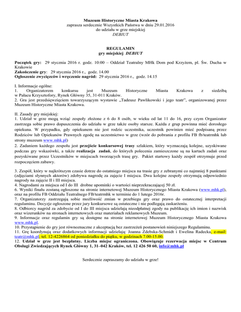Muzeum Historyczne Miasta Krakowa zaprasza serdecznie Wszystkich Państwa w dniu 29.01.2016 do udziału w grze miejskiej DEBIUT REGULAMIN gry miejskiej DEBIUT Początek gry: 29 stycznia 2016 r. godz. 10:00 – Oddział Teatralny MHk Dom pod Krzyżem, pl. Św. Ducha w Krakowie Zakończenie gry: 29 stycznia 2016 r., godz. 14.00 Ogłoszenie zwycięzców i wręczenie nagród: 29 stycznia 2016 r., godz. 14.15 I. Informacje ogólne: 1. Organizatorem konkursu jest Muzeum Historyczne Miasta Krakowa z siedzibą w Pałacu Krzysztofory, Rynek Główny 35, 31-011 Kraków. 2. Gra jest przedsięwzięciem towarzyszącym wystawie „Tadeusz Pawlikowski i jego teatr”, organizowanej przez Muzeum Historyczne Miasta Krakowa. II. Zasady gry miejskiej: 1. Udział w grze mogą wziąć zespoły złożone z 6 do 8 osób, w wieku od lat 11 do 16, przy czym Organizator zastrzega sobie prawo dopuszczenia do udziału w grze także osoby starsze. Każda z grup powinna mieć dorosłego opiekuna. W przypadku, gdy opiekunem nie jest rodzic uczestnika, uczestnik powinien mieć podpisaną przez Rodziców lub Opiekunów Prawnych zgodę na uczestnictwo w grze (wzór do pobrania z profilu FB fb/teatrmhk lub strony muzeum www.mhk.pl) 2. Zadaniem każdego zespołu jest przejście konkursowej trasy szlakiem, który wyznaczają kolejne, uzyskiwane podczas gry wskazówki, a także realizacja zadań, do których polecenia zamieszczone są na kartach zadań oraz pozyskiwane przez Uczestników w miejscach tworzących trasę gry. Pakiet startowy każdy zespół otrzymuje przed rozpoczęciem zabawy. 3. Zespół, który w najkrótszym czasie dotrze do ostatniego miejsca na trasie gry z zebranymi co najmniej 8 punktami (zdjęciami słynnych aktorów) zdobywa nagrodę za zajęcie I miejsca. Dwa kolejne zespoły otrzymują odpowiednio nagrody na zajęcie II i III miejsca. 4. Nagrodami za miejsca od I do III drobne upominki o wartości nieprzekraczającej 50 zł. 6. Wyniki finału zostaną ogłoszone na stronie internetowej Muzeum Historycznego Miasta Krakowa (www.mhk.pl), oraz na profilu FB Oddziału Teatralnego FB/teatrmhk w terminie do 1 lutego 2016r. 7. Organizatorzy zastrzegają sobie możliwość zmian w przebiegu gry oraz prawo do ostatecznej interpretacji regulaminu. Decyzje ogłoszone przez jury konkursowe są ostateczne i nie podlegają zaskarżeniu. 8. Odbiorcy nagród za zdobycie od I do III miejsca udzielają nieodpłatnej zgody na publikację ich imion i nazwisk oraz wizerunków na stronach internetowych oraz materiałach reklamowych Muzeum. 9. Informacje oraz regulamin gry są dostępne na stronie internetowej Muzeum Historycznego Miasta Krakowa www.mhk.pl. 10. Przystąpienie do gry jest równoznaczne z akceptacją bez zastrzeżeń postanowień niniejszego Regulaminu. 11. Grę koordynują oraz dodatkowych informacji udzielają: Joanna Zdebska-Schmidt i Ewelina Radecka, e-mail: [email protected]; tel. 12-4226864 od poniedziałku do piątku, w godzinach 7.00-15.00. 12. Udział w grze jest bezpłatny. Liczba miejsc ograniczona. Obowiązuje rezerwacja miejsc w Centrum Obsługi Zwiedzających Rynek Główny 1, 31–042 Kraków, tel. 12 426 50 60, [email protected] Serdecznie zapraszamy do udziału w grze!