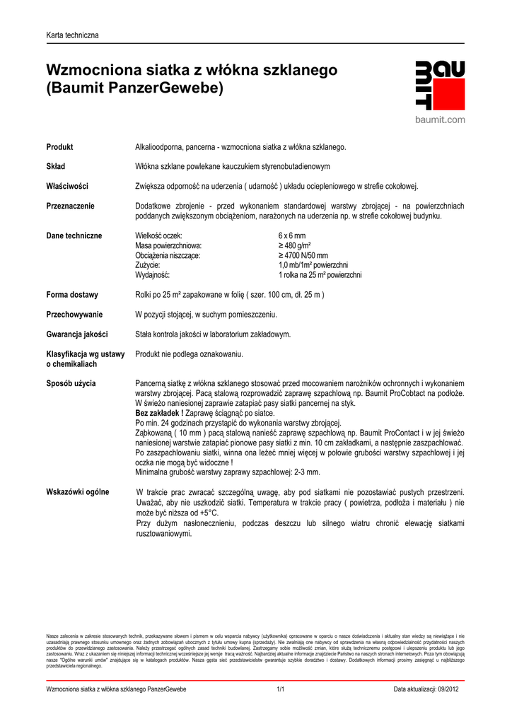 Karta techniczna Wzmocniona siatka z włókna szklanego (Baumit PanzerGewebe) Produkt Alkalioodporna, pancerna - wzmocniona siatka z włókna szklanego. Skład Włókna szklane powlekane kauczukiem styrenobutadienowym Właściwości Zwiększa odporność na uderzenia ( udarność ) układu ociepleniowego w strefie cokołowej. Przeznaczenie Dodatkowe zbrojenie - przed wykonaniem standardowej warstwy zbrojącej - na powierzchniach poddanych zwiększonym obciążeniom, narażonych na uderzenia np. w strefie cokołowej budynku. Dane techniczne Wielkość oczek: Masa powierzchniowa: Obciążenia niszczące: Zużycie: Wydajność: Forma dostawy Rolki po 25 m² zapakowane w folię ( szer. 100 cm, dł. 25 m ) Przechowywanie W pozycji stojącej, w suchym pomieszczeniu. Gwarancja jakości Stała kontrola jakości w laboratorium zakładowym. Klasyfikacja wg ustawy o chemikaliach Produkt nie podlega oznakowaniu. Sposób użycia Pancerną siatkę z włókna szklanego stosować przed mocowaniem narożników ochronnych i wykonaniem warstwy zbrojącej. Pacą stalową rozprowadzić zaprawę szpachlową np. Baumit ProCobtact na podłoże. W świeżo naniesionej zaprawie zatapiać pasy siatki pancernej na styk. Bez zakładek ! Zaprawę ściągnąć po siatce. Po min. 24 godzinach przystąpić do wykonania warstwy zbrojącej. Ząbkowaną ( 10 mm ) pacą stalową nanieść zaprawę szpachlową np. Baumit ProContact i w jej świeżo naniesionej warstwie zatapiać pionowe pasy siatki z min. 10 cm zakładkami, a następnie zaszpachlować. Po zaszpachlowaniu siatki, winna ona leżeć mniej więcej w połowie grubości warstwy szpachlowej i jej oczka nie mogą być widoczne ! Minimalna grubość warstwy zaprawy szpachlowej: 2-3 mm. Wskazówki ogólne W trakcie prac zwracać szczególną uwagę, aby pod siatkami nie pozostawiać pustych przestrzeni. Uważać, aby nie uszkodzić siatki. Temperatura w trakcie pracy ( powietrza, podłoża i materiału ) nie może być niższa od +5°C. Przy dużym nasłonecznieniu, podczas deszczu lub silnego wiatru chronić elewację siatkami rusztowaniowymi. 6 x 6 mm ≥ 480 g/m² ≥ 4700 N/50 mm 1,0 mb/1m² powierzchni 1 rolka na 25 m² powierzchni Nasze zalecenia w zakresie stosowanych technik, przekazywane słowem i pismem w celu wsparcia nabywcy (użytkownika) opracowane w oparciu o nasze doświadczenia i aktualny stan wiedzy są niewiążące i nie uzasadniają prawnego stosunku umownego oraz żadnych zobowiązań ubocznych z tytułu umowy kupna (sprzedaży). Nie zwalniają one nabywcy od sprawdzenia na własną odpowiedzialność przydatności naszych produktów do przewidzianego zastosowania. Należy przestrzegać ogólnych zasad techniki budowlanej. Zastrzegamy sobie możliwość zmian, które służą technicznemu postępowi i ulepszeniu produktu lub jego zastosowaniu. Wraz z ukazaniem się niniejszej informacji technicznej wcześniejsze jej wersje tracą ważność. Najbardziej aktualne informacje znajdziecie Państwo na naszych stronach internetowych. Poza tym obowiązują nasze "Ogólne warunki umów" znajdujące się w katalogach produktów. Nasza gęsta sieć przedstawicielstw gwarantuje szybkie doradztwo i dostawy. Dodatkowych informacji prosimy zasięgnąć u najbliższego przedstawiciela regionalnego. Wzmocniona siatka z włókna szklanego PanzerGewebe 1/1 Data aktualizacji: 09/2012