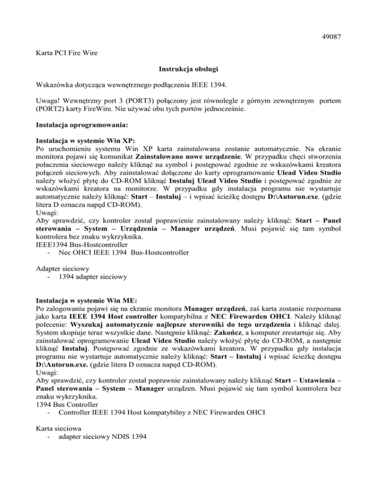 49087 Karta PCI Fire Wire Instrukcja obsługi Wskazówka