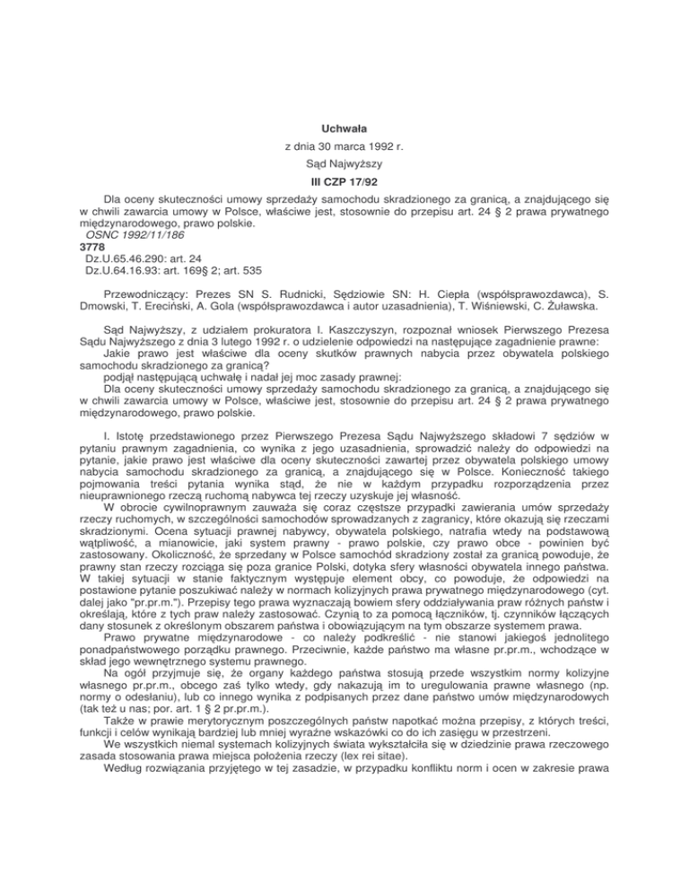 Dla oceny skuteczno ci umowy sprzeda y samochodu skradzionego za granic , a znajduj cego si