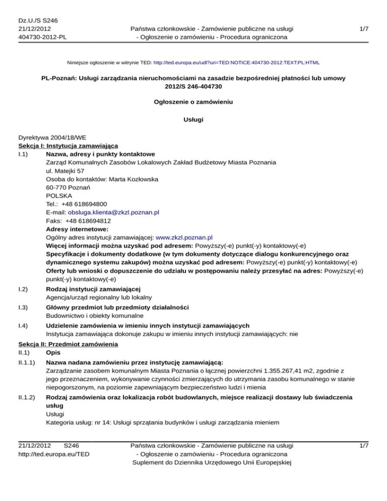 Dz.U./S S246 21/12/2012 404730-2012-PL Państwa członkowskie - Zamówienie publiczne na usługi - Ogłoszenie o zamówieniu - Procedura ograniczona 1/7 Niniejsze ogłoszenie w witrynie TED: http://ted.europa.eu/udl?uri=TED:NOTICE:404730-2012:TEXT:PL:HTML PL-Poznań: Usługi zarządzania nieruchomościami na zasadzie bezpośredniej płatności lub umowy 2012/S 246-404730 Ogłoszenie o zamówieniu Usługi Dyrektywa 2004/18/WE Sekcja I: Instytucja zamawiająca I.1) Nazwa, adresy i punkty kontaktowe Zarząd Komunalnych Zasobów Lokalowych Zakład Budżetowy Miasta Poznania ul. Matejki 57 Osoba do kontaktów: Marta Kozłowska 60-770 Poznań POLSKA Tel.: +48 618694800 E-mail: [email protected] Faks: +48 618694812 Adresy internetowe: Ogólny adres instytucji zamawiającej: www.zkzl.poznan.pl Więcej informacji można uzyskać pod adresem: Powyższy(-e) punkt(-y) kontaktowy(-e) Specyfikacje i dokumenty dodatkowe (w tym dokumenty dotyczące dialogu konkurencyjnego oraz dynamicznego systemu zakupów) można uzyskać pod adresem: Powyższy(-e) punkt(-y) kontaktowy(-e) Oferty lub wnioski o dopuszczenie do udziału w postępowaniu należy przesyłać na adres: Powyższy(-e) punkt(-y) kontaktowy(-e) I.2) Rodzaj instytucji zamawiającej Agencja/urząd regionalny lub lokalny I.3) Główny przedmiot lub przedmioty działalności Budownictwo i obiekty komunalne I.4) Udzielenie zamówienia w imieniu innych instytucji zamawiających Instytucja zamawiająca dokonuje zakupu w imieniu innych instytucji zamawiających: nie Sekcja II: Przedmiot zamówienia II.1) Opis II.1.1) Nazwa nadana zamówieniu przez instytucję zamawiającą: Zarządzanie zasobem komunalnym Miasta Poznania o łącznej powierzchni 1.355.267,41 m2, zgodnie z jego przeznaczeniem, wykonywanie czynności zmierzających do utrzymania zasobu komunalnego w stanie niepogorszonym, na poziomie zapewniającym bezpieczeństwo ludzi i mienia II.1.2) Rodzaj zamówienia oraz lokalizacja robót budowlanych, miejsce realizacji dostawy lub świadczenia usług Usługi Kategoria usług: nr 14: Usługi sprzątania budynków i usługi zarządzania mieniem 21/12/2012 S246 http://ted.europa.eu/TED Państwa członkowskie - Zamówienie publiczne na usługi - Ogłoszenie o zamówieniu - Procedura ograniczona Suplement do Dziennika Urzędowego Unii Europejskiej 1/7 Dz.U./S S246 21/12/2012 404730-2012-PL Państwa członkowskie - Zamówienie publiczne na usługi - Ogłoszenie o zamówieniu - Procedura ograniczona 2/7 Główne miejsce lub lokalizacja robót budowlanych, miejsce realizacji dostawy lub świadczenia usług: Miasto Poznań Kod NUTS II.1.3) Informacje na temat zamówienia publicznego, umowy ramowej lub dynamicznego systemu zakupów (DSZ) Ogłoszenie dotyczy zamówienia publicznego II.1.4) Informacje na temat umowy ramowej II.1.5) Krótki opis zamówienia lub zakupu Zarządzanie zasobem komunalnym Miasta Poznania o łącznej powierzchni 1.355.267,41 m2, zgodnie z jego przeznaczeniem, wykonywanie czynności zmierzających do utrzymania zasobu komunalnego w stanie niepogorszonym, na poziomie zapewniającym bezpieczeństwo ludzi i mienia. Pod pojęciem Zarządzania zasobem komunalnym uważa się podejmowanie decyzji i dokonywanie czynności mających na celu w szczególności: zapewnienie właściwej gospodarki ekonomiczno – finansowej nieruchomości, zapewnienie bezpieczeństwa użytkowania, właściwej eksploatacji nieruchomości i obsługi technicznej, zapewnienie właściwej gospodarki energetycznej w rozumieniu przepisów Prawa energetycznego, bieżące administrowanie nieruchomością jak również czynności zmierzające do utrzymania nieruchomości w stanie niepogorszonym, zgodnie z ich przeznaczeniem, w zakresie uprawnień i obowiązków wynikających z przepisów Ustawy z dnia 21 sierpnia 1997r. o gospodarce nieruchomościami (tekst jednolity Dz. U. 2010r. Nr 102, poz. 651, z późn. zm.), odrębnych przepisów, w tym przepisów prawa miejscowego, z uwzględnieniem obowiązku uzyskania odrębnych pełnomocnictw do dokonywania czynności przekraczających zwykły zarząd powierzonym zasobem komunalnym. Ponadto w zakres zarządzania zasobem komunalnym Miasta Poznania wchodzi wykonywanie czynności pogotowia technicznego czyli prowadzenia niezbędnych prac zabezpieczających istniejące instalacje i urządzenia techniczne oraz podejmowanie wszelkich koniecznych działań zmierzających do zahamowania występowania bezpośrednich następstw awarii i ich usunięcia, w szczególności czynności polegających na: drobnych naprawach (naprawach bieżących) niezbędnych do utrzymania obiektu budowlanego i jego otoczenia w należytym stanie technicznym, obejmujących likwidację przyczyn i skutków uszkodzeń mogących spowodować przedwczesne niszczenie obiektu lub jego elementów i urządzeń oraz obejmujących zapobieganie powstania uszkodzeń mogących spowodować przedwczesne zniszczenie lub zużycie jego elementów i urządzeń. W skład zasobu komunalnego, którego dotyczy niniejsze postępowanie wchodzą: a) lokale mieszkalne i użytkowe w budynkach komunalnych, w których przeważa funkcja mieszkalna: 340.970,52 m2, b) lokale mieszkalne i użytkowe w budynkach wspólnot mieszkaniowych, w których przeważa funkcja mieszkalna: 413.297,41 m2, c) lokale mieszkalne i użytkowe w budynkach komunalnych, w których przeważa funkcja użytkowa: 183.523,97 m2, d) lokale mieszkalne i użytkowe w budynkach wspólnot mieszkaniowych, w których przeważa funkcja użytkowa: 42.735,70 m2, e) lokale w budynkach NZOZ, w których przeważa funkcja użytkowa: 38.054,40 m2, f) lokale mieszkalne z Samodzielnym Własnościowym Prawem do Lokalu: 2.142,13 m2, g) lokale mieszkalne wynajmowane przez Zamawiającego od osób trzecich: 1.007,91 m2, h) garaże wolnostojące: 1.547,75 m2, i) forty, budowle ochronne, schrony fortyfikacyjne, ukrycia przeciwlotnicze.: 38.188,48 m2, j) tereny użytkowe przeznaczone na najem, m.in. place, parkingi: 45.875,62 m2, 21/12/2012 S246 http://