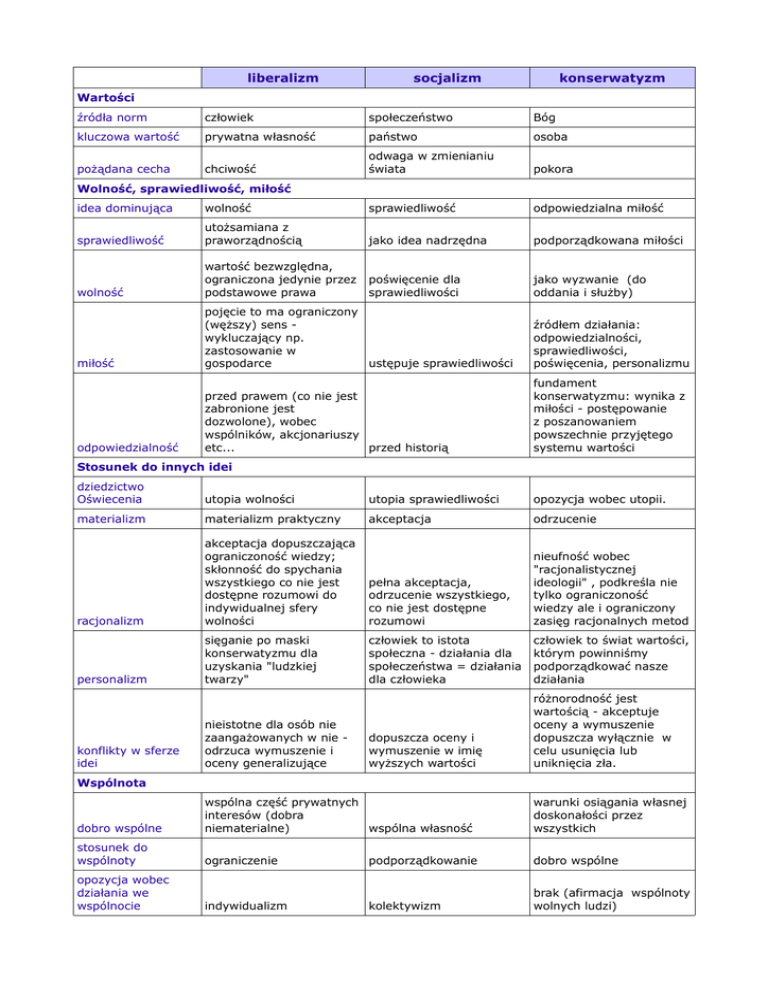 liberalizm socjalizm konserwatyzm Wartości źródła norm człowiek społeczeństwo Bóg kluczowa wartość prywatna własność państwo osoba pożądana cecha chciwość odwaga w zmienianiu świata pokora Wolność, sprawiedliwość, miłość idea dominująca wolność sprawiedliwość odpowiedzialna miłość sprawiedliwość utożsamiana z praworządnością jako idea nadrzędna podporządkowana miłości wolność wartość bezwzględna, ograniczona jedynie przez podstawowe prawa poświęcenie dla sprawiedliwości jako wyzwanie (do oddania i służby) miłość pojęcie to ma ograniczony (węższy) sens wykluczający np. zastosowanie w gospodarce ustępuje sprawiedliwości źródłem działania: odpowiedzialności, sprawiedliwości, poświęcenia, personalizmu odpowiedzialność przed prawem (co nie jest zabronione jest dozwolone), wobec wspólników, akcjonariuszy etc... przed historią fundament konserwatyzmu: wynika z miłości - postępowanie z poszanowaniem powszechnie przyjętego systemu wartości Stosunek do innych idei dziedzictwo Oświecenia utopia wolności utopia sprawiedliwości opozycja wobec utopii. materializm materializm praktyczny akceptacja odrzucenie racjonalizm akceptacja dopuszczająca ograniczoność wiedzy; skłonność do spychania wszystkiego co nie jest dostępne rozumowi do indywidualnej sfery wolności pełna akceptacja, odrzucenie wszystkiego, co nie jest dostępne rozumowi nieufność wobec "racjonalistycznej ideologii" , podkreśla nie tylko ograniczoność wiedzy ale i ograniczony zasięg racjonalnych metod personalizm sięganie po maski konserwatyzmu dla uzyskania "ludzkiej twarzy" człowiek to istota społeczna - działania dla społeczeństwa = działania dla człowieka człowiek to świat wartości, którym powinniśmy podporządkować nasze działania dopuszcza oceny i wymuszenie w imię wyższych wartości różnorodność jest wartością - akceptuje oceny a wymuszenie dopuszcza wyłącznie w celu usunięcia lub uniknięcia zła. konflikty w sferze idei nieistotne dla osób nie zaangażowanych w nie odrzuca wymuszenie i oceny generalizujące Wspólnota dobro wspólne wspólna część prywatnych interesów (dobra niematerialne) wspólna własność warunki osiągania własnej doskonałości przez wszystkich stosunek do wspólnoty ograniczenie podporządkowanie dobro wspólne opozycja wobec działania we wspólnocie indywidualizm kolektywizm brak (afirmacja wspólnoty wolnych ludzi) podstawowe komponenty człowiek społeczeństwo rodzina naród struktura postała w wyniku wolności wyboru przeżytek wspólnota Społeczeństwo optymalny model rozwoju konkurencja rewolucja ewolucja struktury organizacyjne tworzone przez "najbardziej zaradnych" wedle swych potrzeb projektowane przez "siłę przewodnią" powstają na zasadzie ewolucji - na miarę potrzeb społeczeństwa cele organizacji uzyskanie przewagi konkurencyjnej (optymalne warunki rozwoju organizacji) wymuszenie (podporządkowanie ideologii) optymalne warunki rozwoju osób sprawiedliwość społeczna nie istnieje akceptacja jako akceptacja wymagająca przesłanka dla innych zadekretowania i działania działań (nie jest celem dla jej realizacji samym w sobie) problem ubóstwa problem sumienia poszczególnych obywateli przekonania akceptacji sytuacji, w której w przestrzeni publicznej ścierają się przekonania to sprawa przymus bezkonfliktowego różne idee, przy gotowości prywatna - konflikty nie są istnienia w przestrzeni obrony własnych ważne (należy ich unikać) publicznej różnych idei przekonań religia sprawa prywatna symbolika religijna w sferze publicznej wolność = dowolność (decyduje właściciel) tolerancja pobłażliwość dla wszystkiego co nam nie zagraża problem dla państwa problem społeczny odrzucenie akceptacja odrzuca ludzie wierzący otwarci na "mądrość Bożą" przy pomocy symboli wyrażają swoje poglądy dotyczące społeczeństwa (a nie religii lub wiary) używana jako narzędzie "inżynierii społecznej" akceptacja odmiennych poglądów, o ile nie stwarza to sytuacji konfliktu sumienia prywatność poszanowanie - kluczowe znaczenie niejasne granice prywatności sprawy intymne nie powinny być przedmiotem działań podejmowanych w przestrzeni publicznej regulacje ograniczające prawo prawo i ideologia prawo naturalne i religia solidarność nie istotna wymuszona w imię dobra wspólnego sprawa prywatna powszechne szkolnictwo ogólne wychowanie do odpowiedzialnego korzystania z wolności prywatny mecenat państwowy mecenat państwowy mecenat ograniczony do roli wychowawczej jak przedsiębiorstwo aparat ucisku manifestacja wspólnych celów pedagogika kultura Państwo państwo wspólne dobro, tworzenie ładu w którym obywatele mogą współuczestniczyć w zgodzie z własnymi przekonaniami najważniejszy cel państwa sprzyjające warunki indywidualnego rozwoju, ochrona prywatnych interesów regulator sprawiedliwości suwerenność państwa państwo jak przedsiębiorstwo - może zbankrutować ustępstwo internacjonalizmu na rzecz nacjonalizmów wartość niezbywalna państwo a wolność tylko strzeże przed zagrożeniem wolności także ogranicza wolność w przestrzeń przeżywania imię sprawiedliwości wolności we wspólnocie odrzucenie, gdyż prowadzi państwo opiekuńcze do patologii akceptacja akceptacja z uwzględnieniem zasady pomocniczości zasada pomocniczości akceptuje jako ustępstwo akceptuje instytucje państwowe zbędne - poza wojskiem, wymiarem sprawiedliwości i siłami umożliwiającymi obejmują wszystkie sfery wymuszenie (policja) życia potrzebne, jeśli wymaga tego funkcjonowanie i rozwój społeczeństwa (kształtują się w sposób ewolucyjny) władze wynajęte przez społeczeństwo wybrańcy ludu służba społeczeństwu prawo stanowione minimum konieczne do sprawnego funkcjonowania umowa społeczna budowane w oparciu o zasady tyki transparentność ograniczona do instytucji państwowych (które powinny być prywatyzowane je