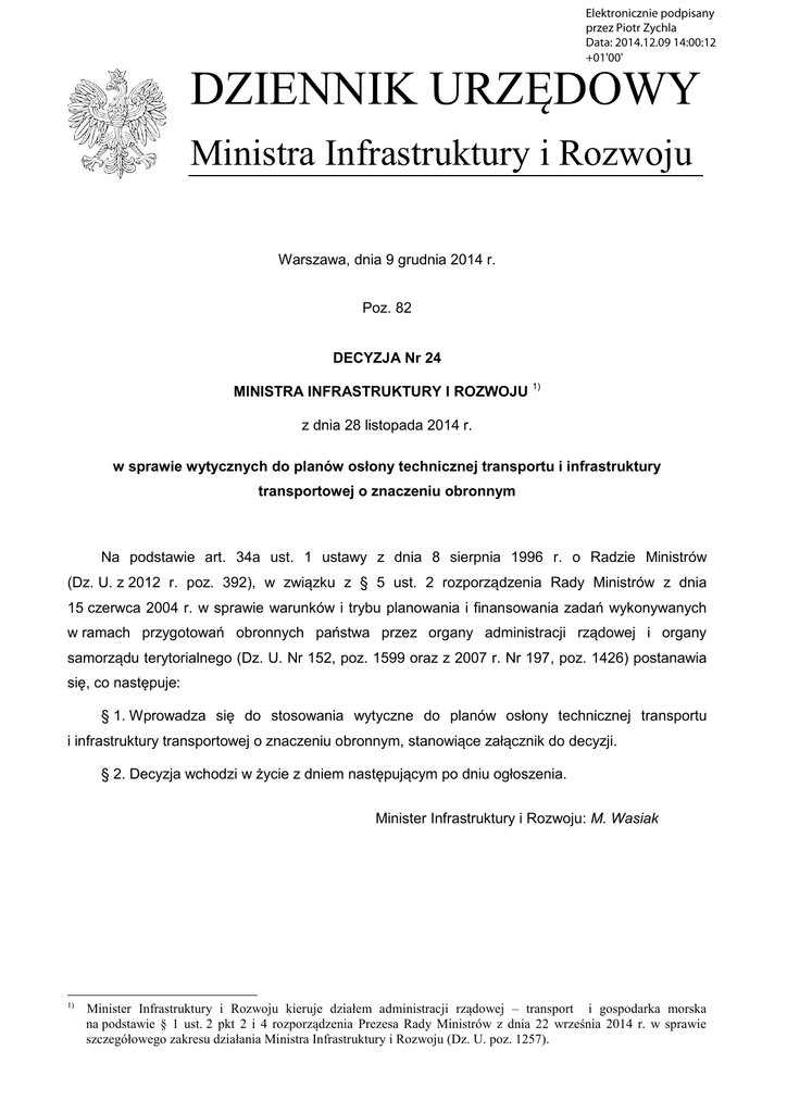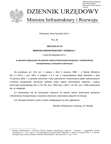 Elektronicznie podpisany przez Piotr Zychla Data: 2014.12.09 14:00:12 +01'00' DZIENNIK URZĘDOWY Ministra Infrastruktury i Rozwoju Warszawa, dnia 9 grudnia 2014 r. Poz. 82 DECYZJA Nr 24 MINISTRA INFRASTRUKTURY I ROZWOJU 1) z dnia 28 listopada 2014 r. w sprawie wytycznych do planów osłony technicznej transportu i infrastruktury transportowej o znaczeniu obronnym Na podstawie art. 34a ust. 1 ustawy z dnia 8 sierpnia 1996 r. o Radzie Ministrów (Dz. U. z 2012 r. poz. 392), w związku z § 5 ust. 2 rozporządzenia Rady Ministrów z dnia 15 czerwca 2004 r. w sprawie warunków i trybu planowania i finansowania zadań wykonywanych w ramach przygotowań obronnych państwa przez organy administracji rządowej i organy samorządu terytorialnego (Dz. U. Nr 152, poz. 1599 oraz z 2007 r. Nr 197, poz. 1426) postanawia się, co następuje: § 1. Wprowadza się do stosowania wytyczne do planów osłony technicznej transportu i infrastruktury transportowej o znaczeniu obronnym, stanowiące załącznik do decyzji. § 2. Decyzja wchodzi w życie z dniem następującym po dniu ogłoszenia. Minister Infrastruktury i Rozwoju: M. Wasiak 1) Minister Infrastruktury i Rozwoju kieruje działem administracji rządowej – transport i gospodarka morska na podstawie § 1 ust. 2 pkt 2 i 4 rozporządzenia Prezesa Rady Ministrów z dnia 22 września 2014 r. w sprawie szczegółowego zakresu działania Ministra Infrastruktury i Rozwoju (Dz. U. poz. 1257). Dziennik Urzędowy Ministra Infrastruktury i Rozwoju –2– Poz. 82 Załącznik do decyzji nr 24 Ministra Infrastruktury i Rozwoju z dnia 28 listopada 2014 r. (poz. 82) WYTYCZNE do planów osłony technicznej transportu i infrastruktury transportowej o znaczeniu obronnym § 1. Wytyczne określają: 1) organy administracji rządowej oraz jednostki organizacyjne podległe lub nadzorowane przez Ministra Infrastruktury i Rozwoju, zobowiązane do sporządzenia planów osłony technicznej transportu i infrastruktury transportowej; 2) szczegółowy zakres przedmiotowy planów oraz formę ich opracowania; 3) tryb zatwierdzania, uaktualniania oraz koordynacji działań przy sporządzaniu planów. § 2. Ilekroć w wytycznych jest mowa o: 1) osłonie technicznej – należy przez to rozumieć osłonę techniczną infrastruktury transportowej, o której mowa w rozporządzeniu Rady Ministrów z dnia 3 lutego 2004 r. w sprawie warunków i sposobu przygotowania i wykorzystania transportu na potrzeby obronne państwa, a także jego ochrony w czasie wojny, oraz właściwości organów w tych sprawach (Dz. U. Nr 34, poz. 294), zwanym dalej „rozporządzeniem RM z dnia 3 lutego 2004 r.”; 2) planie – należy przez to rozumieć plan osłony technicznej, o którym mowa w rozporządzeniu RM z dnia 3 lutego 2004 r.; 3) organach – należy przez to rozumieć organy administracji rządowej podległe lub nadzorowane przez Ministra Infrastruktury i Rozwoju: a) Generalny Dyrektor Dróg Krajowych i Autostrad, b) Prezes Urzędu Lotnictwa Cywilnego, c) Dyrektor Urzędu Morskiego w Szczecinie, d) Dyrektor Urzędu Morskiego w Słupsku, e) Dyrektor Urzędu Morskiego w Gdyni; 4) jednostkach – należy przez to rozumieć jednostki organizacyjne lub bazy formowania, będące przedsiębiorcami przewidzianymi do objęcia militaryzacją, ujętymi w resortowym zestawieniu zadań lub przedsiębiorcami o szczególnym znaczeniu gospodarczo-obronnym ujętymi w wykazie określonym na podstawie przepisów art. 6 ustawy z dnia 23 sierpnia 2001 r. o organizowaniu zadań na rzecz obronności państwa realizowanych przez przedsiębiorców (Dz. U. Nr 122, poz. 1320 oraz z 2002 r. Nr 188, poz. 1571), w odniesieniu do których organem organizującym i nadzorującym wykonywanie zadań na rzecz obronności państwa jest minister właściwy do spraw transportu lub minister właściwy do spraw gospodarki morskiej. Dziennik Urzędowy Ministra Infrastruktury i Rozwoju –3– Poz. 82 § 3. 1. Dyrektor Biura Zarządzania Kryzysowego i Ochrony Informacji Niejawnych Ministerstwa Infrastruktury i Rozwoju, zwany dalej „Dyrektorem BZK”, sporządza „Plan osłony technicznej działów administracji rządowej – transport i gospodarka morska”. 2. Generalny Dyrektor Dróg Krajowych i Autostrad sporządza „Plan osłony technicznej dróg o znaczeniu obronnym”. 3. Prezes Urzędu Lotnictwa Cywilnego sporządza „Plan osłony technicznej w obszarze lotnictwa cywilnego”. 4. Właściwy terytorialnie dyrektor urzędu morskiego sporządza według swoich właściwości „Plan osłony technicznej infrastruktury portowej i transportu morskiego”. 5. Jednostki bezpośrednio realizujące zadania osłony technicznej biorą udział w opracowywaniu planów, na zasadach określonych przez organy, o których mowa w ust. 2-4. 6. Plany zatwierdza Minister Infrastruktury i Rozwoju. 7. Organy, o których mowa w ust. 2-4, sporządzają dla jednostek wypisy z planów w zakresie ich zadań i obszaru działania. 8. Plany sporządza się zgodnie z odrębnymi przepisami w zakresie przygotowania obronnego transportu i infrastruktury transportowej 1). 9. Plany oraz wyciągi z planów podlegają ochronie na podstawie obowiązujących przepisów w zakresie ochrony informacji niejawnych 2). § 4. 1. Plan składa się z części opisowej i graficznej. 2. Część opisowa planu, według właściwości organu sporządzającego, zawiera: 1) ocenę zagrożeń militarnych i niemilitarnych w obszarze transportu i infrastruktury transportowej; 2) charakterystykę transportu i infrastruktury transportowej podlegających osłonie technicznej, w tym charakterystykę: a) dostępnych środków transportowych, b) tras żeglugowych, c) techniczno-eksploatacyjną portów rzecznych, morskich i lotniczych, d) morskich, lotniczych i drogowych przejść granicznych oraz wytypowanych parkingów drogowych, e) wytypowanych centralnych dróg samochodowych (CDS), drogowych odcinków lotniskowych (DOL), dojazdów i dróg w tymczasowych rejonach przeładunkowych, dróg do