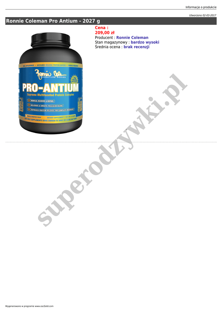 Informacje o produkcie Utworzono 02-03-2017 Ronnie Coleman Pro Antium - 2027 g Cena : 209,00 zł ro dz y w ki .p l Producent : Ronnie Coleman Stan magazynowy : bardzo wysoki Średnia ocena : brak recenzji su pe Kluczowym składnikiem w diecie każdego kulturysty są proteiny. Ronnie Coleman mając ponad 20 letnie doświadczenie na zawodach rangi mistrzowskiej, zdobywając 8 razy tytuł Mr. Olimpia posiada szeroką wiedzę na temat suplementacji białkowej. 29 gram białka na porcje 5 g kreatyny na porcje 2,5 g betainy na porcje mieszanka protein o różnych stopniu wchłaniania świetny smak Pro Antium został stworzony w jednym celu: aby dostarczyć organizmowi proteiny o najwyższej jakości. Na jedną miarkę suplementu przypada aż 29 g protein. Taka ilość wysoce jakościowego białka w jednej miarce to więcej niż mogą zaoferować inne produkty białkowe. Ronnie Coleman stworzył tą ponadprzeciętną odżywkę, bo jest ponadprzeciętnym kulturystą. Kulturyści, a także inne sportowcy uprawiający dyscpliny siłowe potrzebują dużą ilości białka, których organizm potrzebuje, aby ich efekty Wygenerowano w programie www.oscGold.com treningowe były jak najlepsze. Pro Antium został właśnie stworzony dla tych sportowców. Również Państwo możecie skorzystać z odżywki, która jest wykorzystywana przez najlepszych kulturystów. SIEDEM FRAKCJI BIAŁKA W TYM HYTDROLIZAT BIAŁKA SERWATKI DOSKONAŁY O KAŻDEJ PORZE DNIA I PO TRENINGU .p l DODATEK GLICYNY, BCAA, 2,5g BETAINY I 5g MONOHYDRATU KREATYNY ZAWIERA KOMPLEKS ZDROWYCH TŁUSZCZY: MCT, OLEJ SŁONECZNIKOWY I SOJOWY Z DODATKIEM PRAWDZIWYCH KAWAŁKÓW CIASTEK I TYLKO 1g CUKRU ki DOSKONAŁY SMAK I ROZPUSZCZALNOŚĆ ro dz y w BEZ ASPARTAMU W składzie Pro Antium znajdzemy: su pe Hydrolizat Białek Serwatkowych - białko poddane procesowi wstępnego trawienia enzymatycznego. Dzięki temu wchłania się prawie natychmiastowo, dostarczając organizmowi niezbędnych związków budulcowych (aminokwasów). Albumina Jaj - powszechnie uważana za białko wzorcowe - zawiera profil aminokwasowy najbardziej odpowiadający naszemu organizmowi pod względem wykorzystania do budowy tkanki mięśniowej (wartość biologiczna BV=100). Koncentrat Białka Serwatkowego - bardzo łatwo przyswajalny - wchłania się z przewodu pokarmowego w zaledwie kilkanaście minut, posiada szeroki profil aminokwasów, wysoką wartość biologiczna BV=104, bogaty w alfa-laktoalbuminy - obniżające stres, zapobiegające nowotworom i schorzeniom kardiologicznym, laktoferyne czyli doskonale przyswajalne żelazo oraz laktoperoksydaze, pogromcę bakterii. Izolat Białka Serwatki - czas wchłaniania rzędu kilku minut, najwyższa wartość Informacje o produkcie biologiczna BV=159, idealny kiedy potrzebujemy praktycznie natychmiastowej dostawy aminokwasów dla naszego organizmu. Sposób w jaki otrzymywany jest ten koncentrat (wymiana jonowa) gwarantuje minimalną zawartość innych makroskładników - tłuszczy i węglowodanów. .p l Izolat Białek Mleka - wszystko to co najlepsze w mleku bez zbędnej laktozy, cholesterolu i nasyconych kwasów tłuszczowych. Zawiera sprzężony kwas linolenowy (CLA), peptydy glutaminy czy tez laktoferynę (najlepiej przyswajalne żelazo, wykazuje silne właściwości bakteriobójcze). w ki Kazeina Micelarna - podobnie jak białko serwatkowe, tak i kazeina otrzymywana jest z mleka. Podobnie jak Kazeinian Wapnia charakteryzuje się najbardziej równomiernym uwalnianiem aminokwasów do krwioobiegu spośród wszystkich źródeł białka. ro dz y Kazeinian Wapnia - charakteryzuje się najbardziej równomiernym uwalnianiem aminokwasów do krwioobiegu spośród wszystkich źródeł białka, tym samym najlepiej sprawdza się podczas długich przerw pomiędzy posiłkami. pe Olej MCT - kompleks kwasów tłuszczowych o średniej długości łańcucha. Doskonałe i łatwo przystępne źródło energii, nie ulega magazynowaniu w postaci tkanki tłuszczowej, stymuluje wydzielanie m.in.: hormonu wzrostu i insuliny, wykazuje właściwości anaboliczne i antykataboliczne. su Olej słonecznikowy - doskonałe źródło ALA - kwasu Alfa-Liponowego. Zwiększa wrażliwość komórek na Insulinę, reguluje poziom cukru we krwi, wpływa na wychwyt glukozy oraz ilość dostarczanego tlenu, stymuluje produkcje tlenku azotu (rozszerza naczynia krwionośne a tym samym poprawia krążenie krwi), zapobiega schorzeniom wzroku (duże stężenie ALA możemy znaleźć właśnie w oku), wykazuje silną aktywność antyoksydacyjną, pozytywnie działa na koncentracje i odporność na stres. L-Leucyna - wpływa na syntezę mięśni szkieletowych na kilka sposobów: zwiększa wydzielanie insuliny, potężnego anabolika obecnego w naszym ciele, wpływa na aktywność kinazy proteinowej S6, przyspiesza fosforylację białka wiążącego eIf4E oraz wpływa na stopień powiązania pomiędzy białkami (eIF)4E i eIF4G. Wszystko to, pomimo skomplikowanego brzmienia i nazewnictwa, sprowadza się do bardzo prostego twierdzenia ? Leucyna zwiększa stopień, i szybkość, wykorzystania białek do budowy Wygenerowano w programie www.oscGold.com mięśni. .p l L-Izoleucyna - dostarczanie dużych ilości Leucyny powoduje obniżenie poziomu pozostałych dwóch aminokwasów: Izoleucyny i Waliny, dlatego tak ważne jest aby stosować wszystkie trzy związki razem. Dodatkowo Izoleucyna jest zaliczana do aminokwasów glukogennych, czyli takich, które organizm w łatwy i szybki sposób może przekształcić w niezbędną mu do funkcjonowania energię. Oznacza to, że będziemy mogli nie tylko trenować dłużej i intensywniej, ale też szybciej się regenerować. ro dz y w ki L-Walina - swoją obecność w tym zestawieniu, zawdzięcza nie tylko, wspomnianej wcześniej, potrzebie podawania wszystkich trzech aminokwasów BCAA razem ale również wpływowi na ograniczenie zmęczenia centralnego układu nerwowego. Dodatkowo, jak w przypadku pozostałych dwóch aminokwasów, jest łatwo prz