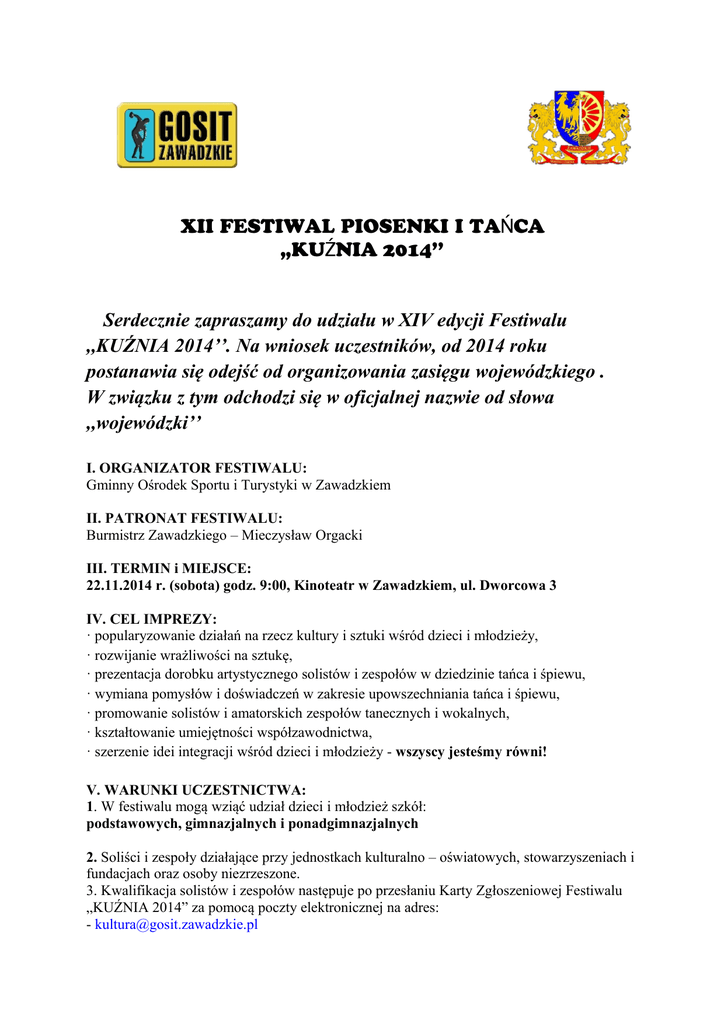 XII FESTIWAL PIOSENKI I TAŃCA „KUŹNIA 2014’’ Serdecznie zapraszamy do udziału w XIV edycji Festiwalu ,,KUŹNIA 2014’’. Na wniosek uczestników, od 2014 roku postanawia się odejść od organizowania zasięgu wojewódzkiego . W związku z tym odchodzi się w oficjalnej nazwie od słowa ,,wojewódzki’’ I. ORGANIZATOR FESTIWALU: Gminny Ośrodek Sportu i Turystyki w Zawadzkiem II. PATRONAT FESTIWALU: Burmistrz Zawadzkiego – Mieczysław Orgacki III. TERMIN i MIEJSCE: 22.11.2014 r. (sobota) godz. 9:00, Kinoteatr w Zawadzkiem, ul. Dworcowa 3 IV. CEL IMPREZY: · popularyzowanie działań na rzecz kultury i sztuki wśród dzieci i młodzieży, · rozwijanie wrażliwości na sztukę, · prezentacja dorobku artystycznego solistów i zespołów w dziedzinie tańca i śpiewu, · wymiana pomysłów i doświadczeń w zakresie upowszechniania tańca i śpiewu, · promowanie solistów i amatorskich zespołów tanecznych i wokalnych, · kształtowanie umiejętności współzawodnictwa, · szerzenie idei integracji wśród dzieci i młodzieży - wszyscy jesteśmy równi! V. WARUNKI UCZESTNICTWA: 1. W festiwalu mogą wziąć udział dzieci i młodzież szkół: podstawowych, gimnazjalnych i ponadgimnazjalnych 2. Soliści i zespoły działające przy jednostkach kulturalno – oświatowych, stowarzyszeniach i fundacjach oraz osoby niezrzeszone. 3. Kwalifikacja solistów i zespołów następuje po przesłaniu Karty Zgłoszeniowej Festiwalu „KUŹNIA 2014” za pomocą poczty elektronicznej na adres: - [email protected] lub listownie na adres: Gminny Ośrodek Sportu i Turystyki, 47-120 Zawadzkie, ul. Opolska 23 VI. PATRONAT MEDIALNY · Krajobrazy Zawadzkiego · NTO ·Strzelec Opolski · Radio DOXA VII.KOMITET ORGANIZACYJNY: Mateusz Ochlust - Dyrektor Gosit Zawadzkie Monika Skibińska - Kierownik Domu Kultury Małgorzata Rabicka - Dyrektor PSP Zawadzkie, instruktor tańca nowoczesnego REGULAMIN FESTIWALU 1. Dzieci i młodzież zgłaszane są w odpowiednich dla siebie grupach wiekowych w kategoriach: a) taniec - zespół -mini formacja ( do 7 os.) - duo/trio - solo b) śpiew - zespół - duet - solo 2. Zgłaszającym winna być instytucja kultury, placówka szkolna, stowarzyszenie/fundacja lub osoba prywatna 3. Koszty dojazdu i wyżywienia ponoszą instytucje delegujące. 4. Uczestnicy powinni nadesłać zgłoszenie do dnia 14.11.2014 r. na adres e-mail: [email protected] lub Gminny Ośrodek Sportu i Turystyki 47-120 Zawadzkie, ul. Opolska 23 Po tym terminie zgłoszenia nie będą brane pod uwagę. 5. W przypadku dużej ilości chętnych w placówkach macierzystych proponowane są wstępne eliminacje. 6. Ogłoszenie wyników oraz koncert laureatów nastąpi w galowej części Festiwalu - godzina zakończenia zależy od ilości zgłoszeń. 7. Brak uczestnictwa wykonawcy w koncercie galowym pozbawia ewentualnej nagrody. 8. Wszelkie sprawy nie ujęte w regulaminie rozstrzyga Organizator. GŁÓWNE ZASADY KONKURSOWE I.KONKURENCJE TANECZNE: 1. Wykonawcy prezentują jeden układ w wybranej przez siebie kategorii tanecznej: · widowisko taneczne – oparty na różnych technikach tanecznych (układ do 5 minut) · miniatura taneczna – oparty na technikach tańca nowoczesnego (układ do 4 minut) · Inne formy taneczne: technika tańca współczesnego, jazzowego, towarzyskiego ( układ do 3 min.) ·taniec ludowy- ( układ do 3 min.) ·taniec mażoretkowy – ( układ do 3 min ) 2. Przekroczenie regulaminowego czasu występu, określonego przy każdej z kategorii powoduje utratę punktu. 3. Repertuar i choreografia musi być dostosowana do wieku i możliwości wykonawczych. II. KONKURENCJE WOKALNE: 1. Uczestnik (solista lub zespół) prezentuje jeden utwór, którego czas nie przekracza 5 minut. 2. W zakresie akompaniamentu wykonawca korzysta z własnego nagrania muzycznego w systemie uzgodnionym z Organizatorem. 3. Istnieje możliwość odtworzenia akompaniamentu za pośrednictwem odtwarzaczy: CD Audio, MP3 lub USB-PenDrive. 4. Wykonawcy towarzyszyć może akompaniator lub zespół akompaniujący (organizator nie zapewnia instrumentów muzycznych oraz pozostałych elementów nagłośnienia scenicznego (poza mikrofonami i okablowaniem doprowadzającym dźwięk do realizatora dźwięku). 5. Repertuar prezentowany podczas występu musi być zgodny ze zgłoszeniem. Ewentualne, uzasadnione zmiany należy niezwłocznie zgłosić organizatorowi. 6. Repertuar wokalny i taneczny musi być dostosowany do wieku uczestnika. Niecenzurowane słowa i gesty skutkują dyskwalifikacją. III.POSTANOWIENIA KOŃCOWE 1. Prezentacje konkursowe oceniać będą Jury, którego skład podany zostanie bezpośrednio przed rozpoczęciem Festiwalu, w dniu 22.11.2014 roku o godz. 9:00. 2. Każdy zespół powinien mieć odpowiednią liczbę opiekunów, gwarantującą bezpieczeństwo uczestników. 3. Koszty przejazdu pokrywa instytucja delegująca uczestników Festiwalu. 4. Opiekunowie powinni zgłosić obecność uczestników Festiwalu u organizatora, co najmniej pół godziny przed rozpoczęciem Festiwalu. W razie nieprzewidzianych sytuacji prosi się niezwłocznie o kontakt tel.: 663 576 476 . 5. Organizator nie odpowiada za rzeczy pozostawione przez uczestników w szatniach. 6. O ewentualnej rezygnacji z uczestnictwa należy telefonicznie powiadomić Organizatora przynajmniej na dzień przed rozpoczęciem Festiwalu. Kontakt tel.: 77/4616 521lub 663 576 476. 7. W celu przygotowania grupy lub solisty do występu organizator przygotował dwa pomieszczenia do przeprowadzenia próby lub rozgrzewki. Prosimy o zabranie własnego sprzętu grającego. 8. Wszelkie kwestie nieuwzględnione w Regulaminie Festiwalu „KUŹNIA 2014” rozstrzyga Organizator. IV. NAGRODY I WYRÓŻNIENIA 1. GRAND PRIX Burmistrza Zawadzkiego 2. Tytuł ,,Indywidualność Festiwalu ”w każdej kategorii 3. I,II,III miejsce w kategorii oraz wyróżnienia. 4.Dyplomy uczestnictwa