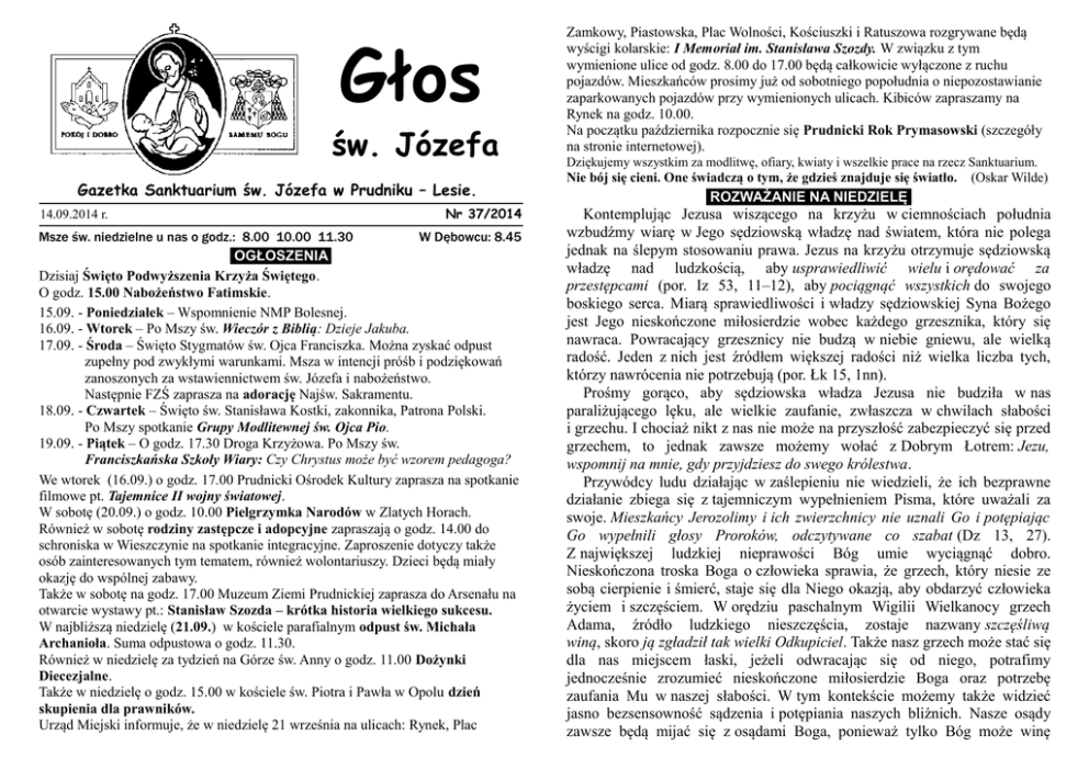 Głos św. Józefa Gazetka Sanktuarium św. Józefa w Prudniku – Lesie. 14.09.2014 r. Nr 37/2014 Msze św. niedzielne u nas o godz.: 8.00 10.00 11.30 W Dębowcu: 8.45 OGŁOSZENIA Dzisiaj Święto Podwyższenia Krzyża Świętego. O godz. 15.00 Nabożeństwo Fatimskie. 15.09. - Poniedziałek – Wspomnienie NMP Bolesnej. 16.09. - Wtorek – Po Mszy św. Wieczór z Biblią: Dzieje Jakuba. 17.09. - Środa – Święto Stygmatów św. Ojca Franciszka. Można zyskać odpust zupełny pod zwykłymi warunkami. Msza w intencji próśb i podziękowań zanoszonych za wstawiennictwem św. Józefa i nabożeństwo. Następnie FZŚ zaprasza na adorację Najśw. Sakramentu. 18.09. - Czwartek – Święto św. Stanisława Kostki, zakonnika, Patrona Polski. Po Mszy spotkanie Grupy Modlitewnej św. Ojca Pio. 19.09. - Piątek – O godz. 17.30 Droga Krzyżowa. Po Mszy św. Franciszkańska Szkoły Wiary: Czy Chrystus może być wzorem pedagoga? We wtorek (16.09.) o godz. 17.00 Prudnicki Ośrodek Kultury zaprasza na spotkanie filmowe pt. Tajemnice II wojny światowej. W sobotę (20.09.) o godz. 10.00 Pielgrzymka Narodów w Zlatych Horach. Również w sobotę rodziny zastępcze i adopcyjne zapraszają o godz. 14.00 do schroniska w Wieszczynie na spotkanie integracyjne. Zaproszenie dotyczy także osób zainteresowanych tym tematem, również wolontariuszy. Dzieci będą miały okazję do wspólnej zabawy. Także w sobotę na godz. 17.00 Muzeum Ziemi Prudnickiej zaprasza do Arsenału na otwarcie wystawy pt.: Stanisław Szozda – krótka historia wielkiego sukcesu. W najbliższą niedzielę (21.09.) w kościele parafialnym odpust św. Michała Archanioła. Suma odpustowa o godz. 11.30. Również w niedzielę za tydzień na Górze św. Anny o godz. 11.00 Dożynki Diecezjalne. Także w niedzielę o godz. 15.00 w kościele św. Piotra i Pawła w Opolu dzień skupienia dla prawników. Urząd Miejski informuje, że w niedzielę 21 września na ulicach: Rynek, Plac Zamkowy, Piastowska, Plac Wolności, Kościuszki i Ratuszowa rozgrywane będą wyścigi kolarskie: I Memoriał im. Stanisława Szozdy. W związku z tym wymienione ulice od godz. 8.00 do 17.00 będą całkowicie wyłączone z ruchu pojazdów. Mieszkańców prosimy już od sobotniego popołudnia o niepozostawianie zaparkowanych pojazdów przy wymienionych ulicach. Kibiców zapraszamy na Rynek na godz. 10.00. Na początku października rozpocznie się Prudnicki Rok Prymasowski (szczegóły na stronie internetowej). Dziękujemy wszystkim za modlitwę, ofiary, kwiaty i wszelkie prace na rzecz Sanktuarium. Nie bój się cieni. One świadczą o tym, że gdzieś znajduje się światło. ROZWAŻANIE NA NIEDZIELĘ (Oskar Wilde) Kontemplując Jezusa wiszącego na krzyżu w ciemnościach południa wzbudźmy wiarę w Jego sędziowską władzę nad światem, która nie polega jednak na ślepym stosowaniu prawa. Jezus na krzyżu otrzymuje sędziowską władzę nad ludzkością, aby usprawiedliwić wielu i orędować za przestępcami (por. Iz 53, 11–12), aby pociągnąć wszystkich do swojego boskiego serca. Miarą sprawiedliwości i władzy sędziowskiej Syna Bożego jest Jego nieskończone miłosierdzie wobec każdego grzesznika, który się nawraca. Powracający grzesznicy nie budzą w niebie gniewu, ale wielką radość. Jeden z nich jest źródłem większej radości niż wielka liczba tych, którzy nawrócenia nie potrzebują (por. Łk 15, 1nn). Prośmy gorąco, aby sędziowska władza Jezusa nie budziła w nas paraliżującego lęku, ale wielkie zaufanie, zwłaszcza w chwilach słabości i grzechu. I chociaż nikt z nas nie może na przyszłość zabezpieczyć się przed grzechem, to jednak zawsze możemy wołać z Dobrym Łotrem: Jezu, wspomnij na mnie, gdy przyjdziesz do swego królestwa. Przywódcy ludu działając w zaślepieniu nie wiedzieli, że ich bezprawne działanie zbiega się z tajemniczym wypełnieniem Pisma, które uważali za swoje. Mieszkańcy Jerozolimy i ich zwierzchnicy nie uznali Go i potępiając Go wypełnili głosy Proroków, odczytywane co szabat (Dz 13, 27). Z największej ludzkiej nieprawości Bóg umie wyciągnąć dobro. Nieskończona troska Boga o człowieka sprawia, że grzech, który niesie ze sobą cierpienie i śmierć, staje się dla Niego okazją, aby obdarzyć człowieka życiem i szczęściem. W orędziu paschalnym Wigilii Wielkanocy grzech Adama, źródło ludzkiego nieszczęścia, zostaje nazwany szczęśliwą winą, skoro ją zgładził tak wielki Odkupiciel. Także nasz grzech może stać się dla nas miejscem łaski, jeżeli odwracając się od niego, potrafimy jednocześnie zrozumieć nieskończone miłosierdzie Boga oraz potrzebę zaufania Mu w naszej słabości. W tym kontekście możemy także widzieć jasno bezsensowność sądzenia i potępiania naszych bliźnich. Nasze osądy zawsze będą mijać się z osądami Boga, ponieważ tylko Bóg może winę człowieka uczynić winą szczęśliwą, dzięki której pozna on Jego nieskończone miłosierdzie. Jak miłosierdzie człowieka wobec człowieka czerpie z jedynego miłosierdzia Boga, tak również wzajemne patrzenie ludzi na siebie winno być zakorzenione w tym samym źródle: w miłosierdziu Boga. Prośmy o wewnętrzny zachwyt wiary nad niezwykłą ekonomią Bożego zbawienia, dzięki której wszystko — także grzech — może obrócić się na dobro człowieka. Stało się to możliwe dzięki Jezusowi ukrzyżowanemu, na którego spadła chłosta zbawienna dla nas, a w Jego ranach jest nasze zdrowie (Iz 53, 5). Niezależnie od naszego stanu życia (duchownego czy świeckiego) winniśmy mieć głęboką świadomość, że nasze duchowe problemy i słabości, w swojej najgłębszej istocie, nie różnią się niczym od problemów i słabości ludzi, do których posyła nas Jezus. Najmniejsze choćby poczucie wyższości wobec innych z powodu spełnianej, nawet bardzo ważnej, funkcji nie ma sensu. Nie może być ono niczym uzasadnione. Świadczy raczej, że jesteś