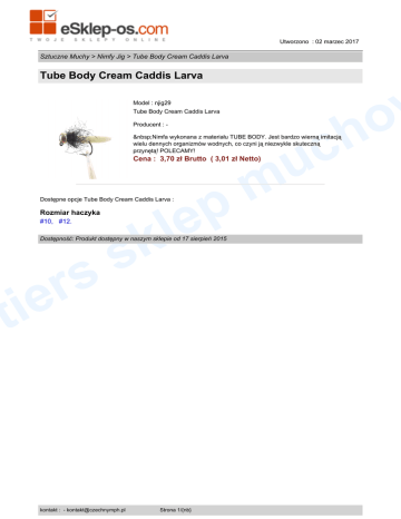 Utworzono : 02 marzec 2017 Sztuczne Muchy > Nimfy Jig > Tube Body Cream Caddis Larva Tube Body Cream Caddis Larva o h c u Model : njig29 Tube Body Cream Caddis Larva Producent : - Nimfa wykonana z materiału TUBE BODY. Jest bardzo wierną imitacją wielu dennych organizmów wodnych, co czyni ją niezwykle skuteczną przynętą! POLECAMY! Cena : 3,70 zł Brutto ( 3,01 zł Netto) Rozmiar haczyka #10, #12. m p e l k s Dostępne opcje Tube Body Cream Caddis Larva : Dostępność: Produkt dostępny w naszym sklepie od 17 sierpień 2015 s r ie t y kontakt : - [email protected] Strona 1/{nb}