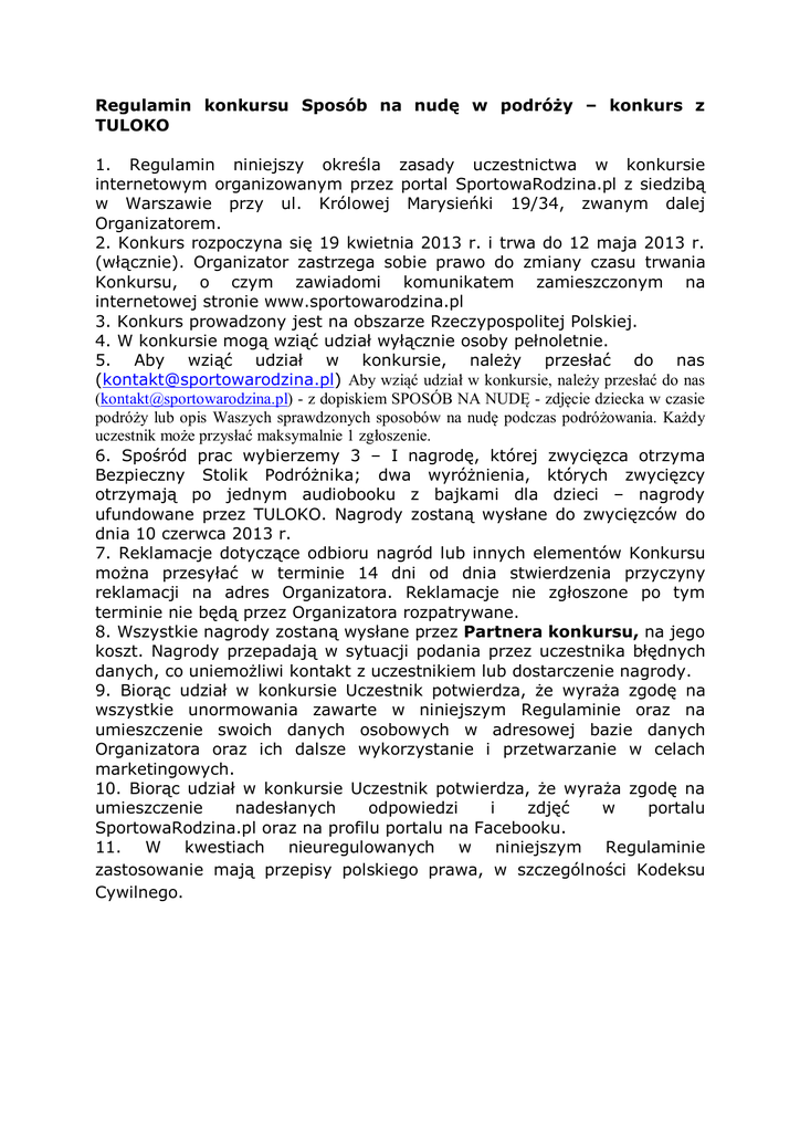 Regulamin konkursu Sposób na nudę w podróży – konkurs z TULOKO 1. Regulamin niniejszy określa zasady uczestnictwa w konkursie internetowym organizowanym przez portal SportowaRodzina.pl z siedzibą w Warszawie przy ul. Królowej Marysieńki 19/34, zwanym dalej Organizatorem. 2. Konkurs rozpoczyna się 19 kwietnia 2013 r. i trwa do 12 maja 2013 r. (włącznie). Organizator zastrzega sobie prawo do zmiany czasu trwania Konkursu, o czym zawiadomi komunikatem zamieszczonym na internetowej stronie www.sportowarodzina.pl 3. Konkurs prowadzony jest na obszarze Rzeczypospolitej Polskiej. 4. W konkursie mogą wziąć udział wyłącznie osoby pełnoletnie. 5. Aby wziąć udział w konkursie, należy przesłać do nas ([email protected]) Aby wziąć udział w konkursie, należy przesłać do nas ([email protected]) - z dopiskiem SPOSÓB NA NUDĘ - zdjęcie dziecka w czasie podróży lub opis Waszych sprawdzonych sposobów na nudę podczas podróżowania. Każdy uczestnik może przysłać maksymalnie 1 zgłoszenie. 6. Spośród prac wybierzemy 3 – I nagrodę, której zwycięzca otrzyma Bezpieczny Stolik Podróżnika; dwa wyróżnienia, których zwycięzcy otrzymają po jednym audiobooku z bajkami dla dzieci – nagrody ufundowane przez TULOKO. Nagrody zostaną wysłane do zwycięzców do dnia 10 czerwca 2013 r. 7. Reklamacje dotyczące odbioru nagród lub innych elementów Konkursu można przesyłać w terminie 14 dni od dnia stwierdzenia przyczyny reklamacji na adres Organizatora. Reklamacje nie zgłoszone po tym terminie nie będą przez Organizatora rozpatrywane. 8. Wszystkie nagrody zostaną wysłane przez Partnera konkursu, na jego koszt. Nagrody przepadają w sytuacji podania przez uczestnika błędnych danych, co uniemożliwi kontakt z uczestnikiem lub dostarczenie nagrody. 9. Biorąc udział w konkursie Uczestnik potwierdza, że wyraża zgodę na wszystkie unormowania zawarte w niniejszym Regulaminie oraz na umieszczenie swoich danych osobowych w adresowej bazie danych Organizatora oraz ich dalsze wykorzystanie i przetwarzanie w celach marketingowych. 10. Biorąc udział w konkursie Uczestnik potwierdza, że wyraża zgodę na umieszczenie nadesłanych odpowiedzi i zdjęć w portalu SportowaRodzina.pl oraz na profilu portalu na Facebooku. 11. W kwestiach nieuregulowanych w niniejszym Regulaminie zastosowanie mają przepisy polskiego prawa, w szczególności Kodeksu Cywilnego.