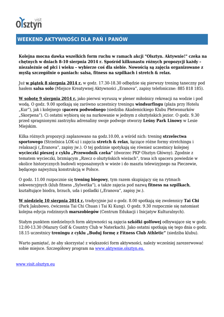 WEEKEND AKTYWNOŚCI DLA PAŃ I PANÓW Kolejna mocna dawka wszelkich form ruchu w ramach akcji "Olsztyn. Aktywnie!" czeka na chętnych w dniach 8-10 sierpnia 2014 r. Spośród kilkunastu różnych propozycji każdy – niezależnie od płci i wieku – wybierze coś dla siebie. Nowością są zajęcia organizowane z myślą szczególnie o paniach: salsa, fitness na szpilkach i stretch & relax. Już w piątek 8 sierpnia 2014 r. w godz. 17.30-18.30 odbędzie się pierwszy trening taneczny pod hasłem salsa solo (Miejsce Kreatywnej Aktywności „Eranova”, zapisy telefoniczne: 885 818 185). W sobotę 9 sierpnia 2014 r. jako pierwsi wyruszą w plener miłośnicy rekreacji na wodzie i pod wodą. O godz. 9.00 spotkają się zarówno uczestnicy treningu windsurfingu (plaża przy Hotelu „Kur”), jak i kolejnego spaceru podwodnego (siedziba Akademickiego Klubu Płetwonurków „Skorpena”). Ci ostatni wybiorą się na nurkowanie w jednym z olsztyńskich jezior. O godz. 9.30 przed spragnionymi zastrzyku adrenaliny swoje podwoje otworzy Leśny Park Linowy w Lesie Miejskim. Kilka różnych propozycji zaplanowano na godz.10.00, a wśród nich: trening strzelectwa sportowego (Strzelnica LOK-u) i zajęcia stretch & relax, łączące różne formy stretchingu i relaksacji („Eranova”, zapisy jw.). O tej godzinie spotykają się również uczestnicy kolejnej wycieczki pieszej z cyklu „Przewodnik czeka” (dworzec PKP Olsztyn Główny). Zgodnie z tematem wycieczki, brzmiącym „Rzecz o olsztyńskich wieżach”, trasa ich spaceru powiedzie w okolice historycznych budowli wyposażonych w wieże i do masztu telewizyjnego na Pieczewie, będącego najwyższą konstrukcją w Polsce. O godz. 11.00 rozpocznie się trening biegowy, tym razem skupiający się na rytmach sekwencyjnych (klub fitness „Sylwetka”), a także zajęcia pod nazwą fitness na szpilkach, kształtujące biodra, brzuch, uda i pośladki („Eranova”, zapisy jw.). W niedzielę 10 sierpnia 2014 r. tradycyjnie już o godz. 8.00 spotkają się zwolennicy Tai Chi (Park Jakubowo, ćwiczenia Tai Chi Chuan i Tai Ki Kung). O godz. 9.30 rozpocznie się natomiast kolejna edycja rodzinnych marszobiegów (Centrum Edukacji i Inicjatyw Kulturalnych). Stałym punktem niedzielnych form aktywności są zajęcia szkółki golfowej odbywające się w godz. 12.00-13.30 (Mazury Golf & Country Club w Naterkach). Jako ostatni spotkają się tego dnia o godz. 18.15 uczestnicy treningu z cyklu „Buduj formę z Fitness Club Athletic” (siedziba klubu). Warto pamiętać, że aby skorzystać z większości form aktywności, należy wcześniej zarezerwować sobie miejsce. Szczegółowy program na www.aktywnie.olsztyn.eu. www.visit.olsztyn.eu