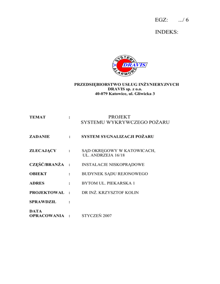 EGZ: .../ 6 INDEKS: PRZEDSIĘBIORSTWO USŁUG INŻYNIERYJNYCH DRAVIS sp. z o.o. 40-079 Katowice, ul. Gliwicka 3 TEMAT : PROJEKT SYSTEMU WYKRYWCZEGO POŻARU ZADANIE : SYSTEM SYGNALIZACJI POŻARU ZLECAJĄCY : SĄD OKRĘGOWY W KATOWICACH, UL. ANDRZEJA 16/18 CZĘŚĆ/BRANŻA : INSTALACJE NISKOPRĄDOWE OBIEKT : BUDYNEK SĄDU REJONOWEGO ADRES : BYTOM UL. PIEKARSKA 1 PROJEKTOWAŁ : SPRAWDZIŁ DR INŻ. KRZYSZTOF KOLIN : DATA OPRACOWANIA : STYCZEŃ 2007 SYSTEM WYKRYWCZY POŻARU SPIS TREŚCI 1. 2. 3. 4. 5. PRZEDMIOT OPRACOWANIA CHARAKTERYSTYKA OBIEKTU PODSTAWY ZAKRES OPRACOWANIA ZAŁOŻENIA OGÓLNE 5.1. TYP I ORGANIZACJA SYSTEMU 5.2. TYP I KRYTERIA ROZMIESZCZENIA CZUJEK 6. OPIS TECHNICZNY 6.1. CENTRALA POŻAROWA 6.2. SYGNALIZACJA RÓWNOLEGŁA 6.3. ROZMIESZCZENIE CZUJEK 6.4. LINIE DOZORU 6.5. SYGNAŁY WEJŚCIOWE 6.6. STEROWANIA 7. ZASILANIE 8. INSTALACJA KABLOWA 9. WSKAZÓWKI MONTAŻOWE 10. ZESTAWIENIE SPRZĘTU 11. ODBIÓR TECHNICZNY 12. KONTROLA I KONSERWACJA Przedsiębiorstwo Usług Inżynieryjnych DRAVIS sp. z o.o. 40-079 Katowice, ul. Gliwicka 3 SYSTEM WYKRYWCZY POŻARU ZAŁĄCZNIKI: A. KARTA KATALOGOWA CENTRALI POLON 4000 B. KARTA KATALOGOWA CZUJKI DUR 4006 Przedsiębiorstwo Usług Inżynieryjnych DRAVIS sp. z o.o. 40-079 Katowice, ul. Gliwicka 3 SYSTEM WYKRYWCZY POŻARU RYSUNKI 1 2 3 4 5 6 7 8 9 10 11 rozmieszczenie detektorów – segment AB - piwnica rozmieszczenie detektorów – segment AB - parter rozmieszczenie detektorów – segment AB – I piętro rozmieszczenie detektorów – segment AB – II piętro rozmieszczenie detektorów – segment E rozmieszczenie detektorów – segment C - piwnica rozmieszczenie detektorów – segment C - parter rozmieszczenie detektorów – segment C – I piętro rozmieszczenie detektorów – segment C – II piętro rozmieszczenie detektorów – segment ABC - poddasze schemat ideowy Przedsiębiorstwo Usług Inżynieryjnych DRAVIS sp. z o.o. 40-079 Katowice, ul. Gliwicka 3 SYSTEM WYKRYWCZY POŻARU 1. PRZEDMIOT OPRACOWANIA. Przedmiotem opracowania jest projekt wykonawczy systemu wykrywczego pożaru dla budynku Sądu Rejonowego w Bytomiu przy ul Piekarskiej 1. 2. CHARAKTERYSTYKA OBIEKTU Budynek wzniesiony w połowie XIX wieku, przebudowany w roku 1894. Konstrukcja z cegły, Pięć kondygnacji: piwnice, parter, dwa piętra użytkowe, wysokie poddasze. Budynek otacza wewnętrzny dziedziniec przykryty świetlikiem. Dwie główne klatki schodowe, liczne klatki schodowe wewnętrzne. Kilka szybów wentylacyjnych na całej wysokości budynku. Do budynku prowadzi frontowe wejscie główne, dwa frontowe wejścia boczne prowadzące przez klaki schodowe do sal rozpraw na I piętrze, boczne wyjście na parking, boczne wyjścia gospodarczotechniczne na poziomie przyziemia W budynku brak wydzielonych stref pożarowych. Budynek narażony na szkody górnicze. 3. PODSTAWY - Podkłady architektoniczno - budowlane w skali 1:100; - Rozporządzenie MSWiA z dnia 16.06.2003 w sprawie ochrony przeciwpożarowej budynków, innych obiektów budowlanych i terenów (Nr 121, poz. 1138), - PKN –CEN/TS 54-14 Systemy sygnalizacji pożarowej. Wytyczne planowania, projektowania, instalowania, odbioru, eksploatacji , konserwacji. - Katalogi techniczne sprzętu alarmowego. 4. ZAKRES OPRACOWANIA Projekt określa: - liczbę, typ i rozmieszczenie detektorów pożarowych, typ, lokalizację i wyposażenie centrali pożarowej, organizację i funkcje systemu. 5. ZAŁOŻENIA OGÓLNE 5.1. Typ i organizacja systemu - detektory optyczne punktowe i liniowe oraz ręczne ostrzegacze pożarowe - system adresowalny konstrukcji pętlowej, - system pracujący pod całodobowym nadzorem służb ochrony obiektu - dwustopniowa sygnalizacja zagrożeń pożarowych : I stopień; bezzwłoczna sygnalizacja lokalna na tablicy synoptycznej centrali pożarowej, lokalna sygnalizacja akustyczna, II stopień ; sygnalizacja ewakuacyjna akustyczno-optyczna i ostrzegawcza w budynku, przekazanie sygnału do Stacji Monitorowania PSP, uruchomienie sygnałów sterujących 5.2. Typ i kryteria rozmieszczenia czujek Jako podstawowy detektor dymów pożarowych w obiekcie zastosowano punktowe czujki optyczne przydatne w zakresie testów TF 1 do 5 i T8. W salach rozpraw ze względów estetycznych zastosowano czujki liniowe. Powierzchnie dozorowania czujek punktowych przyjęto w granicach 60-30 m2 w większości wynikających z powierzchni pomieszczeń. Czujki dymu w pomieszczeniach piwnicznych umieszczono na głównych trasach komunikacyjnych oraz w pobliżu klatek schodowych oraz tras kablowych sieci telekomunikacyjnej. Przedsiębiorstwo Usług Inżynieryjnych DRAVIS sp. z o.o. 40-079 Katowice, ul. Gliwicka 3 SYSTEM WYKRYWCZY POŻARU 6. OPIS TECHNICZNY 6.1. Centrala pożarowa Zastosowano centralę pożarową typu POLON 4800, produkcji Polon Bydgoszcz. Uwaga: montaż i uruchomienie centrali oraz współdziałających elementów systemu powierzyć wykonawcy autoryzowanemu przez producenta. Centralę zainstalować w pomieszczeniu służb ochrony na stanowisku monitorowania obiektu. Detektory zagrożeń pożarowych połączyć z centralą za pomocą ośmiu pętli dozorowych Do centrali doprowadzić zasilanie sieciowe 230V/50Hz z wydzielonego pola zabezpieczonego wyłącznikiem nadmiarowym 20A. Doprowadzić dodatkowy punkt zasilania dla nadajnika Stacji Monitorowania Alarmów PSP. 6.2 Sygnalizacja równoległa W obiekcie nie zastosowano pełnej sygnalizacji równoległej za pomocą wyniesionego panelu. Alarm I-go stopnia sygnalizowany jest poza pomieszczeniem monitorowania obiektu za pomocą dodatkowego sygnalizatora akustycznego na posterunku ochrony przy bramce detektora metalu. 6.3 Rozmieszczenie czujek Rozmieszczenie detektorów dymu przedstawiono na rys. 1-10. Dopuszcza się zmiany punktów montażu i połączeń z zachowaniem zasad prawidłowej konstrukcji systemów sygnalizacji pożaru. Uwaga: nie przewidziano detektorów w przestrzeniach nadstropowych pomieszczeń. Stropy podwieszane zastosowano wyłącznie ze względów este