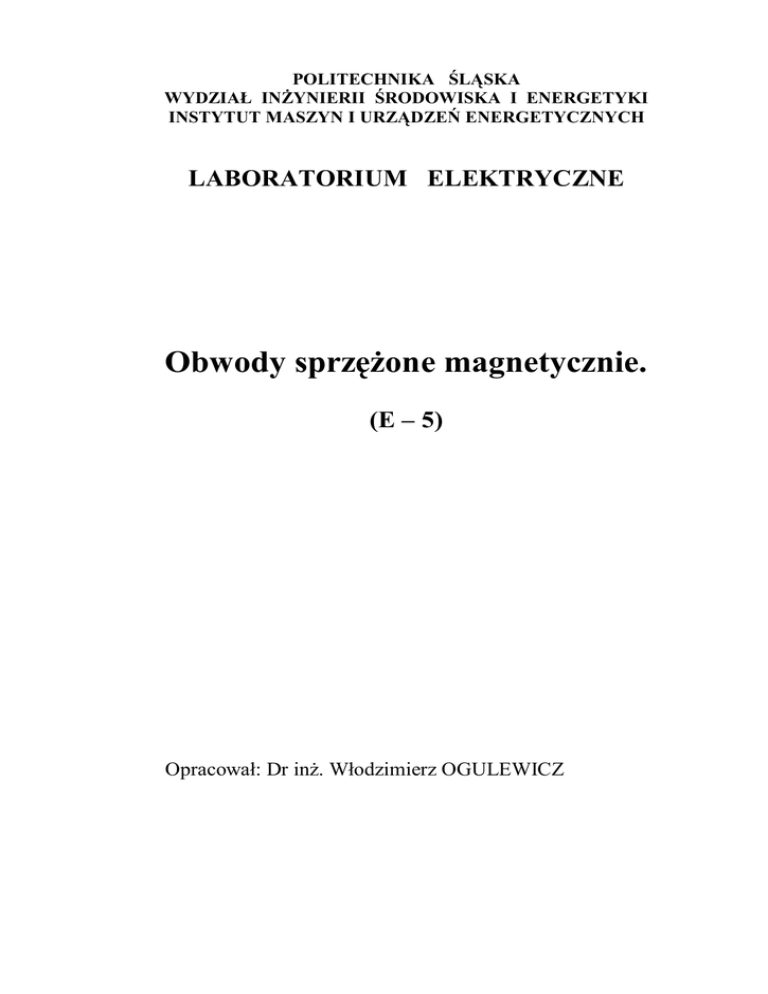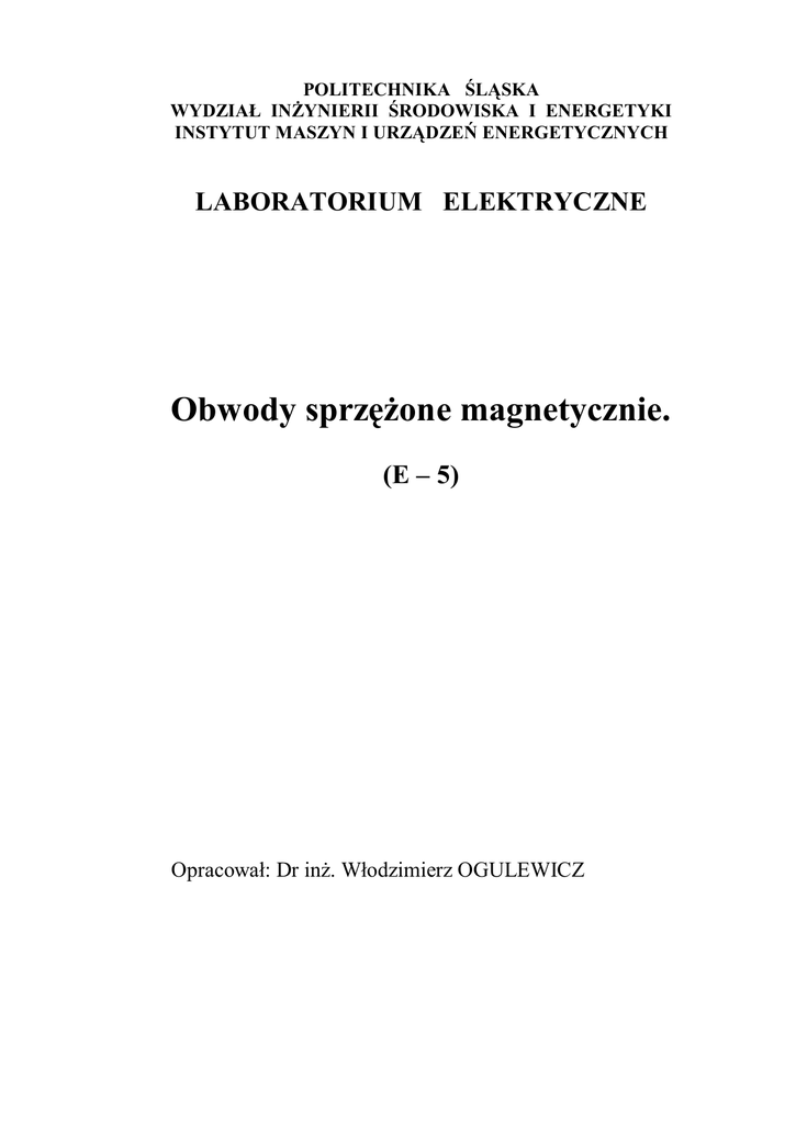 POLITECHNIKA ŚLĄSKA WYDZIAŁ INŻYNIERII ŚRODOWISKA I ENERGETYKI INSTYTUT MASZYN I URZĄDZEŃ ENERGETYCZNYCH LABORATORIUM ELEKTRYCZNE Obwody sprzężone magnetycznie. (E – 5) Opracował: Dr inż. Włodzimierz OGULEWICZ 1. Cel ćwiczenia. Celem ćwiczenia jest poznanie sposobów opisu elementów sprzężonych magnetycznie (transformator powietrzny lub rdzeniowy) w układzie elektrycznym oraz nabycie umiejętności doświadczalnego wyznaczenia indukcyjności własnej – L i indukcyjności wzajemnej – M. 2. Wprowadzenie. 2.1. Czwórniki. Okreś1enia i pojęcia podstawowe. Obwód, który posiada cztery wyróżnione zaciski, poprzez które może być połączony z innymi obwodami nazywa się czterobiegunnikiem, natomiast czwórnikiem nazywa się czterobiegunnik połączony z innymi obwodami w ten sposób, że każdemu zaciskowi, przez który prąd wpływa do czterobiegunnika, odpowiada zacisk, przez który taki sam prąd wypływa. Ponieważ przy ustaleniu zacisku z prądem dopływającym, drugi zacisk może być wybrany na trzy sposoby, z I2 2 czterobiegunnika można utworzyć trzy 1 I1 zupełnie różne czwórniki. Zwykle zaciski czwórnika porządkujemy i oznaczamy jak U2 U1 na rys.1. Gdy czwórnik włączony jest pomiędzy źródłem a odbiornikiem I2’ 2’ rozróżnia się ponadto zaciski wejściowe (1, 1’ I1’ 1’) i wyjściowe (2, 2’). Charakter I1 = I1’ I2 = I2’ czwórnika posiada wiele obwodów Rys.1. Czwórnik elektrycznych takich jak filtry, linie transmisyjne, transformatory, wzmacniacze. Dzięki wprowadzeniu uogólniającego pojęcia czwórnika, do analizy różnych obwodów można użyć jednolitego aparatu matematycznego, którego zaletą jest uniezależnienie się od wewnętrznej struktury i parametrów obwodu (układu). Dla czwórnika określa się jedynie współczynniki równań (wspólne dla wszystkich układów), wiążące z sobą prądy i napięcia na zaciskach układu czwórnika. 2.2. Równania czwórników. Równania czwórnika są równaniami wiążącymi prądy i napięcia na zaciskach czwórnika (U1; I1; U2; I2). Dwie spośród tych wielkości są zmiennymi niezależnymi, dwie pozostałe zmiennymi zależnymi. Różny wybór zmiennych niezależnych prowadzi oczywiście do różnych postaci równań czwórnika. Sposób wyboru jest dowolny, lecz otrzymana postać równania, zależnie od konkretnego zagadnienia, może być mniej lub bardziej dogodna. Zależnie od wyboru zmiennych, równania te posiadają różne nazwy: 1. Gdy zmiennymi niezależnymi są prądy I1, I2 równanie nazywa się równaniem impedancyjnym. Ma ono postać: U1 = Z11 I1 + Z12 I2 U2 = Z21 I1 + Z22 I2 (1) 2. Gdy zmiennymi niezależnymi są napięcia U1, U2 równanie nazywa się równaniem admitancyjnym. Ma ono postać: I1 = Y11 U1 + Y12 U2 I2 = Y21 U1 + Y22 U2 (2) 3. Gdy zmiennymi niezależnymi są wielkości wejściowe U1; I1 lub wyjściowe U2; I2 równanie nazywa się równaniem łańcuchowym: U1 = A U2 + B I2 I1 = C U2 + D I2 (3) 4. Gdy zmiennymi niezależnymi jest prąd wejściowy I1 i napięcie wyjściowe U2 lub wielkości pozostałe (U1, I2) równania nazywa się równaniem mieszanym lub równaniem hybrydowym: U1 = h11 I1 + h12 U2 I2 = h21 I1 + h22 U2 (4) Współczynniki poszczególnych równań, są liczbami rzeczywistymi w przypadku obwodów prądu stałego, lub liczbami zespolonymi w obwodach z przebiegami sinusoidalnymi o stałej częstotliwości. Mogą być również funkcjami częstotliwości lub funkcjami zmiennej zespolonej. 2.3. Współczynniki równania impedancyjnego. Współczynniki równania impedancyjnego można wyznaczyć, gdy kolejno założymy, że prąd I2 jest równy zeru (przerwa w obwodzie odbiornika), wówczas: Z11 = U10 ; I10 Z21 = U20 I10 (5) oraz gdy prąd I1 jest równy zeru (czwórnik zasilany od strony zacisków 2-2’), wówczas: U Z22 = U20 ; Z12 = 10 (6) I20 I20 Indeks ,,0” przy poszczególnych napięciach i prądach podkreśla, że są one mierzone w stanie nieobciążonym czwórnika. Z tego też powodu współczynniki Z11, Z12, Z21, Z22 nazywa się parametrami rozwarciowymi czwórnika. Współczynniki Z11 i Z22 są impedancjami rozwarciowymi, a Z21 i Z12 transmitancjami rozwarciowymi. 2.4. Cewki indukcyjne sprzężone magnetycznie. Wśród cewek indukcyjnych należy wyróżnić dwa zasadnicze typy: · Układ jednej cewki, której parametrem dominującym jest indukcyjność własna – L. · Układ dwóch cewek sprzężonych magnetycznie, których głównym parametrem, oprócz indukcyjności własnych obydwu cewek (odpowiednio L1 i L2 ), jest indukcyjność wzajemna – M. 1 M12=M21 I1 R1 U1 L1 I2 2 R2 L2 U2 2’ 1’ Rys.2. Układ dwóch cewek sprzężonych magnetycznie. Cewki indukcyjne mogą być bezrdzeniowe (powietrzne) i wówczas obwód magnetyczny (magnetowód) stanowi powietrze, oraz rdzeniowe (dławiki) o magnetowodzie z materiału ferromagnetycznego (ze szczeliną powietrzną lub bez). Użycie rdzenia ferromagnetycznego powoduje zwiększenie indukcyjności własnej (L), a w cewkach sprzężonych magnetycznie - zwiększenie również indukcyjności wzajemnej (M). W tradycyjnym wykonaniu cewki indukcyjne nawija się jednowarstwowo lub wielowarstwowo. Mogą być one wykonane jako cylindryczne (solenoidalne), płaskie, lub toroidalne (o przekrojach kołowych lub wielobocznych). 2.5. Związek parametrów równania impedancyjnego z wartościami indukcyjności własnych i wzajemnych cewek sprzężonych magnetycznie. Traktując układ dwóch cewek sprzężonych magnetycznie, (z których każda charakteryzuje się indukcyjnością własną L1 lub L2 oraz rezystancją odpowiednio R1 lub R2) jako czwórnik opisany układem równań impedancyjnych (1) dochodzimy do wniosku, że: gdzie: ω = 2·π·f Z11 = U10 I10 = √R12 + (ωL1)2 (7) Z21 = U20 I10 = ωM21 (8) Z22 = U20 I20 = √R22 + (ωL2)2 (9) Z12 = U10 I20 = ωM12 (w przypadku ćwiczenia f = 50 Hz) (10) Z podanych zależności można wyznaczyć parametry L1, L2, M12 i M21, które przy za