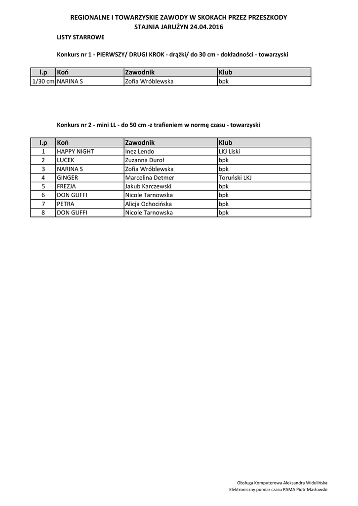 REGIONALNE I TOWARZYSKIE ZAWODY W SKOKACH PRZEZ PRZESZKODY STAJNIA JARUŻYN 24.04.2016 LISTY STARROWE Konkurs nr 1 - PIERWSZY/ DRUGI KROK - drążki/ do 30 cm - dokładności - towarzyski l.p Koń 1/30 cm NARINA S Zawodnik Klub Zofia Wróblewska bpk Konkurs nr 2 - mini LL - do 50 cm -z trafieniem w normę czasu - towarzyski l.p Koń Zawodnik Klub 1 2 3 4 5 6 7 8 HAPPY NIGHT LUCEK NARINA S GINGER FREZJA DON GUFFI PETRA DON GUFFI Inez Lendo Zuzanna Duroł Zofia Wróblewska Marcelina Detmer Jakub Karczewski Nicole Tarnowska Alicja Ochocińska Nicole Tarnowska LKJ Liski bpk bpk Toruński LKJ bpk bpk bpk bpk Obsługa Komputerowa Aleksandra Widulińska Elektroniczny pomiar czasu PAMA Piotr Masłowski REGIONALNE I TOWARZYSKIE ZAWODY W SKOKACH PRZEZ PRZESZKODY STAJNIA JARUŻYN 24.04.2016 LISTY STARROWE Konkurs nr 3 - LL - dokładności z trafieniem w normę czasu - towarzyski l.p Koń Zawodnik Klub 1 2 3 4 5 6 7 8 9 10 11 12 13 14 15 16 17 18 19 20 21 22 23 24 25 26 27 28 29 30 31 32 33 HAPPY NIGHT BIRKA ANTRACYT BIRKA PETRA MARKUS KOBER MARKUS KOBER PRETTY SCHILLA RABKA FREZJA REMUS RABKA HANCOON LUCEK HANCOON LIRA ROSSELVI LIRA GINGER FARYS SHE BOY NIFAR FT SHE BOY ASPENA GENEROUS ASTERIX CAMPUS ASTERIX ANTRACYT CAMPUS TAMIZA kuc Inez Lendo Wiktoria Drewka Laura Puchala Wiktoria Drewka Alicja Ochocińska Julia Toda Julia Sarnowska Julia Toda Julia Sarnowska Aniela Kożuch Renata Kotkiewicz Jakub Karczewski Aleksandra Grela Renata Kotkiewicz Tomasz Głogowski Karolina Świdrak Tomasz Głogowski Marta Koszałka Katarzyna Tobiszewska Marta Koszałka Marcelina Detmer Magdalena Lipska Daria Olech Agnieszka Olech Daria Olech Wiktoria Putz Karolina Kugler Filip Tomczuk Inez Lendo Filip Tomczuk Justyna Staszak Inez Lendo Dominika Osińska LKJ Liski bpk bpk bpk bpk bpk LKS Nadwiślanin Kwidzyn bpk LKS Nadwiślanin Kwidzyn KJK Joker Działdowo KJ Skok- Agrofood bpk VitaSport Brachlewo KJ Skok- Agrofood KJ Stajnia Jarużyn KJ Stajnia Jarużyn bpk CKJ Bonanza bpk Toruński LKJ Kujawsko - Pomorski KJ bpk bpk bpk KJ Oxer Inowrocław KJ Cavallino bpk LKJ Liski bpk bpk LKJ Liski JKSR Michelin Obsługa Komputerowa Aleksandra Widulińska Elektroniczny pomiar czasu PAMA Piotr Masłowski REGIONALNE I TOWARZYSKIE ZAWODY W SKOKACH PRZEZ PRZESZKODY STAJNIA JARUŻYN 24.04.2016 LISTY STARROWE Konkurs nr 4 - L - zwykły art. 238.2.1 - towarzyski l.p Koń Zawodnik Klub 1 2 3 4 5 6 7 8 9 10 11 12 13 14 15 16 17 18 19 20 21 22 23 24 25 26 27 28 29 30 31 TAMIZA kuc RABKA LIRA REMUS HANCOON ROSSELVI GINGER NIFAR FT FARYS GENEROUS FARYS GENEROUS KAREN R ILEX CORTEZ ILEX CORTEZ ALCADO CERSANIA ALCADO CERSANIA JOKER ERRATA SKARLET BALBINA MONTANA NOBLES MONTANA NOBLES ARMENIA NASZA MI Dominika Osińska Renata Kotkiewicz Marta Koszałka Aleksandra Grela Tomasz Głogowski Katarzyna Tobiszewska Marcelina Detmer Agnieszka Olech Magdalena Lipska Karolina Kugler Magdalena Lipska Karolina Kugler Dominika Zielińska Julia Machalewska Tomasz Olszewski Julia Machalewska Tomasz Olszewski Martna Gerke Julia Wutkowska Martna Gerke Julia Wutkowska Emilia Grabiec Zbigniew Szrejder Oliwia Olszanowska Zuzanna Nawrocka Daniel Zieliński Rafał Jerzy Daniel Zieliński Rafał Jerzy Patrycja Nowakowska Renata Kotkiewicz JKSR Michelin KJ Skok- Agrofood bpk VitaSport Brachlewo KJ Stajnia Jarużyn CKJ Bonanza Toruński LKJ bpk Kujawsko - Pomorski KJ KJ Cavallino Kujawsko - Pomorski KJ KJ Cavallino KJ Młyńska Struga JKS Rywal Grudziądz Stowarzyszenie KPKJ JKS Rywal Grudziądz Stowarzyszenie KPKJ JKS Rywal Grudziądz JKS Rywal Grudziądz JKS Rywal Grudziądz JKS Rywal Grudziądz KJ Młyńska Struga JKS Rywal Grudziądz KJ Stajnia Jarużyn KJ Stajnia Jarużyn KJ Stajnia Jarużyn bpk KJ Stajnia Jarużyn bpk KJ Stajnia Jarużyn KJ Skok- Agrofood Konkurs nr 4A - L - egzaminacyjny l.p Koń Zawodnik Klub 1 2 3 4 5 6 ASPENA KAREN R PRETTY SCHILLA ASPENA KAREN R PRETTY SCHILLA Wiktoria Putz Dominika Zielińska Aniela Kożuch Wiktoria Putz Dominika Zielińska Aniela Kożuch KJ Oxer Inowrocław KJ Młyńska Struga KJK Joker Działdowo KJ Oxer Inowrocław KJ Młyńska Struga KJK Joker Działdowo Obsługa Komputerowa Aleksandra Widulińska Elektroniczny pomiar czasu PAMA Piotr Masłowski REGIONALNE I TOWARZYSKIE ZAWODY W SKOKACH PRZEZ PRZESZKODY STAJNIA JARUŻYN 24.04.2016 LISTY STARROWE Konkurs nr 5 - P- dwufazowy art. 274.5.3 l.p 1 2 3 4 5 6 7 8 9 10 11 12 13 Koń Zawodnik Klub ERRATA NASZA MI JOKER SKARLET BALBINA MONTANA NOBLES ARMENIA SERGIO L DORILLA W NEVA CHARIEN RUBIN Zbigniew Szrejder Renata Kotkiewicz Emilia Grabiec Oliwia Olszanowska Zuzanna Nawrocka Daniel Zieliński Rafał Jerzy Patrycja Nowakowska Anna Janka Julia Wiese Marta Balicka Zbigniew Szrejder Karolina Tracewicz JKS Rywal Grudziądz KJ Skok- Agrofood KJ Młyńska Struga KJ Stajnia Jarużyn KJ Stajnia Jarużyn KJ Stajnia Jarużyn bpk KJ Stajnia Jarużyn Kujawsko - Pomorski KJ KJ Stajnia Jarużyn KJK Joker Działdowo JKS Rywal Grudziądz KJ Skok- Agrofood Konkurs nr 6 - N - zwykły art. 238.2.1 l.p 1 2 3 4 5 6 Koń Zawodnik Klub NEVA DRAGON CHARIEN DORILLA W RUBIN SERGIO L Marta Balicka Anna Nowak Zbigniew Szrejder Julia Wiese Karolina Tracewicz Anna Janka KJK Joker Działdowo KJK Joker Działdowo JKS Rywal Grudziądz KJ Stajnia Jarużyn KJ Skok- Agrofood Kujawsko - Pomorski KJ Obsługa Komputerowa Aleksandra Widulińska Elektroniczny pomiar czasu PAMA Piotr Masłowski