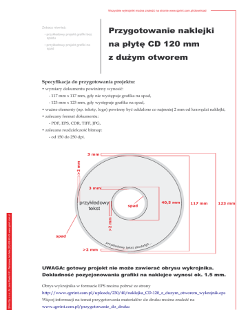 Wszystkie wykrojniki można znaleźć na stronie www.qprint.com.pl/download Zobacz również: • przykładowy projekt grafiki bez spadu • przykładowy projekt grafiki na spad Przygotowanie naklejki na płytę CD 120 mm z dużym otworem Specyfikacja do przygotowania projektu: • wymiary dokumentu powininny wynosić: - 117 mm x 117 mm, gdy nie występuje grafika na spad, - 123 mm x 123 mm, gdy występuje grafika na spad, • ważne elementy (np. teksty, logo) powinny być oddalone co najmniej 2 mm od krawędzi naklejki, • zalecany format dokumentu: - PDF, EPS, CDR, TIFF, JPG, • zalecana rozdzielczość bitmap: - od 150 do 250 dpi. >2 mm 3 mm 3 mm 40,5 mm spad 117 mm 123 mm >2 mm QPrint Sp. z o.o., Al. Jana Pawła II 61, Warszawa, tel./faks (22) 636 49 43, www.qprint.com.pl przykładowy tekst spad prz >2 mm ykła dowy tekst abcdefg h.. . UWAGA: gotowy projekt nie może zawierać obrysu wykrojnika. Dokładność pozycjonowania grafiki na naklejce wynosi ok. 1.5 mm. Obrys wykrojnika w formacie EPS można pobrać ze strony http://www.qprint.com.pl/uploads/230/40/naklejka_CD-120_z_duzym_otworem_wykrojnik.eps Więcej informacji na temat przygotowania materiałów do druku można znaleźć na www.qprint.com.pl/przygotowanie_do_druku Wszystkie wykrojniki można znaleźć na stronie www.qprint.com.pl/download Przykład naklejki na płytę CD 120 mm z dużym otworem GRAFIKA NIE NA SPAD Gotowy do druku projekt nie zawiera obrysu wykrojnika. Wymiary grafiki w pliku wynoszą 117x117 mm, gdyż spady nie są potrzebne. Poniższy rysunek przedstawia przykładową grafikę Raport 2003-2004 QPrint Sp. z o.o., Al. Jana Pawła II 61, Warszawa, tel./faks (22) 636 49 43, www.qprint.com.pl PREZENTACJA Rysunek obok przedstawia grafikę wraz z naniesionym obrysem wykrojnika. Proszę zwrócić uwagę na następujące elementy: • grafika nie zawiera spadów, gdyż nie są one potrzebne w przypadku tego projektu, Raport 2003-2004 PREZENTACJA • wszystkie elementy znajdują się co najmniej 2 mm od krawędzi wykrojnika. Wszystkie wykrojniki można znaleźć na stronie www.qprint.com.pl/download Przykład naklejki na płytę CD 120 mm z dużym otworem GRAFIKA NA SPAD Gotowy do druku projekt nie zawiera obrysu wykrojnika. Wymiary grafiki w pliku wynoszą 123x123 mm, gdyż zawiera spady. Poniższy rysunek przedstawia przykładową grafikę QPrint Sp. z o.o., Al. Jana Pawła II 61, Warszawa, tel./faks (22) 636 49 43, www.qprint.com.pl PREZENTACJA Rysunek obok przedstawia grafikę wraz z naniesionym obrysem wykrojnika. Proszę zwrócić uwagę na następujące elementy: • grafika zawiera spady, zarówno na zewnątrz jak i od wewnątrz naklejki, • teksty znajdują się co najmniej 2 mm od krawędzi wykrojnika. PREZENTACJA