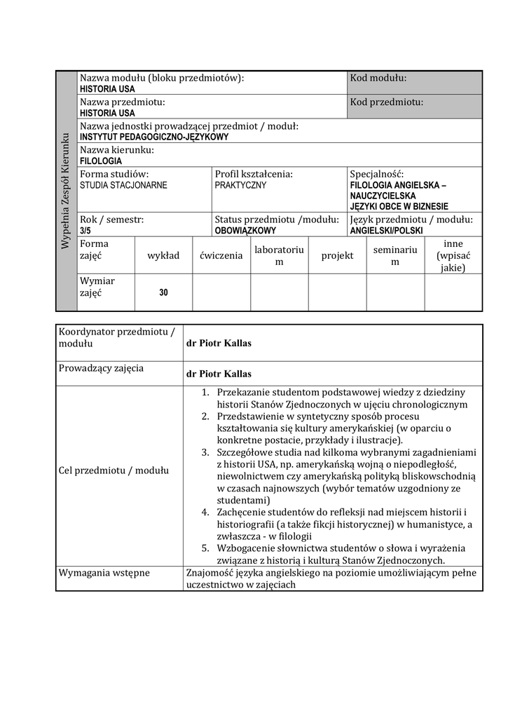 Nazwa modułu (bloku przedmiotów): Kod modułu: Nazwa przedmiotu: Kod przedmiotu: HISTORIA USA HISTORIA USA Wypełnia Zespół Kierunku Nazwa jednostki prowadzącej przedmiot / moduł: INSTYTUT PEDAGOGICZNO-JĘZYKOWY Nazwa kierunku: FILOLOGIA Forma studiów: Profil kształcenia: Specjalność: Rok / semestr: Status przedmiotu /modułu: Język przedmiotu / modułu: STUDIA STACJONARNE 3/5 Forma zajęć PRAKTYCZNY OBOWIĄZKOWY wykład Wymiar zajęć laboratoriu m ANGIELSKI/POLSKI projekt seminariu m inne (wpisać jakie) 30 Koordynator przedmiotu / modułu Prowadzący zajęcia Cel przedmiotu / modułu Wymagania wstępne ćwiczenia FILOLOGIA ANGIELSKA – NAUCZYCIELSKA JĘZYKI OBCE W BIZNESIE dr Piotr Kallas dr Piotr Kallas 1. Przekazanie studentom podstawowej wiedzy z dziedziny historii Stanów Zjednoczonych w ujęciu chronologicznym 2. Przedstawienie w syntetyczny sposób procesu kształtowania się kultury amerykańskiej (w oparciu o konkretne postacie, przykłady i ilustracje). 3. Szczegółowe studia nad kilkoma wybranymi zagadnieniami z historii USA, np. amerykańską wojną o niepodległość, niewolnictwem czy amerykańską polityką bliskowschodnią w czasach najnowszych (wybór tematów uzgodniony ze studentami) 4. Zachęcenie studentów do refleksji nad miejscem historii i historiografii (a także fikcji historycznej) w humanistyce, a zwłaszcza - w filologii 5. Wzbogacenie słownictwa studentów o słowa i wyrażenia związane z historią i kulturą Stanów Zjednoczonych. Znajomość języka angielskiego na poziomie umożliwiającym pełne uczestnictwo w zajęciach EFEKTY KSZTAŁCENIA Nr 01 02 03 04 05 06 07 08 Opis efektu kształcenia Student ma usystematyzowaną wiedzę z zakresu historii Stanów Zjednoczonych. Student posiada podstawową wiedzę o wpływie czynników historycznych na przemiany języka i kultury Stanów Zjednoczonych. Student wyszukuje i wykorzystuje informacje z różnorakich źródeł pisemnych i ustnych dotyczących historii amerykańskiej (wykład, podręcznik i inne źródła drukowane wspomniane w bibliografii, strony internetowe, filmy dokumentalne i fabularne, itp.) oraz dokonuje ich analizy. Student merytorycznie uzasadnia stawiane tezy dotyczące dziejów Stanów Zjednoczonych i natury nauk historycznych, odnosząc się do poglądów historyków i teoretyków historii, oraz formułuje wnioski i sądy własne w języku angielskim. Student formułuje pytania i wypowiedzi dotyczące dziejów oraz przemian społecznych i kulturowych Stanów Zjednoczonych wykorzystując wiedzę teoretyczną i źródła. Student określa zakres posiadanej przez siebie wiedzy i umiejętności z zakresu historii Stanów Zjednoczonych. Student rozpoznaje różne aspekty kultury polskiej i amerykańskiej oraz potrafi pełnić rolę pośrednika w przestrzeni międzykulturowej. Student potrafi korzystać z amerykańskich narracji historycznych, a także – w zakresie w jakim dotyczą one historii i historii kultury – mass mediów – prasy, radia, telewizji, amerykańskich stron internetowych, oraz rozumie potrzebę uczestnictwa w życiu kulturalnym i społecznym. Odniesienie do efektów dla kierunku K_W02 K_W04 K_U01 K_U06 K_U08 K_K01 K_K08 K_K09 TREŚCI PROGRAMOWE Wykład Wykłady obejmują zarys historii Stanów Zjednoczonych od epoki wielkich odkryć geograficznych po czasy nam współczesne: Amerykę w czasach przedkolonialnych i kolonialnych (do roku 1776), rewolucję amerykańską (amerykańską wojnę o niepodległość 1775-1783); tworzenie się państwa amerykańskiego (1783-1861); wojnę secesyjną (1861-65); rekonstrukcję Południa i tzw. „Gilded Age” (1865-1917); udział Ameryki w wojnach światowych oraz okres międzywojenny (1917-1945), dzieje Stanów Zjednoczonych w epoce zimnej wojny (1945-89) oraz czasy nam współczesne (1989--) Ćwiczenia Nie dotyczy. Laboratorium Nie dotyczy. Projekt Nie dotyczy. Literatura podstawowa Literatura uzupełniająca Bryn O’Callaghan, An Illustrated History of the USA, Longman George B. Tindall. America. A Narrative History, W.W. Norton & Co Howard Zinn. A People’s History of the United States. 1492 – Present , Harper & Row Marek Gołębiowski: Dzieje kultury Stanów Zjednoczonych, PWN Zbigniew Lewicki: Historia cywilizacji amerykańskiej (t.1: Era tworzenia 1607-1789; t.2: Era sprzeczności 1787-1865), Scholar Źródła internetowe: http://www.america.gov/publications/books/ history-outline.html http://www.ushistory.org/ http://countrystudies.us/united-states/ Metody kształcenia Wykład konwersatoryjny Nr efektu kształcenia Metody weryfikacji efektów kształcenia 1. Ocena prezentacji przygotowanej przez studenta na temat wybranego (i uzgodnionego z prowadzącym) aspektu historii amerykańskiej. 2. Egzamin końcowy (test pisemny) składający się zarówno z pytań zamkniętych, jak i otwartych, wymagających sformułowania krótkich wypowiedzi pisemnych Forma i warunki zaliczenia 01, 02, 03, 04, 05, 06, 07, 08 01, 02, 04, 05, 06, 07 Przedmiot kończy się egzaminem – testem pisemnym podczas zimowej sesji egzaminacyjnej. Student otrzymuje zaliczenie po zaliczeniu testu końcowego. NAKŁAD PRACY STUDENTA Udział w wykładach Samodzielne studiowanie tematyki wykładów Udział w ćwiczeniach audytoryjnych i laboratoryjnych Samodzielne przygotowywanie się do ćwiczeń* Przygotowanie projektu / eseju / itp. * Przygotowanie się do egzaminu / zaliczenia Udział w konsultacjach Inne ŁĄCZNY nakład pracy studenta w godz. Liczba godzin 30 10 15 15 5 75 Liczba punktów ECTS za przedmiot Liczba p. ECTS związana z zajęciami praktycznymi Liczba p. ECTS za zajęciach wymagające bezpośredniego udziału nauczycieli akademickich 3 30 (15=15) 1,2 35 (30+5) 1,4
