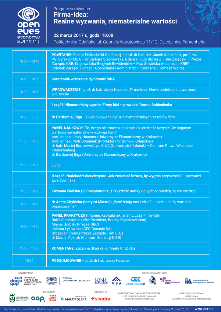 Program seminarium Firma-Idea: Realne wyzwania, niematerialne wartości 22 marca 2017 r., godz. 10.00 Politechnika Gdańska, ul. Gabriela Narutowicza 11/12, Dziedziniec Fahrenheita 10.00 – 10.10 POWITANIE: Rektor Politechniki Gdańskiej – prof. dr hab. inż. Jacek Namieśnik, prof. zw. PG, Dyrektor MBA – dr Barbara Stepnowska, Gdański Klub Biznesu – Jan Zarębski – Prezes Zarządu GKB, Krajowa Izba Biegłych Rewidentów – Ewa Sowińska wiceprezes KRBR, Członek Zarządu Fundacji Gospodarki i Administracji Publicznej - Tomasz Wojtas 10.10 – 10.30 Ceremonia wręczenia dyplomów MBA 10.30 – 10.50 WPROWADZENIE - prof. dr hab. Jerzy Hausner: Firma-Idea. Nowe podejście do wartości w biznesie. I część: Niematerialny wymiar Firmy Idei – prowadzi Dorota Sobieniecka 10.50 – 11.30 dr Bartłomiej Biga – Ukierunkowana dyfuzja niematerialnych zasobów firm 11.30 – 12.30 PANEL NAUKOWY: “To, czego nie możesz dotknąć, ale co może uczynić Cię bogatym – wartości niematerialne w rozwoju firmy” prof. dr hab. Jerzy Hausner (Uniwersytet Ekonomiczny w Krakowie) prof. dr hab. Piotr Dominiak (Prorektor Politechniki Gdańskiej) dr hab. Maciej Barczewski, prof. UG (Uniwersytet Gdański – Centrum Prawa Własności Intelektualnej) dr Bartłomiej Biga (Uniwersytet Ekonomiczny w Krakowie) 12.30 – 13.30 Lunch II część: Nadchodzi nieuchwytne. Jak zmieniać biznes, by wygrać przyszłość? – prowadzi Ewa Sowińska 13.30 – 13.50 Zuzanna Skalska (360Inspiration): „Przyszłość należy do tych co wiedzą, że nie wiedzą.” 13.50 – 14.10 dr Aneta Chybicka (Instytut Miasta): „Wyróżniają nas ludzie? – czemu służą wartości organizacyjne.” 14.15 – 15.15 PANEL PRAKTYCZNY: Koniec kapitału jaki znamy, czas Firmy-Idei Rafał Stepnowski (Vice President, Boeing Digital Aviation) Maciej Grabski (Prezes OBC) Jolanta Łykowska (CFO Oceanic SA) Szczepan Kniter (Prezes Zarządu Trefl S.A.) dr Marcin Pęksyk (Centrum Edukacji KIBR) 15.15 – 15.30 KOMENTARZ: Zuzanna Skalska, dr Aneta Chybicka 15.30 PODSUMOWANIE – prof. dr hab. Jerzy Hausner WSPÓŁORGANIZATORZY ORGANIZATOR PARTNERZY POWERED BY PATRONAT NAD WYDARZENIEM OBJĄŁ: prof. dr hab. inż. Jacek Namieśnik Rektor Politechniki Gdańskiej PATRONAT HONOROWY: Jacek Krupa Marszałek Województwa Małopolskiego Seminarium „Firma-Idea: Realne wyzwania, niematerialne wartości” odbędzie się w ramach przygotowań do Open Eyes Economy Summit 2017 WWW.OEES.PL