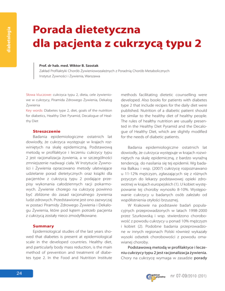 diabetologia Porada dietetyczna dla pacjenta z cukrzycą typu 2 Prof. dr hab. med. Wiktor B. Szostak Zakład Profilaktyki Chorób Żywieniowozależnych z Poradnią Chorób Metabolicznych Instytut Żywności i Żywienia, Warszawa Słowa kluczowe: cukrzyca typu 2, dieta, cele żywieniowe w cukrzycy, Piramida Zdrowego Żywienia, Dekalog Żywienia Key words: Diabetes type 2, diet, goals of the nutrition for diabetics, Healthy Diet Pyramid, Decalogue of Healthy Diet Streszczenie Badania epidemiologiczne ostatnich lat dowiodły, że cukrzyca występuje w krajach rozwiniętych na skalę epidemiczną. Podstawową metodą w profilaktyce i leczeniu cukrzycy typu 2 jest racjonalizacja żywienia, a w szczególności zmniejszenie nadwagi ciała. W Instytucie Żywności i Żywienia opracowano metody ułatwiające udzielanie porad dietetycznych oraz książki dla pacjentów z cukrzycą typu 2 podające przepisy wykonania całodziennych racji pokarmowych. Żywienie chorego na cukrzycę powinno być zbliżone do zasad racjonalnego żywienia ludzi zdrowych. Przedstawione jest ono zazwyczaj w postaci Piramidy Zdrowego Żywienia i Dekalogu Żywienia, które pod kątem potrzeb pacjenta z cukrzycą zostały nieco zmodyfikowane. Summary Epidemiological studies of the last years showed that diabetes is present at epidemiological scale in the developed countries. Healthy diet, and particularly body mass reduction, is the main method of prevention and treatment of diabetes type 2. In the Food and Nutrition Institute 24 methods facilitating dietetic counselling were developed. Also books for patients with diabetes type 2 that include recipes for the daily diet were published. Nutrition of a diabetic patient should be similar to the healthy diet of healthy people. The rules of healthy nutrition are usually presented in the Healthy Diet Pyramid and the Decalogue of Healthy Diet, which are slightly modified for the needs of diabetic patients. Badania epidemiologiczne ostatnich lat dowiodły, że cukrzyca występuje w krajach rozwiniętych na skalę epidemiczną, z bardzo wyraźną tendencją do nasilania się tej epidemii. Wg badania Balkau i wsp. (2007) cukrzycę rozpoznawano u 11-12% mężczyzn, zgłaszających się z różnych przyczyn do lekarzy podstawowej opieki zdrowotnej w krajach europejskich (1). U kobiet występowanie tej choroby wynosiło 8-10%. Występowanie cukrzycy u badanych osób zależało od współistnienia otyłości brzusznej. W Krakowie na podstawie badań populacyjnych przeprowadzonych w latach 1998-2000 przez Szurkowską i wsp. stwierdzono chorobowość z powodu cukrzycy u ponad 10% mężczyzn i kobiet (2). Podobne badania przeprowadzone w innych regionach Polski również wykazały wysoki odsetek chorobowości z powodu omawianej choroby. Podstawową metodą w profilaktyce i leczeniu cukrzycy typu 2 jest racjonalizacja żywienia. Chory na cukrzycę wymaga w zasadzie porady nr 07-09 /2010 (201) nych. Dlatego ograniczenie spożycia energii co najmniej o 500 kcal/dzień i zwiększenie aktywności fizycznej powinny być głównym zaleceniem dla pacjenta. Ograniczać należy spożycie zarówno tłuszczów jak i węglowodanów, a szczególnie węglowodanów o wysokim indeksie glikemicznym. Żywienie chorego na cukrzycę powinno być zbliżone do zasad racjonalnego żywienia ludzi zdrowych (6). Dlatego pacjent powinien otrzymać krótką informację na temat tych zasad. Przedstawiamy je zazwyczaj w postaci Piramidy Zdrowego Żywienia i Dekalogu Żywienia. Na rycinie 1 przedstawiono Piramidę oraz Dekalog zmodyfikowany nieco pod kątem potrzeb pacjenta z cukrzycą. Należy podkreślić, że ograniczenie kaloryczności diety wymaga mniejszego, niż w stanie zdrowia, spożycia produktów zbożowych, rezygnacji z cukru i słodyczy, a także z tłuszczów zwierzęcych i twardych margaryn. Oleje roślinne powinny być spożywane z umiarem. diabetologia dietetycznej udzielonej przez wykwalifikowanego dietetyka. Jednakże mała liczba specjalistów w tej dziedzinie wiedzy stawia lekarza wobec konieczności osobistego udzielenia porady dietetycznej swojemu pacjentowi. Jest to zajęcie czasochłonne, a często wymaga dodatkowych porad wzmacniających. Dlatego w Instytucie Żywności i Żywienia opracowaliśmy metody ułatwiające udzielanie porad dietetycznych oraz książki dla pacjentów z cukrzycą typu 2 podające przepisy wykonania całodziennych racji pokarmowych (3-5). Do celów leczenia cukrzycy zalicza się miedzy innymi utrzymanie optymalnych wartości glikemii, lipemii i ciśnienia tętniczego. Osiągnięcie tych celów daje szansę opóźnienia rozwoju powikłań omawianej choroby. Cele żywieniowe w cukrzycy przedstawione zostały w tabeli 1. Pacjent z cukrzycą typu 2 ma zazwyczaj nadwagę ciała. Zmniejszenie nadwagi powoduje z reguły poprawę zaburzeń metaboliczTabela 1. Cele żywieniowe w cukrzycy Energia Węglowodany w ilości potrzebnej do osiągnięcia/utrzymania należnej masy ciała 45-50%; IG < 55 SFA < 7% PUFA n-6 4-8% PUFA n-3 1-2% (w tym 500 mg EPA + DHA) PUFA n-6/n-3 <4 MUFA w ilości potrzebnej do uzyskania pożądanej wartości energetycznej diety Trans < 1% Cholesterol Białka Błonnik Warzywa i owoce Sól < 200 mg/dz 15-20% 20-35 g/dz > 400 g/dz (więcej warzyw niż owoców) < 6 g/dz (< 5 g/dz w nadciśnieniu tętniczym) Wszystkie wartości, za wyjątkiem cholesterolu i błonnika, podano w procentach zalecanej ilości energii; SFA – nasycone kwasy tłuszczowe, MUFA – jednonienasycone kwasy tłuszczowe, PUFA – wielonienasycone kwasy tłuszczowe, trans – izomery trans nienasyconych kwasów tłuszczowych, IG – indeks glikemiczny (201) nr 07-09 /2010 25 diabetologia Rycina 1. Piramida Zdrowego Żywienia i Dekalog Żywienia w cukrzycy 1. 2. 3. 4. Dbaj o różnorodność spożywanych produktów Strzeż się nadwagi i otyłości, bądź aktywny ruchowo Produkty zbożowe spożywaj z umiarem i tylko o niskim indeksie glikemicznym Spożywaj codziennie co najmniej 2 duże szkla
