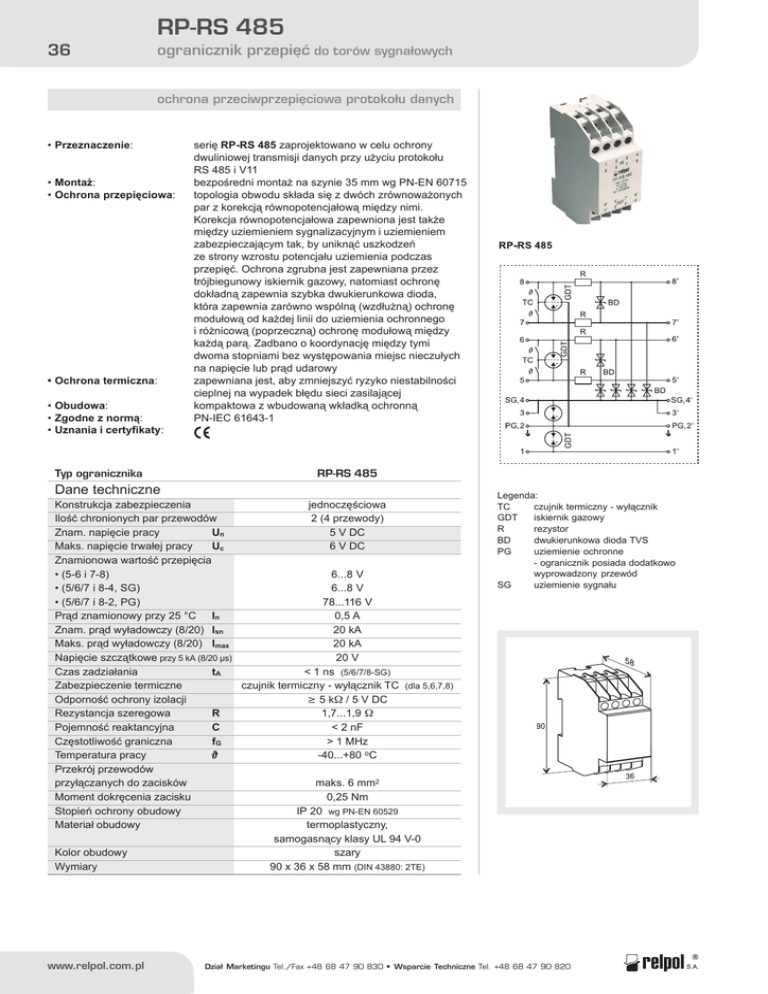 RP-RS 485 36 ogranicznik przepiêæ do torów sygna³owych ochrona przeciwprzepiêciowa protoko³u danych • Przeznaczenie: • Monta¿: • Ochrona przepiêciowa: • Ochrona termiczna: • Obudowa: • Zgodne z norm¹: • Uznania i certyfikaty: Typ ogranicznika seriê RP-RS 485 zaprojektowano w celu ochrony dwuliniowej transmisji danych przy u¿yciu protoko³u RS 485 i V11 bezpoœredni monta¿ na szynie 35 mm wg PN-EN 60715 topologia obwodu sk³ada siê z dwóch zrównowa¿onych par z korekcj¹ równopotencja³ow¹ miêdzy nimi. Korekcja równopotencja³owa zapewniona jest tak¿e miêdzy uziemieniem sygnalizacyjnym i uziemieniem zabezpieczaj¹cym tak, by unikn¹æ uszkodzeñ ze strony wzrostu potencja³u uziemienia podczas przepiêæ. Ochrona zgrubna jest zapewniana przez trójbiegunowy iskiernik gazowy, natomiast ochronê dok³adn¹ zapewnia szybka dwukierunkowa dioda, która zapewnia zarówno wspóln¹ (wzd³u¿n¹) ochronê modu³ow¹ od ka¿dej linii do uziemienia ochronnego i ró¿nicow¹ (poprzeczn¹) ochronê modu³ow¹ miêdzy ka¿d¹ par¹. Zadbano o koordynacjê miêdzy tymi dwoma stopniami bez wystêpowania miejsc nieczu³ych na napiêcie lub pr¹d udarowy zapewniana jest, aby zmniejszyæ ryzyko niestabilnoœci cieplnej na wypadek b³êdu sieci zasilaj¹cej kompaktowa z wbudowan¹ wk³adk¹ ochronn¹ PN-IEC 61643-1 RP-RS 485 Dane techniczne Konstrukcja zabezpieczenia jednoczêœciowa Iloœæ chronionych par przewodów 2 (4 przewody) Znam. napiêcie pracy Un 5 V DC Maks. napiêcie trwa³ej pracy Uc 6 V DC Znamionowa wartoœæ przepiêcia • (5-6 i 7-8) 6...8 V • (5/6/7 i 8-4, SG) 6...8 V • (5/6/7 i 8-2, PG) 78...116 V Pr¹d znamionowy przy 25 °C In 0,5 A Znam. pr¹d wy³adowczy (8/20) Isn 20 kA Maks. pr¹d wy³adowczy (8/20) Imax 20 kA Napiêcie szcz¹tkowe przy 5 kA (8/20 µs) 20 V Czas zadzia³ania tA < 1 ns (5/6/7/8-SG) Zabezpieczenie termiczne czujnik termiczny - wy³¹cznik TC (dla 5,6,7,8) Odpornoœæ ochrony izolacji ≥ 5 kΩ / 5 V DC Rezystancja szeregowa R 1,7...1,9 Ω Pojemnoœæ reaktancyjna C < 2 nF Czêstotliwoœæ graniczna fG > 1 MHz ϑ Temperatura pracy -40...+80 oC Przekrój przewodów przy³¹czanych do zacisków maks. 6 mm2 Moment dokrêcenia zacisku 0,25 Nm Stopieñ ochrony obudowy IP 20 wg PN-EN 60529 Materia³ obudowy termoplastyczny, samogasn¹cy klasy UL 94 V-0 Kolor obudowy szary Wymiary 90 x 36 x 58 mm (DIN 43880: 2TE) www.relpol.com.pl Legenda: TC czujnik termiczny - wy³¹cznik GDT iskiernik gazowy R rezystor BD dwukierunkowa dioda TVS PG uziemienie ochronne - ogranicznik posiada dodatkowo wyprowadzony przewód SG uziemienie sygna³u Dzia³ Marketingu Tel./Fax +48 68 47 90 830 • Wsparcie Techniczne Tel. +48 68 47 90 820