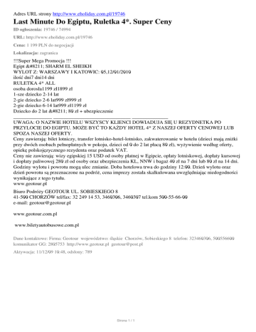Adres URL strony http://www.eholiday.com.pl/19746 Last Minute Do Egiptu, Ruletka 4*. Super Ceny ID ogłoszenia: 19746 / 74994 URL: http://www.eholiday.com.pl/19746 Cena: 1 199 PLN do negocjacji Lokalizacja: zagranica !!!Super Mega Promocja !!! Egipt – SHARM EL SHEIKH WYLOT Z: WARSZAWY I KATOWIC: 05,12/01/2010 ilość dni7 dni14 dni RULETKA 4* ALL osoba dorosła1199 zł1899 zł 1-sze dziecko 2-14 lat 2-gie dziecko 2-6 lat999 zł999 zł 2-gie dziecko 6-14 lat999 zł1199 zł Dziecko do 2 lat – 80 zł + ubezpieczenie _______________ ______________________________ ______________ UWAGA: O NAZWIE HOTELU WSZYSCY KLIENCI DOWIADUJA SIĘ U REZYDNETKA PO PRZYLOCIE DO EGIPTU. MOŻE BYĆ TO KAŻDY HOTEL 4* Z NASZEJ OFERTY CENOWEJ LUB SPOZA NASZEJ OFERTY. Ceny zawierają: bilet lotniczy, transfer lotnisko-hotel-lotnisko, zakwaterowanie w hotelu (dzieci mają zniżki przy dwóch osobach pełnopłatnych w pokoju, dzieci od 0 do 2 lat płacą 80 zł), wyżywienie według oferty, opiekę polskojęzycznego rezydenta oraz podatek VAT. Ceny nie zawierają: wizy egipskiej 15 USD od osoby płatnej w Egipcie, opłaty lotniskowej, dopłaty kursowej i dopłaty paliwowej 280 zł od osoby oraz ubezpieczenia KL, NNW i bagaż 40 zł na 7 dni lub 80 zł na 14 dni. Godziny wylotu i powrotu mogą ulec zmianie. Doba hotelowa trwa do godziny 12:00. Dzień wylotu oraz dzień powrotu są przeznaczone na podróż, cena imprezy została skalkulowana uwzględniając niedogodności wynikające z tego tytułu. www.geotour.pl Biuro Podróży GEOTOUR UL. SOBIESKIEGO 8 41-500 CHORZÓW tel/fax: 32 249 14 53, 3460306, 3460307 tel.kom 500-55-66-00 e-mail: [email protected] www.geotour.com.pl www.biletyautobusowe.com.pl Dane kontaktowe: Firma: Geotour województwo: śląskie Chorzów, Sobieskiego 8 telefon: 323460306, 500556600 komunikator GG: 2805753 http://www.geotour.pl [email protected] Aktywacja: 11/12/09 10:48, odsłony: 789 Strona 1 / 1