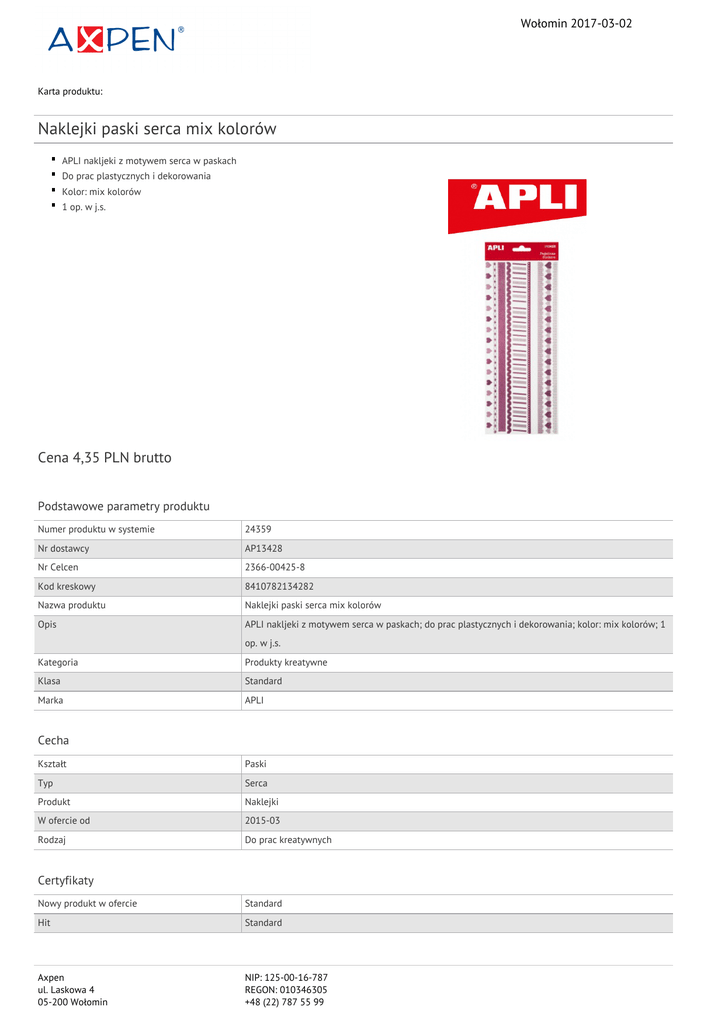 Wołomin 2017-03-02 Karta produktu: Naklejki paski serca mix kolorów APLI nakljeki z motywem serca w paskach Do prac plastycznych i dekorowania Kolor: mix kolorów 1 op. w j.s. Cena 4,35 PLN brutto Podstawowe parametry produktu Numer produktu w systemie 24359 Nr dostawcy AP13428 Nr Celcen 2366-00425-8 Kod kreskowy 8410782134282 Nazwa produktu Naklejki paski serca mix kolorów Opis APLI nakljeki z motywem serca w paskach; do prac plastycznych i dekorowania; kolor: mix kolorów; 1 op. w j.s. Kategoria Produkty kreatywne Klasa Standard Marka APLI Cecha Kształt Paski Typ Serca Produkt Naklejki W ofercie od 2015-03 Rodzaj Do prac kreatywnych Certyfikaty Nowy produkt w ofercie Standard Hit Standard Axpen ul. Laskowa 4 05-200 Wołomin NIP: 125-00-16-787 REGON: 010346305 +48 (22) 787 55 99 Wołomin 2017-03-02 Karta katalogowa produktu cd. Naklejki paski serca mix kolorów Kolor Kolor Mix kolorów Serdecznie zapraszamy do współpracy Axpen zespół. Axpen ul. Laskowa 4 05-200 Wołomin NIP: 125-00-16-787 REGON: 010346305 +48 (22) 787 55 99