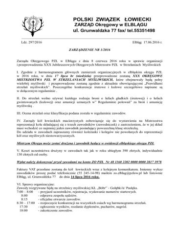 POLSKI ZWIĄZEK ŁOWIECKI ZARZĄD Okręgowy w ELBLĄGU ul. Grunwaldzka 77 fax/ tel.55351498 Elbląg 17.06.2016 r. Ldz. 297/2016 ZARZĄDZENIE NR 1/2016 Zarządu Okręgowego PZŁ w Elblągu z dnia 8 czerwca 2016 roku w sprawie organizacji i przeprowadzenia XXX Jubileuszowych Okręgowych Mistrzostw PZŁ w Strzelaniach Myśliwskich I. Zgodnie z harmonogramem głównych zamierzeń organizacyjnych w elbląskim okręgu PZŁ w 2016 roku, w dniu 17 lipca br (niedziela) przeprowadzone zostaną XXX OKRĘGOWE MISTRZOSTWA PZŁ W STRZELANIACH MYŚLIWSKICH, które obejmowały będą pełny wielobój myśliwski i przeprowadzone zostaną zgodnie z aktualnie obowiązującymi „Prawidłami strzelań myśliwskich”. Poszczególne konkurencje śrutowe i kulowe szczegółowo napisane są w dołączonym regulaminie . II. Do strzelań wolno używać każdego rodzaju broni o lufach gładkich (śrutowej) i o lufach gwintowanych (kulowej) oraz amunicji uznanych w” Regulaminie polowań” za broń i amunicję myśliwską . III. Ocena strzelań oraz klasyfikacja podana została w regulaminie zawodów. IV. Zarządy kół łowieckich macierzystych zobowiązuje się do wystawienia na Mistrzostwa reprezentacji koła składającej się z trzech zawodników (zawodniczek) z zastrzeżeniem, że w jej skład musi wchodzić co najmniej jeden zawodnik posiadający powszechną klasę strzelecką. Do udziału w zawodach zapraszamy również koleżanki i kolegów nie powołanych do reprezentacji kół oraz myśliwych niestowarzyszonych. Mistrzem Okręgu może zostać drużyna i zawodnik będący w ewidencji elbląskiego okręgu PZŁ V. Koszt uczestnictwa drużyny w zawodach tak jak w roku ubiegłym 390 złotych, indywidualnie 130 złotych od osoby. Wpłat należy dokonywać przed zawodami na konto ZO PZŁ Nr 48 1160 2202 0000 0000 2817 3978 Faktury VAT przesłane zostaną do kół łowieckich wraz z kolejnym komunikatem. Imienny wykaz zawodników proszę podać telefonicznie (55 245-14-98) mailem [email protected] lub listownie Elbląg, ul. Grunwaldzka 77 do dnia 14 lipca 2016 roku. VI. Sprawy organizacyjne: Zawody rozgrywane będą na strzelnicy myśliwskiej KŁ „Bóbr” - Gołąbki k/ Pasłęka. 7:00 – 8:00 - przyjazd uczestników, rejestracja, wydawanie numerów startowych. 8:00 - odprawa zespołu sędziów. 8:15 - oficjalne otwarcie zawodów. 8:30 – 17:00 - rozpoczęcie konkurencji na wszystkich osiach wg harmonogramu strzelań. 17:30 - ogłoszenie wyników, rozdanie dyplomów, pucharów, nagród. 18:00 - zakończenie zawodów. UWAGA Każdy zawodnik w trakcie strzelań powinien zakładać czapkę, okulary ochronne i ochronniki słuchu podczas strzelań kulowych. VII. Zarząd Okręgowy PZŁ powołał następujące osoby funkcyjne zawodów: Sędzia Główny Sekretariat Skarbnik Lekarz/ratownik medyczny Andrzej Kutkiewicz Aleksander Rybczyński, Halina Szymańska-Płonka, Paweł Wiśniewski Elżbieta Poleszuk Piotr Wiśniewski Sędziowie stanowiskowi : Rogacz lis Przebieg dzika Przebieg zająca Oś myśliwska Krąg myśliwski Przeloty Sędzia rezerwowy Grzegorz Orłowski, Zenon Ficak, Marian Kozikowski Zbigniew Grudziński, Marian Piecek, Jan Adamczyk Sławomir Wajda, Jacek Dorosz, Stanisław Górka Stanisław Stopczyński,Mirosław Domański, Ryszard Gajownik, Michał Król Andrzej Rynkowski, Zygmunt Klepando, Piotr Kubera, Zygmunt Zinkiewicz Andrzej Walotka, Tadeusz Zinkiewicz, Tadeusz Rudziński Jan Staniszewski Kolegów sędziów prosimy o wystąpienie w mundurach organizacyjnych i zabrane książeczek sędziowskich. DARZ BÓR Wieńczysław Tylkowski Łowczy Okręgowy