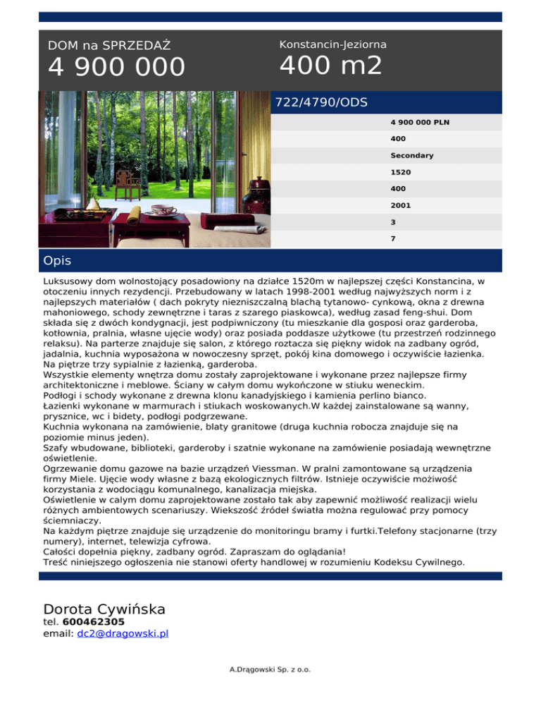 DOM na SPRZEDAŻ 4 900 000 Konstancin-Jeziorna 400 m2 722/4790/ODS 4 900 000 PLN 400 Secondary 1520 400 2001 3 7 Opis Luksusowy dom wolnostojący posadowiony na działce 1520m w najlepszej części Konstancina, w otoczeniu innych rezydencji. Przebudowany w latach 1998-2001 według najwyższych norm i z najlepszych materiałów ( dach pokryty niezniszczalną blachą tytanowo- cynkową, okna z drewna mahoniowego, schody zewnętrzne i taras z szarego piaskowca), według zasad feng-shui. Dom składa się z dwóch kondygnacji, jest podpiwniczony (tu mieszkanie dla gosposi oraz garderoba, kotłownia, pralnia, własne ujęcie wody) oraz posiada poddasze użytkowe (tu przestrzeń rodzinnego relaksu). Na parterze znajduje się salon, z którego roztacza się piękny widok na zadbany ogród, jadalnia, kuchnia wyposażona w nowoczesny sprzęt, pokój kina domowego i oczywiście łazienka. Na piętrze trzy sypialnie z łazienką, garderoba. Wszystkie elementy wnętrza domu zostały zaprojektowane i wykonane przez najlepsze firmy architektoniczne i meblowe. Ściany w całym domu wykończone w stiuku weneckim. Podłogi i schody wykonane z drewna klonu kanadyjskiego i kamienia perlino bianco. Łazienki wykonane w marmurach i stiukach woskowanych.W każdej zainstalowane są wanny, prysznice, wc i bidety, podłogi podgrzewane. Kuchnia wykonana na zamówienie, blaty granitowe (druga kuchnia robocza znajduje się na poziomie minus jeden). Szafy wbudowane, biblioteki, garderoby i szatnie wykonane na zamówienie posiadają wewnętrzne oświetlenie. Ogrzewanie domu gazowe na bazie urządzeń Viessman. W pralni zamontowane są urządzenia firmy Miele. Ujęcie wody własne z bazą ekologicznych filtrów. Istnieje oczywiście możiwość korzystania z wodociągu komunalnego, kanalizacja miejska. Oświetlenie w calym domu zaprojektowane zostało tak aby zapewnić możliwość realizacji wielu różnych ambientowych scenariuszy. Wiekszość źródeł światła można regulować przy pomocy ściemniaczy. Na każdym piętrze znajduje się urządzenie do monitoringu bramy i furtki.Telefony stacjonarne (trzy numery), internet, telewizja cyfrowa. Całości dopełnia piękny, zadbany ogród. Zapraszam do oglądania! Treść niniejszego ogłoszenia nie stanowi oferty handlowej w rozumieniu Kodeksu Cywilnego. Dorota Cywińska tel. 600462305 email: [email protected] A.Drągowski Sp. z o.o. A.Drągowski Sp. z o.o. Powered by TCPDF (www.tcpdf.org)