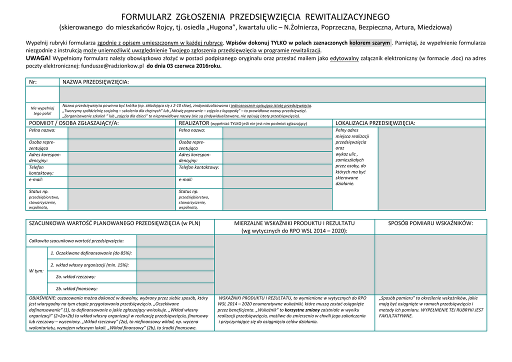 FORMULARZ ZGŁOSZENIA PRZEDSIĘWZIĘCIA REWITALIZACYJNEGO (skierowanego do mieszkańców Rojcy, tj. osiedla „Hugona”, kwartału ulic – N.Żołnierza, Poprzeczna, Bezpieczna, Artura, Miedziowa) Wypełnij rubryki formularza zgodnie z opisem umieszczonym w każdej rubryce. Wpisów dokonuj TYLKO w polach zaznaczonych kolorem szarym . Pamiętaj, że wypełnienie formularza niezgodnie z instrukcją może uniemożliwić uwzględnienie Twojego zgłoszenia przedsięwzięcia w programie rewitalizacji. UWAGA! Wypełniony formularz należy obowiązkowo złożyć w postaci podpisanego oryginału oraz przesłać mailem jako edytowalny załącznik elektroniczny (w formacie .doc) na adres poczty elektronicznej: [email protected] do dnia 03 czerwca 2016roku. Nr: NAZWA PRZEDSIĘWZIĘCIA: Nazwa przedsięwzięcia powinna być krótka (np. składająca się z 2-10 słów), zindywidualizowana i jednoznacznie opisująca istotę przedsięwzięcia. „Tworzymy spółdzielnię socjalną – szkolenia dla chętnych” lub „Mówię poprawnie – zajęcia z logopedą” – to prawidłowe nazwy przedsięwzięć. „Zorganizowanie szkoleń ” lub „zajęcia dla dzieci” to nieprawidłowe nazwy (nie są zindywidualizowane, nie opisują istoty przedsięwzięcia). Nie wypełniaj tego pola! PODMIOT / OSOBA ZGŁASZAJĄCY/A: REALIZATOR (wypełniać TYLKO jeśli nie jest nim podmiot zgłaszający) LOKALIZACJA PRZEDSIĘWZIĘCIA: Pełna nazwa: Pełna nazwa: Osoba reprezentująca Adres korespondencyjny: Telefon kontaktowy: e-mail: Osoba reprezentująca Adres korespondencyjny: Telefon kontaktowy: Pełny adres miejsca realizacji przedsięwzięcia oraz wykaz ulic , zamieszkałych przez osoby, do których ma być skierowane działanie. e-mail: Status np. Status np. przedsiębiorstwo, stowarzyszenie, wspólnota, przedsiębiorstwo, stowarzyszenie, wspólnota, SZACUNKOWA WARTOŚĆ PLANOWANEGO PRZEDSIĘWZIĘCIA (w PLN) MIERZALNE WSKAŹNIKI PRODUKTU I REZULTATU (wg wytycznych do RPO WSL 2014 – 2020): SPOSÓB POMIARU WSKAŹNIKÓW: Całkowita szacunkowa wartość przedsięwzięcia: 1. Oczekiwane dofinansowanie (do 85%): 2. wkład własny organizacji (min. 15%): W tym: 2a. wkład rzeczowy: 2b. wkład finansowy: OBJAŚNIENIE: oszacowania można dokonać w dowolny, wybrany przez siebie sposób, który jest wiarygodny na tym etapie przygotowania przedsięwzięcia. „Oczekiwane dofinansowanie” (1), to dofinansowanie o jakie zgłaszający wnioskuje. „Wkład własny organizacji” (2=2a+2b) to wkład własny organizacji w realizację przedsięwzięcia, finansowy lub rzeczowy – wyceniony. „Wkład rzeczowy” (2a), to niefinansowy wkład, np. wycena wolontariatu, wynajem własnym lokali. „Wkład finansowy” (2b), to środki finansowe. WSKAŹNIKI PRODUKTU I REZULTATU, to wymienione w wytycznych do RPO WSL 2014 – 2020 enumeratywne wskaźniki, które muszą zostać osiągnięte przez beneficjenta. „Wskaźnik” to korzystne zmiany zaistniałe w wyniku realizacji przedsięwzięcia, możliwe do zmierzenia w chwili jego zakończenia i przyczyniające się do osiągnięcia celów działania. „Sposób pomiaru” to określenie wskaźników, jakie mają być osiągnięte w ramach przedsięwzięcia i metody ich pomiaru. WYPEŁNIENIE TEJ RUBRYKI JEST FAKULTATYWNE. PEŁNY OPIS PRZEDSIĘWZIĘCIA wraz z rozpoznanymi problemami w środowisku, sposobem jego rozwiązania, przeciwdziałania oraz harmonogramem rzeczowo – finansowym. Pełny opis jest fakultatywny. Powinien on zawierać szerszą informację o przedsięwzięciu, pozwalającą wyrobić sobie zdanie o jego sensowności, trafnym wpisaniu w proces włączenia społecznego i celowości jego dofinansowania. W szczególności w opisie należy zawrzeć informacje opis diagnozę społeczeństwa, tj. istniejące problemy, sposób przeciwdziałania – zgodnie z przeprowadzonym badaniem środowiska, wywiadem wśród osób, które będą objęte działaniem, ich oczekiwania. Harmonogram rzeczowo - finansowy musi być zgodny z szacunkowa wartością przedsięwzięcia. Tutaj należy opisać działania, czynności jakie będą realizowane, ilość, koszt oraz termin/okres realizacji. o harmonogramie, etapach, szerszym oddziaływaniach, a także analiza ryzyka, powiązanie z innymi przedsięwzięciami i doświadczenie realizatora uprawdopodobniające sukces przedsięwzięcia. OPIS STANU ISTNIEJĄCEGO. Należy krótko scharakteryzować stan obecny, tj. zjawiska kryzysowe, na które przedsięwzięcie ma oddziaływać pozytywnie. CEL JAKI MA OSIĄGNIĄĆ PRZEDSIĘWZIĘCIE. Cel ma mieć charakter konkretny i mierzalny. Co chcemy osiągnąć? CHARAKTERYSTYKA PRZEDSIĘWZIĘCIA. Należy wymienić i krótko opisać działania, jakie będą podejmowane w ramach przedsięwzięcia. HARMONOGRAM RZECZOWO – FINANSOWY. Planowane rozpoczęcie, planowane zakończenie. Proszę o ujęcie zaproponowanego przeze mnie przedsięwzięcia w Gminnym Programie Rewitalizacji dla Gminy Radzionków. PIECZĘĆ FIRMOWA PODMIOTU (jeśli dotyczy): W wersji elektronicznej rubrykę proszę pozostawić PUSTĄ DATA podpisania przez osobę uprawnioną: PODPIS OSOBY UPRAWNIONEJ: W wersji elektronicznej rubrykę proszę pozostawić PUSTĄ Wyrażam zgodę, zgodnie z ustawą z dnia 29 sierpnia 1997 roku o ochronie danych osobowych (Dz. U. z 2015 r. poz. 2135 ze zm.) na przetwarzanie moich danych osobowych dla potrzeb niezbędnych do ujęcia w/w przedsięwzięcia w programie rewitalizacji. Podpisy wszystkich osób, których dane osobowe zawiera formularz zgłoszenia: (w wersji elektronicznej rubrykę proszę pozostawić PUSTĄ) Wszystkie pola formularza należy wypełnić (czytelnie/komputerowo) i po podpisaniu przez uprawnioną/zgłaszającą osobę/y oryginał złożyć lub przesłać do Zespołu ds. Funduszy Zewnętrznych i Zamówień Publicznych Urzędu Miasta Radzionków, ul. Męczenników Oświęcimia 42, 41-922 Radzionków do dnia 03 czerwca 2016 roku (decyduje data wpływu do Biura). Dodatkowo prosimy o przesłanie fo