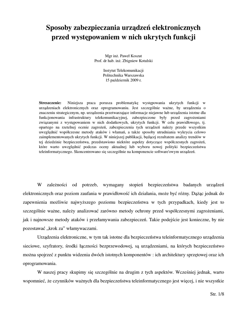Sposoby zabezpieczania urządzeń elektronicznych przed występowaniem w nich ukrytych funkcji Mgr inż. Paweł Koszut Prof. dr hab. inż. Zbigniew Kotulski Instytut Telekomunikacji Politechnika Warszawska 15 październik 2009 r. Streszczenie: Niniejsza praca porusza problematykę występowania ukrytych funkcji w urządzeniach elektronicznych oraz oprogramowaniu. Jest szczególnie ważne, by urządzenia o znaczeniu strategicznym, np. urządzenia przetwarzające informacje niejawne lub urządzenia istotne dla funkcjonowania infrastruktury telekomunikacyjnej, zabezpieczone były przed zagrożeniami związanymi z występowaniem w nich dodatkowych, ukrytych funkcji. W celu prawidłowego, tj. opartego na rzetelnej ocenie zagrożeń, zabezpieczenia tych urządzeń należy przede wszystkim uwzględnić współczesne metody ataków i włamań, a także sposoby utrudniania wykrycia celowo zaimplementowanych ukrytych funkcji. W niniejszej publikacji, będącej rezultatem analizy trendów w tej dziedzinie bezpieczeństwa, przedstawiono niektóre aspekty dotyczące współczesnych zagrożeń, które warto uwzględnić podczas oceny aktualnej lub wyboru nowej polityki bezpieczeństwa teleinformatycznego. Skoncentrowano się szczególnie na komponencie software'owym urządzeń. W zależności od potrzeb, wymagany stopień bezpieczeństwa badanych urządzeń elektronicznych oraz poziom zaufania w prawidłowość ich działania, może być różny. Dążąc jednak do zapewnienia możliwie najwyższego poziomu bezpieczeństwa w tych przypadkach, kiedy jest to szczególnie ważne, należy analizować zarówno metody ochrony przed współczesnymi zagrożeniami, jak i najnowsze metody ataków i przełamywania zabezpieczeń. Takie podejście jest konieczne, by nie pozostawać „krok za” włamywaczami. Urządzenia elektroniczne, w tym tak istotne dla bezpieczeństwa teleinformatycznego urządzenia sieciowe, szyfratory, środki łączności bezprzewodowej, są urządzeniami, na których bezpieczeństwo można spojrzeć z punktu widzenia dwóch istotnych komponentów : ich architektury sprzętowej oraz ich oprogramowania. W naszej pracy skupimy się szczególnie na drugim z tych aspektów. Wcześniej jednak, warto wspomnieć, że czynników ważnych dla bezpieczeństwa teleinformatycznego jest więcej, i nie wszystkie Str. 1/8 są czynnikami technicznymi. Np. : • stopień zaufania do producenta – przykładowo, dla urządzeń niejawnych wymaga się, by ich producent posiadał ważne poświadczenie bezpieczeństwa przemysłowego, wydane przez właściwą Służbę Ochrony Państwa (ABW lub SKW). • relacje handlowe z innymi firmami, w szczególności zagranicznymi – dostawcy podzespołów elektronicznych, potrzebnych do budowy urządzeń, mogą stanowić potencjalne źródło zagrożeń. Dalsza część pracy dotyczy technicznych aspektów bezpieczeństwa. Przedstawione zostaną niektóre metody używane do przeprowadzania ataków, przełamywania zabezpieczeń i ukrywania dodatkowych funkcji w systemach i urządzeniach elektronicznych. Zapoznanie się z tymi metodami umożliwia lepszy dobór i skuteczniejsze zastosowanie środków zaradczych. Oprogramowanie stanowi istotny element wpływający na bezpieczeństwo urządzeń telekomunikacyjnych. Routery, switche, firewall'e, szyfratory VPN, i inne urządzenia posiadają swoje oprogramowanie – jest na nich zainstalowany system operacyjny. Niektórzy producenci tworzą własny system operacyjny, np. system Cisco IOS stosowany w urządzeniach sieciowych firmy Cisco, a inni korzystają z jednego z dostępnych już systemów, np. Linux, OpenBSD i modyfikują go na potrzeby budowanego sprzętu – np. Linux w urządzeniach sieciowych firmy Barracuda. Bezpieczeństwo oprogramowania jest również istotne dla wielu zwykłych użytkowników komputerów osobistych PC. W sferze bezpieczeństwa oprogramowania, coraz istotniejszym problemem staje się wpływ tzw. zerodniowych luk bezpieczeństwa (ang. zeroday security vulnerabilities). Poniżej zjawisko to zostanie bliżej przedstawione, dla lepszego jego zrozumienia. Powszechnie uważa się, że w celu ochrony np. swojego komputera osobistego PC, należy regularnie uaktualniać oprogramowanie i wprowadzać udostępniane przez producenta łatki systemowe. Uaktualnianie komputera ma chronić przed znajdowanymi dziurami bezpieczeństwa. Rzeczywiście jest to dobry nawyk i podwyższa on poziom bezpieczeństwa. Pójdźmy jednak dalej za ideą przyświecającą napisaniu tej publikacji i przeanalizujmy jakie konsekwencję dla atakującego pociąga za sobą taki stan obowiązujących dziś praktyk w dziedzinie bezpieczeństwa IT. Zadajmy sobie więc pytanie czym teraz atakujący mogą nas zaskoczyć? Przede wszystkim warto zwrócić uwagę na kilka prostych spostrzeżeń dotyczących wspomnianej praktyki uaktualniania oprogramowania. Mianowicie, licząc od czasu, gdy Str. 2/8 opublikowana została informacja o występowaniu krytycznej luki bezpieczeństwa, użytkownicy danego oprogramowania uaktualniają je, a zatem : 1) ilość zabezpieczonych komputerów zwiększa się w miarę upływającego czasu (rys. nr 1), 2) ilość komputerów podatnych na włamanie zmniejsza się (rys. nr 2), Rysunek 2 Rysunek 1 3) przed chwilą czasu, gdy opublikowana została informacja o luce systemowej, ilość podatnych komputerów wynosiła 100% (rys. nr 3). Rysunek 3 Dla atakującego, ze spostrzeżeń nr 1 i 2 wynika, że posiadana przez niego informacja o danej luce w oprogramowaniu jest tym groźniejsza (tym skuteczniejsza), im mniej czasu upłynęło od momentu jej Str. 3/8 opublikowania. Ze spostrzeżenia nr 3 wynika, że najcenniejsze dla atakującego i zarazem najgroźniejsze dla użytkowników są te luki, które jeszcze nie zostały opublikowane*. Są to właśnie tzw. luki zerodniowe. Innymi słowy, jeżeli informacja o krytycznej luce pojawiła się np. 15 marca 2009, to następnego dnia, tj. 16 marca 2009 krytyczna luka jest ba