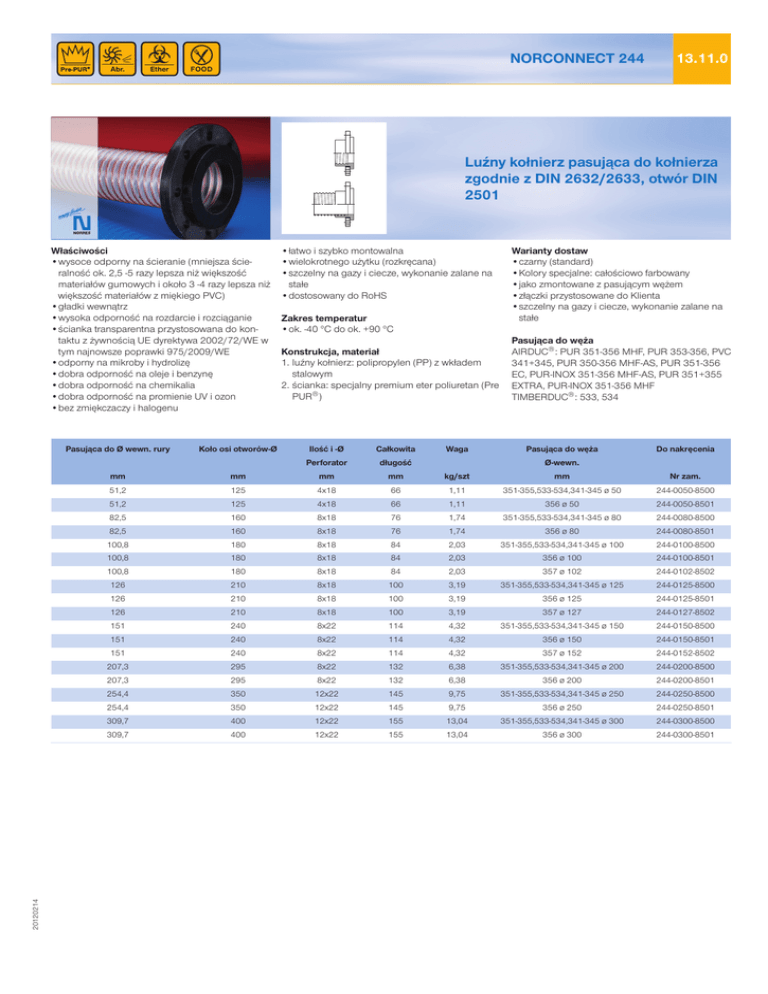 NORCONNECT 244 Abr. Ether 13.11.0 FOOD Luźny kołnierz pasująca do kołnierza zgodnie z DIN 2632/2633, otwór DIN 2501 Właściwości •wysoce odporny na ścieranie (mniejsza ścieralność ok. 2,5 -5 razy lepsza niż większość materiałów gumowych i około 3 -4 razy lepsza niż większość materiałów z miękiego PVC) •gładki wewnątrz •wysoka odporność na rozdarcie i rozciąganie •ścianka transparentna przystosowana do kontaktu z żywnością UE dyrektywa 2002/72/WE w tym najnowsze poprawki 975/2009/WE •odporny na mikroby i hydrolizę •dobra odporność na oleje i benzynę •dobra odporność na chemikalia •dobra odporność na promienie UV i ozon •bez zmiękczaczy i halogenu 20120214 Pasująca do Ø wewn. rury Koło osi otworów-Ø •łatwo i szybko montowalna •wielokrotnego użytku (rozkręcana) •szczelny na gazy i ciecze, wykonanie zalane na stałe •dostosowany do RoHS Zakres temperatur •ok. -40 °C do ok. +90 °C Konstrukcja, materiał 1. luźny kołnierz: polipropylen (PP) z wkładem stalowym 2. ścianka: specjalny premium eter poliuretan (Pre PUR® ) Ilość i -Ø Całkowita Perforator długość Waga Warianty dostaw •czarny (standard) •Kolory specjalne: całościowo farbowany •jako zmontowane z pasującym wężem •złączki przystosowane do Klienta •szczelny na gazy i ciecze, wykonanie zalane na stałe Pasująca do węża AIRDUC® : PUR 351-356 MHF, PUR 353-356, PVC 341+345, PUR 350-356 MHF-AS, PUR 351-356 EC, PUR-INOX 351-356 MHF-AS, PUR 351+355 EXTRA, PUR-INOX 351-356 MHF TIMBERDUC® : 533, 534 Pasująca do węża Do nakręcenia Ø-wewn. mm mm mm mm kg/szt mm Nr zam. 51,2 125 4x18 66 1,11 351-355,533-534,341-345 ø 50 244-0050-8500 51,2 125 4x18 66 1,11 356 ø 50 244-0050-8501 82,5 160 8x18 76 1,74 351-355,533-534,341-345 ø 80 244-0080-8500 82,5 160 8x18 76 1,74 356 ø 80 244-0080-8501 100,8 180 8x18 84 2,03 351-355,533-534,341-345 ø 100 244-0100-8500 100,8 180 8x18 84 2,03 356 ø 100 244-0100-8501 100,8 180 8x18 84 2,03 357 ø 102 244-0102-8502 126 210 8x18 100 3,19 351-355,533-534,341-345 ø 125 244-0125-8500 126 210 8x18 100 3,19 356 ø 125 244-0125-8501 126 210 8x18 100 3,19 357 ø 127 244-0127-8502 151 240 8x22 114 4,32 351-355,533-534,341-345 ø 150 244-0150-8500 151 240 8x22 114 4,32 356 ø 150 244-0150-8501 151 240 8x22 114 4,32 357 ø 152 244-0152-8502 207,3 295 8x22 132 6,38 351-355,533-534,341-345 ø 200 244-0200-8500 207,3 295 8x22 132 6,38 356 ø 200 244-0200-8501 254,4 350 12x22 145 9,75 351-355,533-534,341-345 ø 250 244-0250-8500 254,4 350 12x22 145 9,75 356 ø 250 244-0250-8501 309,7 400 12x22 155 13,04 351-355,533-534,341-345 ø 300 244-0300-8500 309,7 400 12x22 155 13,04 356 ø 300 244-0300-8501