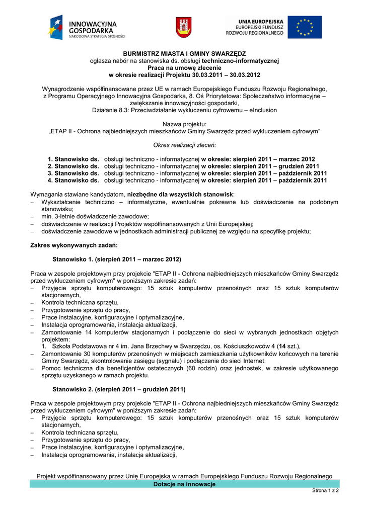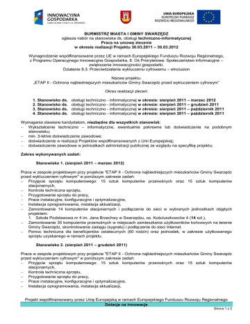 BURMISTRZ MIASTA I GMINY SWARZĘDZ ogłasza nabór na stanowiska ds. obsługi techniczno-informatycznej Praca na umowę zlecenie w okresie realizacji Projektu 30.03.2011 – 30.03.2012 Wynagrodzenie współfinansowane przez UE w ramach Europejskiego Funduszu Rozwoju Regionalnego, z Programu Operacyjnego Innowacyjna Gospodarka, 8. Oś Priorytetowa: Społeczeństwo informacyjne – zwiększanie innowacyjności gospodarki, Działanie 8.3: Przeciwdziałanie wykluczeniu cyfrowemu – eInclusion Nazwa projektu: „ETAP II - Ochrona najbiedniejszych mieszkańców Gminy Swarzędz przed wykluczeniem cyfrowym” Okres realizacji zleceń: 1. Stanowisko ds. 2. Stanowisko ds. 3. Stanowisko ds. 4. Stanowisko ds. obsługi techniczno - informatycznej w okresie: sierpień 2011 – marzec 2012 obsługi techniczno - informatycznej w okresie: sierpień 2011 – grudzień 2011 obsługi techniczno - informatycznej w okresie: sierpień 2011 – październik 2011 obsługi techniczno - informatycznej w okresie: sierpień 2011 – październik 2011 Wymagania stawiane kandydatom, niezbędne dla wszystkich stanowisk: Wykształcenie techniczno – informatyczne, ewentualnie pokrewne lub doświadczenie na podobnym stanowisku; min. 3-letnie doświadczenie zawodowe; doświadczenie w realizacji Projektów współfinansowanych z Unii Europejskiej; doświadczenie zawodowe w jednostkach administracji publicznej ze względu na specyfikę projektu; Zakres wykonywanych zadań: Stanowisko 1. (sierpień 2011 – marzec 2012) Praca w zespole projektowym przy projekcie "ETAP II - Ochrona najbiedniejszych mieszkańców Gminy Swarzędz przed wykluczeniem cyfrowym" w poniższym zakresie zadań: Przyjęcie sprzętu komputerowego: 15 sztuk komputerów przenośnych oraz 15 sztuk komputerów stacjonarnych, Kontrola techniczna sprzętu, Przygotowanie sprzętu do pracy, Prace instalacyjne, konfiguracyjne i optymalizacyjne, Instalacja oprogramowania, instalacja aktualizacji, Zamontowanie 14 komputerów stacjonarnych i podłączenie do sieci w wybranych jednostkach objętych projektem: 1. Szkoła Podstawowa nr 4 im. Jana Brzechwy w Swarzędzu, os. Kościuszkowców 4 (14 szt.), Zamontowanie 30 komputerów przenośnych w miejscach zamieszkania użytkowników końcowych na terenie Gminy Swarzędz, skontrolowanie zasięgu (sygnału) i podłączenie do sieci Internet. Pomoc techniczna dla beneficjentów ostatecznych (60 rodzin) oraz jednostek, w zakresie użytkowanego sprzętu uzyskanego w ramach projektu. Stanowisko 2. (sierpień 2011 – grudzień 2011) Praca w zespole projektowym przy projekcie "ETAP II - Ochrona najbiedniejszych mieszkańców Gminy Swarzędz przed wykluczeniem cyfrowym" w poniższym zakresie zadań: Przyjęcie sprzętu komputerowego: 15 sztuk komputerów przenośnych oraz 15 sztuk komputerów stacjonarnych, Kontrola techniczna sprzętu, Przygotowanie sprzętu do pracy, Prace instalacyjne, konfiguracyjne i optymalizacyjne, Instalacja oprogramowania, instalacja aktualizacji, Projekt współfinansowany przez Unię Europejską w ramach Europejskiego Funduszu Rozwoju Regionalnego Dotacje na innowacje Strona 1 z 2 Zamontowanie 18 komputerów stacjonarnych i podłączenie do sieci w wybranych jednostkach objętych projektem: 1. Ośrodek Pomocy Społecznej w Swarzędzu ul. Poznańska 25 (4 sztuk), 2. Biblioteka Publiczna w Swarzędzu, os. Czwartaków 1, (2 szt.) oraz jej filie (12 szt.): a. Filia Biblioteki Publicznej Uzarzewo ul. Akacjowa 14 (2 szt.), b. Filia Biblioteki Publicznej Paczkowo ul. Zapłocie 6 (2 szt.), c. Filia Biblioteki Publicznej Zalasewo ul. Kórnicka 220 (2 szt.), d. Filia Biblioteki Publicznej Swarzędz - Nowa Wieś ul. Tortunia 5 a (2 szt.), e. Filia Biblioteki Publicznej Kobylnica ul. Dworcowa 2 (2 szt.), f. Filia Biblioteki Publicznej Swarzędz, os. Kościuszkowców 6 (2 szt.), Zamontowanie 30 komputerów przenośnych w miejscach zamieszkania użytkowników końcowych na terenie Gminy Swarzędz, skontrolowanie zasięgu (sygnału) i podłączenie do sieci Internet. Stanowisko 3. (sierpień 2011 – październik 2011) Praca w zespole projektowym przy projekcie "ETAP II - Ochrona najbiedniejszych mieszkańców Gminy Swarzędz przed wykluczeniem cyfrowym" w poniższym zakresie zadań: Przyjęcie sprzętu komputerowego: 15 sztuk komputerów przenośnych oraz 15 sztuk komputerów stacjonarnych, Kontrola techniczna sprzętu, Przygotowanie sprzętu do pracy, Prace instalacyjne, konfiguracyjne i optymalizacyjne, Instalacja oprogramowania, instalacja aktualizacji, Zamontowanie 14 komputerów stacjonarnych i podłączenie do sieci w wybranych jednostkach objętych projektem: 1. Szkoła Podstawowa nr 1 im. Stanisława Staszica w Swarzędzu, ul. Zamkowa 20 (14 szt.), Stanowisko 4. (sierpień 2011 – październik 2011) Praca w zespole projektowym przy projekcie "ETAP II - Ochrona najbiedniejszych mieszkańców Gminy Swarzędz przed wykluczeniem cyfrowym" w poniższym zakresie zadań: Przyjęcie sprzętu komputerowego: 15 sztuk komputerów przenośnych oraz 15 sztuk komputerów stacjonarnych, Kontrola techniczna sprzętu, Przygotowanie sprzętu do pracy, Prace instalacyjne, konfiguracyjne i optymalizacyjne, Instalacja oprogramowania, instalacja aktualizacji, Zamontowanie 14 komputerów stacjonarnych i podłączenie do sieci w jednostkach objętych projektem: 1. Szkoła Podstawowa nr 5 im. Adama Wodziczki w Swarzędzu, os. Mielżyńskiego 1 (14 szt.). Wymagane dokumenty (dla każdego ze stanowisk): CV oświadczenie zawierające zgodę na przetwarzanie danych osobowych na potrzeby związane z ogłoszonym naborem, kopia dowodu osobistego, kopie dokumentów potwierdzających wykształcenie, kwalifikacje i doświadczenie zawodowe Na zgłoszenie, z określeniem którego stanowiska dotyczy, oczekujemy w terminie do dnia 29 lipca 2011r. (decyduje data wpływu do Urzędu Miasta i Gminy w Swarzędzu) pod adresem: Urząd Miasta i Gminy w Swarzędzu Ul. Rynek 1 62-020 Swarzędz Nr ref. RNWK.042-0002/062/2011 Dodatkowe Informacje: Adam