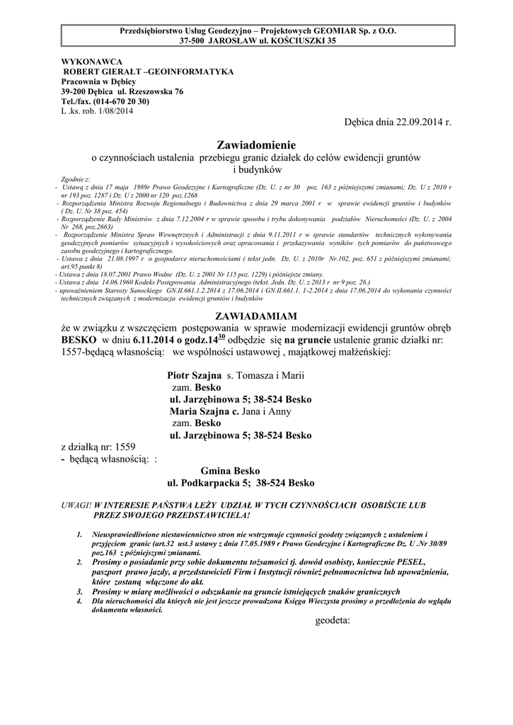 Przedsiębiorstwo Usług Geodezyjno – Projektowych GEOMIAR Sp. z O.O. 37-500 JAROSŁAW ul. KOŚCIUSZKI 35 WYKONAWCA ROBERT GIERAŁT –GEOINFORMATYKA Pracownia w Dębicy 39-200 Dębica ul. Rzeszowska 76 Tel./fax. (014-670 20 30) L .ks. rob. 1/08/2014 Dębica dnia 22.09.2014 r. Zawiadomienie o czynnościach ustalenia przebiegu granic działek do celów ewidencji gruntów i budynków Zgodnie z: - Ustawą z dnia 17 maja 1989r Prawo Geodezyjne i Kartograficzne (Dz. U. z nr 30 poz. 163 z późniejszymi zmianami; Dz. U z 2010 r nr 193 poz. 1287 i Dz. U z 2000 nr 120 poz.1268 - Rozporządzenia Ministra Rozwoju Regionalnego i Budownictwa z dnia 29 marca 2001 r w sprawie ewidencji gruntów i budynków ( Dz. U. Nr 38 poz. 454) - Rozporządzenie Rady Ministrów z dnia 7.12.2004 r w sprawie sposobu i trybu dokonywania podziałów Nieruchomości (Dz. U. z 2004 Nr 268, poz.2663) - Rozporządzenie Ministra Spraw Wewnętrznych i Administracji z dnia 9.11.2011 r w sprawie standartów technicznych wykonywania geodezyjnych pomiarów sytuacyjnych i wysokościowych oraz opracowania i przekazywania wyników tych pomiarów do państwowego zasobu geodezyjnego i kartograficznego. - Ustawa z dnia 21.08.1997 r o gospodarce nieruchomościami ( tekst jedn. Dz. U. z 2010r Nr.102, poz. 651 z późniejszymi zmianami; art.95.punkt 8) - Ustawa z dnia 18.07.2001 Prawo Wodne (Dz. U. z 2001 Nr 115 poz. 1229) i późniejsze zmiany. - Ustawa z dnia 14.06.1960 Kodeks Postępowania Administracyjnego (tekst. Jedn. Dz. U. z 2013 r nr 9 poz. 26.) - upoważnieniem Starosty Sanockiego GN.II.661.1.2.2014 z 17.06.2014 i GN.II.661.1. 1-2.2014 z dnia 17.06.2014 do wykonania czynności technicznych związanych z modernizacja ewidencji gruntów i budynków ZAWIADAMIAM że w związku z wszczęciem postępowania w sprawie modernizacji ewidencji gruntów obręb BESKO w dniu 6.11.2014 o godz.1430 odbędzie się na gruncie ustalenie granic działki nr: 1557-będącą własnością: we wspólności ustawowej , majątkowej małżeńskiej: Piotr Szajna s. Tomasza i Marii zam. Besko ul. Jarzębinowa 5; 38-524 Besko Maria Szajna c. Jana i Anny zam. Besko ul. Jarzębinowa 5; 38-524 Besko z działką nr: 1559 - będącą własnością: : Gmina Besko ul. Podkarpacka 5; 38-524 Besko UWAGI! W INTERESIE PAŃSTWA LEŻY UDZIAŁ W TYCH CZYNNOŚCIACH OSOBIŚCIE LUB PRZEZ SWOJEGO PRZEDSTAWICIELA! 1. Nieusprawiedliwione niestawiennictwo stron nie wstrzymuje czynności geodety związanych z ustaleniem i przyjęciem granic (art.32 ust.3 ustawy z dnia 17.05.1989 r Prawo Geodezyjne i Kartograficzne Dz. U .Nr 30/89 poz.163 z późniejszymi zmianami. 2. Prosimy o posiadanie przy sobie dokumentu tożsamości tj. dowód osobisty, koniecznie PESEL, paszport prawo jazdy, a przedstawicieli Firm i Instytucji również pełnomocnictwa lub upoważnienia, które zostaną włączone do akt. Prosimy w miarę możliwości o odszukanie na gruncie istniejących znaków granicznych 3. 4. Dla nieruchomości dla których nie jest jeszcze prowadzona Księga Wieczysta prosimy o przedłożenia do wglądu dokumentu własności. geodeta: Przedsiębiorstwo Usług Geodezyjno – Projektowych GEOMIAR Sp. z O.O. 37-500 JAROSŁAW ul. KOŚCIUSZKI 35 WYKONAWCA ROBERT GIERAŁT –GEOINFORMATYKA Pracownia w Dębicy 39-200 Dębica ul. Rzeszowska 76 Tel./fax. (014-670 20 30) L .ks. rob. 1/08/2014 Dębica dnia 22.09.2014 r. Zawiadomienie o czynnościach ustalenia przebiegu granic działek do celów ewidencji gruntów i budynków Zgodnie z: - Ustawą z dnia 17 maja 1989r Prawo Geodezyjne i Kartograficzne (Dz. U. z nr 30 poz. 163 z późniejszymi zmianami; Dz. U z 2010 r nr 193 poz. 1287 i Dz. U z 2000 nr 120 poz.1268 - Rozporządzenia Ministra Rozwoju Regionalnego i Budownictwa z dnia 29 marca 2001 r w sprawie ewidencji gruntów i budynków ( Dz. U. Nr 38 poz. 454) - Rozporządzenie Rady Ministrów z dnia 7.12.2004 r w sprawie sposobu i trybu dokonywania podziałów Nieruchomości (Dz. U. z 2004 Nr 268, poz.2663) - Rozporządzenie Ministra Spraw Wewnętrznych i Administracji z dnia 9.11.2011 r w sprawie standartów technicznych wykonywania geodezyjnych pomiarów sytuacyjnych i wysokościowych oraz opracowania i przekazywania wyników tych pomiarów do państwowego zasobu geodezyjnego i kartograficznego. - Ustawa z dnia 21.08.1997 r o gospodarce nieruchomościami ( tekst jedn. Dz. U. z 2010r Nr.102, poz. 651 z późniejszymi zmianami; art.95.punkt 8) - Ustawa z dnia 18.07.2001 Prawo Wodne (Dz. U. z 2001 Nr 115 poz. 1229) i późniejsze zmiany. - Ustawa z dnia 14.06.1960 Kodeks Postępowania Administracyjnego (tekst. Jedn. Dz. U. z 2013 r nr 9 poz. 26.) - upoważnieniem Starosty Sanockiego GN.II.661.1.2.2014 z 17.06.2014 i GN.II.661.1. 1-2.2014 z dnia 17.06.2014 do wykonania czynności technicznych związanych z modernizacja ewidencji gruntów i budynków ZAWIADAMIAM że w związku z wszczęciem postępowania w sprawie modernizacji ewidencji gruntów obręb BESKO w dniu 6.11.2014 o godz.1030 odbędzie się na gruncie ustalenie granic działki nr: 3730-będącą własnością: ¼ Elżbieta Kielar c. Grzegorza i Zofii zam. Besko ul. Sadowa 7; 38-524 Besko ¼ Kazimierz Kielar s. Grzegorza i Zofii zam. Katowice ul. Ściegiennego 51D/22 ; 40-114 Katowice ¼ Zofia Kielar c. Józefa i Antoniny zam. Besko ul. Jarzębinowa 10; 38-524 Besko ¼ Jolanta Kramarz c. Grzegorza i Zofii zam. Besko ul. Jarzębinowa 10; 38-524 Besko z działką nr: 3729/2 - będącą własnością: we wspólności ustawowej , majątkowej małżeńskiej: Jan Tadeusz Szałankiewicz s. Jana i Joanny zam. Besko ul. Jarzębinowa 6; 38-524 Besko Zofia Szałankiewicz c. Józefa i Marii zam. Besko ul. Jarzębinowa 6; 38-524 Besko UWAGI! W INTERESIE PAŃSTWA LEŻY UDZIAŁ W TYCH CZYNNOŚCIACH OSOBIŚCIE LUB PRZEZ SWOJEGO PRZEDSTAWICIELA! 1. Nieusprawiedliwione niestawiennictwo stron nie wstrzymuje czynności geodety związanych z ustaleniem i przyjęciem granic (art.32 ust.3 ustawy z dnia 17.05.1989 r Prawo Geodezyjne i Kartograficzne Dz. U .Nr