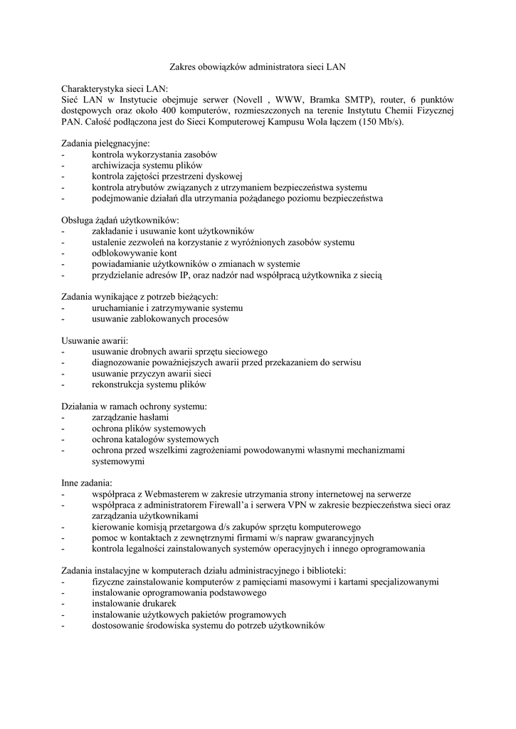 Zakres obowiązków administratora sieci LAN Charakterystyka sieci LAN: Sieć LAN w Instytucie obejmuje serwer (Novell , WWW, Bramka SMTP), router, 6 punktów dostępowych oraz około 400 komputerów, rozmieszczonych na terenie Instytutu Chemii Fizycznej PAN. Całość podłączona jest do Sieci Komputerowej Kampusu Wola łączem (150 Mb/s). Zadania pielęgnacyjne: kontrola wykorzystania zasobów archiwizacja systemu plików kontrola zajętości przestrzeni dyskowej kontrola atrybutów związanych z utrzymaniem bezpieczeństwa systemu podejmowanie działań dla utrzymania pożądanego poziomu bezpieczeństwa Obsługa żądań użytkowników: zakładanie i usuwanie kont użytkowników ustalenie zezwoleń na korzystanie z wyróżnionych zasobów systemu odblokowywanie kont powiadamianie użytkowników o zmianach w systemie przydzielanie adresów IP, oraz nadzór nad współpracą użytkownika z siecią Zadania wynikające z potrzeb bieżących: uruchamianie i zatrzymywanie systemu usuwanie zablokowanych procesów Usuwanie awarii: usuwanie drobnych awarii sprzętu sieciowego diagnozowanie poważniejszych awarii przed przekazaniem do serwisu usuwanie przyczyn awarii sieci rekonstrukcja systemu plików Działania w ramach ochrony systemu: zarządzanie hasłami ochrona plików systemowych ochrona katalogów systemowych ochrona przed wszelkimi zagrożeniami powodowanymi własnymi mechanizmami systemowymi Inne zadania: współpraca z Webmasterem w zakresie utrzymania strony internetowej na serwerze współpraca z administratorem Firewall’a i serwera VPN w zakresie bezpieczeństwa sieci oraz zarządzania użytkownikami kierowanie komisją przetargowa d/s zakupów sprzętu komputerowego pomoc w kontaktach z zewnętrznymi firmami w/s napraw gwarancyjnych kontrola legalności zainstalowanych systemów operacyjnych i innego oprogramowania Zadania instalacyjne w komputerach działu administracyjnego i biblioteki: fizyczne zainstalowanie komputerów z pamięciami masowymi i kartami specjalizowanymi instalowanie oprogramowania podstawowego instalowanie drukarek instalowanie użytkowych pakietów programowych dostosowanie środowiska systemu do potrzeb użytkowników