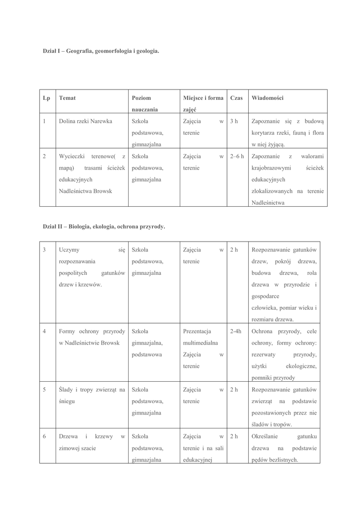 Dział I – Geografia, geomorfologia i geologia. Lp 1 Temat Dolina rzeki Narewka Poziom Miejsce i forma nauczania zajęć Szkoła Zajęcia podstawowa, terenie w Czas Wiadomości 3h Zapoznanie się z budową korytarza rzeki, fauną i flora w niej żyjącą. gimnazjalna 2 Wycieczki mapą) terenowe( z trasami ścieżek edukacyjnych Szkoła Zajęcia podstawowa, terenie w 2–6 h gimnazjalna Zapoznanie z walorami krajobrazowymi ścieżek edukacyjnych Nadleśnictwa Browsk zlokalizowanych na terenie Nadleśnictwa Dział II – Biologia, ekologia, ochrona przyrody. 3 Uczymy się rozpoznawania pospolitych gatunków Szkoła Zajęcia podstawowa, terenie w 2h Rozpoznawanie gatunków drzew, gimnazjalna pokrój budowa drzew i krzewów. drzewa, drzewa, rola drzewa w przyrodzie i gospodarce człowieka, pomiar wieku i rozmiaru drzewa. 4 Formy ochrony przyrody Szkoła Prezentacja w Nadleśnictwie Browsk gimnazjalna, multimedialna podstawowa Zajęcia 2-4h Ochrona przyrody, cele ochrony, formy ochrony: w rezerwaty przyrody, użytki terenie ekologiczne, pomniki przyrody 5 Ślady i tropy zwierząt na Szkoła Zajęcia śniegu podstawowa, terenie w 2h Rozpoznawanie gatunków zwierząt gimnazjalna na podstawie pozostawionych przez nie śladów i tropów. 6 Drzewa i krzewy zimowej szacie w Szkoła Zajęcia w podstawowa, terenie i na sali drzewa gimnazjalna edukacyjnej pędów bezlistnych. 2h Określanie gatunku na podstawie Pąki - rodzaje i rozmieszczenie 7 Przedwiośnie – jak poznać Szkoła Zajęcia tę porę roku podstawowa, terenie w 2h Rozpoznawanie pierwszych oznak wiosny gimnazjalna 8 Rośliny kwitnące wiosną Szkoła Zajęcia podstawowa, terenie w 2-3 h Rozpoznawanie gatunków roślin kwitnących wiosną gimnazjalna 9 Jesienne owoce drzew i Szkoła Zajęcia krzewów podstawowa, terenie w 2-3 h drzew Ptaki drapieżne - gry i Szkoła Zajęcia w sali zabawy podstawowa, edukacyjnej dotyczące tej gromady zwierząt i krzewów na podstawie ich owoców. gimnazjalna 10 Rozpoznawanie gatunków 3h Poznanie różnych gatunków ptaków drapieżnych i ich roli w gimnazjalna przyrodzie. 11 Bocian biały – biologia, Szkoła Zajęcia w sali ekologia gimnazjalna edukacyjnej, życia podstawowa zajęcia w terenie biologii, i środowisko życia. 3h Poznanie środowiska bociana białego, ekologii i ochrony. 12 Oko w oko z nietoperzem. Szkoła Zajęcia w sali gimnazjalna edukacyjnej. 2h Biologia, ekologia oraz ochrona nietoperzy. podstawowa 13 14 Bóbr – biologia i rola w Szkoła Zajęcia w sali środowisku gimnazjalna edukacyjnej i w obecności bobrów, ocena przyrodniczym. podstawowa terenie. skutków ich działalności. Pospolite gatunki ptaków Szkoła Zajęcia w sali spotykane zimą. gimnazjalna edukacyjnej i w ptaków po ich wyglądzie i podstawowa terenie. odgłosach. Omówienie problemów, z 3h 2-3 h Rozpoznawanie śladów Rozpoznawanie gatunków jakimi borykają się ptaki zimą oraz zasad dokarmiania ptaków. 15 Rośliny i zwierzęta chronione. 16 Fauna i flora Puszczy Szkoła Zajęcia na sali gimnazjalna edukacyjnej i w chronionych podstawowa terenie. roślin i zwierząt. Szkoła Zajęcia w sali 2h 2h Rozpoznawanie gatunków Zapoznanie z gatunkami Białowieskiej gimnazjalna roślin edukacyjnej i zwierząt występującymi na terenie podstawowa Puszczy Białowieskiej Dział III – Historia i kultura regionu. 17 Jaćwingowie – dawni mieszkańcy Szkoła Zajęcia podstawowa, terenie w 3h plemion Jaćwieskich, ich zwyczaje i obrzędy. gimnazjalna 18 Historia Poznać, pokochać, ocalić Szkoła Zajęcia w sali, od zapomnienia – mini podstawowa, zwiedzanie mini sprzętami, narzędziami i muzeum sprzętu leśnego gimnazjalna muzeum. przedmiotami używanymi 1-2 h Zapoznanie się z dawnymi w leśnictwie. Dział IV – Tematyka różna 19 20 Rady na odpady Zabawy i konkursy przyrodnicze dla Szkoła Zajęcia w sali podstawowa, (gry i zabawy, recykling, gimnazjalna quiz itp.) odpadów 1-2 h Szkoła 2-3 h podstawowa najmłodszych Segregacja odpadów, składowiska Poznanie trybu życia i zachowań wybranych gatunków roślin i zwierząt. 21 Zajęcia plastyczne Szkoła Zajęcia podstawowa plenerze w 1-2 h Kompozycje z różnych materiałów przyrodniczych, plenerowe malowanie krajobrazu 22 Filmy o tematyce przyrodniczej ekologicznej i Szkoła Zajęcia w Sali Tematyka przyrodnicza i podstawowa, lub w szkole ekologiczna gimnazjalna Mile widziane propozycje tematów przedstawionych przez Nauczycieli, chętnych do skorzystania z zajęć edukacyjnych w Nadleśnictwie.