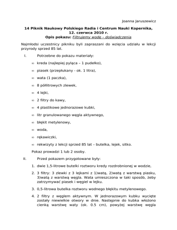 Joanna Jaruszewicz 14 Piknik Naukowy Polskiego Radia i Centrum Nauki Kopernika, 12. czerwca 2010 r. Opis pokazu: Filtrujemy wodę – doświadczenia Najmłodsi uczestnicy pikniku byli zapraszani do wzięcia udziału w lekcji przyrody sprzed 85 lat. I. Potrzebne do pokazu materiały: • kreda (najlepiej pyląca – 1 pudełko), • piasek (przepłukany - ok. 1 litra), • wata (1 paczka), • 8 półlitrowych zlewek, • 4 lejki, • 2 filtry do kawy, • 4 plastikowe jednorazowe kubki, • litr granulowanego węgla aktywnego, • błękit metylenowy, • woda, • rękawiczki, • rekwizyty z lekcji sprzed 85 lat – butelka, lejek, sitko. Pokaz prowadzi 1 lub 2 osoby. II. Przed pokazem przygotowane były: 1. dwie 1,5-litrowe butelki roztworu kredy rozdrobnionej w wodzie, 2. 3 filtry: 3 zlewki z 3 lejkami z 1)watą, 2)watą z warstwą piasku, 3)watą z warstwą węgla. Wata umieszczona w taki sposób, żeby zatrzymywać piasek i węgiel w lejku. 3. 0,5-litrowa butelka roztworu wodnego błękitu metylenowego. 4. 2 filtry z węglem aktywnym. W jednorazowym kubku wycięte zostały niewielkie otwory w dnie. Następnie do kubka włożono cienką warstwę waty (ok. 0.5 cm), powyżej warstwę węgla sięgającą do 1/4 wysokości kubka. Na to położono filtr od kawy z kolejną warstwą węgla w środku. Na węglu w filtrze od kawy umieszczono kolejny kubek z otworami w dnie i cienką warstwą waty. Drugi kubek do pełna uzupełniono węglem. 5. 1 filtr z węgla – przygotowany jak w punkcie 2. 6. 1 filtr z piaskiem – przygotowany jak filtr z węglem, bez filtra do kawy – jedynie z warstwami piasku i waty, umieszczonymi w dwóch kubkach. III. Przebieg pokazu: Dzieci zapytane czy chcą wziąć udział w doświadczeniu filtrowania wody okazywały zainteresowanie. Nawiązywaliśmy do historii uczniów i nauczycieli z Mińska Mazowieckiego sprzed 85 lat - pokazywaliśmy butelkę i lejek z tamtych czasów, przez które dzieci wykonywały podobne doświadczenia, jakie my będziemy przeprowadzać. Na stoliku ustawione zostały 3 filtry opisane w punkcie II.2. oraz zlewka z roztworem kredy. Jeden z prowadzących pytał dzieci, który z filtrów ich zdaniem będzie najlepiej oczyszczał wodę. Dzieci podawały różne odpowiedzi po czym zapraszaliśmy je do sprawdzenia samodzielnie czy mają rację (młodszym dzieciom pomagaliśmy nalewać roztwór kredy do lejków). Po przefiltrowaniu roztworu dzieci próbowały odpowiedzieć na pytanie dlaczego piasek filtruje najlepiej. Jako ilustrację mechanizmu filtrowania pokazywaliśmy sitko, tłumacząc analogię między odcedzaniem przez sitko np. klusek, a filtrowaniem. Zwracaliśmy uwagę na znaczenie grubości warstwy piasku – tu wykorzystywaliśmy filtr z punktu II.3, zauważając, że podobny proces zachodzi, kiedy deszczowa i zabrudzona woda wsiąka w ziemię i przepływa przez kolejne jej warstwy oczyszczając się w ten sposób. W kolejnej części zapraszaliśmy do zapoznania się z innym rodzajem filtrowania – metodą chemiczną. Pokazywaliśmy zlewkę z intensywnie niebieskim roztworem błękitu metylenowego, pytając dzieci jak myślą, czy da się z takiego płynu odzyskać czystą wodę. Następnie prezentowaliśmy filtry z węgla aktywnego opisany w II.4 i II.5. Filtrowanie przez filtr II.5 prowadziło do otrzymania znacznie jaśniejszego roztworu. Po przefiltrowaniu przez filtr II.4 otrzymywaliśmy idealnie czystą wodę. Objaśnialiśmy zasadę działania tego filtru: wpływ bardzo dużej powierzchni granulek węgla – 1 g ma powierzchnie równą powierzchni 4 kortów tenisowych, natomiast jeden pełny kubek to ok. 100 g, czyli powierzchnia 400 kortów. Taki rozmiar powierzchni wynika z jej porowatości, z istnienia rozbudowanej sieci wewnętrznych porów i mikro-porów. Na tak rozbudowanej powierzchni węgla znajdują się centra aktywne, które mają duże powinowactwo do jonów metali i innych zjonizowanych cząsteczek – łatwo wchodzą z nimi w reakcje i tworzą dość silne wiązania. W taki sposób również błękit metylenowy przyłącza się do centrów aktywnych węgla i zostaje tam, podczas gdy woda przepływa poprzez pory albo opływa granulki. Jak można było zauważyć, drugi filtr działał lepiej, co wynika z wolniejszego przepływu – jest więcej czasu na utworzenie wiązań chemicznych oraz ma miejsce kontakt z większą powierzchnią, co zwiększa szansę zatrzymania cząsteczek błękitu w filtrze. Na podobnej zasadzie działają domowe filtry z węglem aktywnym. IV. Co można zmienić na przyszłość: Można rozbudować pokaz o inne substancje do filtrowania, ponieważ dzieci były bardzo zainteresowane i chętnie przeprowadzałyby doświadczenia z innymi roztworami i innymi filtrami. Można też zaprosić dzieci do konstruowania własnych filtrów. Brakowało też zaprezentowania filtrowania błękitu przez inny filtr niż węgiel.