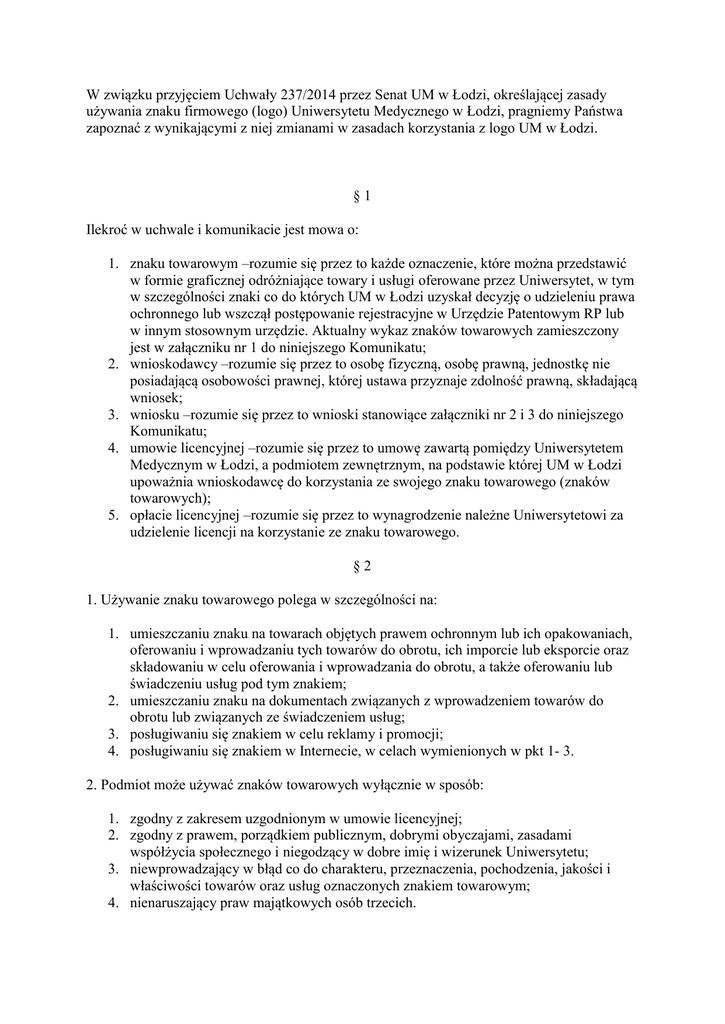 W związku przyjęciem Uchwały 237/2014 przez Senat UM w Łodzi, określającej zasady używania znaku firmowego (logo) Uniwersytetu Medycznego w Łodzi, pragniemy Państwa zapoznać z wynikającymi z niej zmianami w zasadach korzystania z logo UM w Łodzi. §1 Ilekroć w uchwale i komunikacie jest mowa o: 1. znaku towarowym –rozumie się przez to każde oznaczenie, które można przedstawić w formie graficznej odróżniające towary i usługi oferowane przez Uniwersytet, w tym w szczególności znaki co do których UM w Łodzi uzyskał decyzję o udzieleniu prawa ochronnego lub wszczął postępowanie rejestracyjne w Urzędzie Patentowym RP lub w innym stosownym urzędzie. Aktualny wykaz znaków towarowych zamieszczony jest w załączniku nr 1 do niniejszego Komunikatu; 2. wnioskodawcy –rozumie się przez to osobę fizyczną, osobę prawną, jednostkę nie posiadającą osobowości prawnej, której ustawa przyznaje zdolność prawną, składającą wniosek; 3. wniosku –rozumie się przez to wnioski stanowiące załączniki nr 2 i 3 do niniejszego Komunikatu; 4. umowie licencyjnej –rozumie się przez to umowę zawartą pomiędzy Uniwersytetem Medycznym w Łodzi, a podmiotem zewnętrznym, na podstawie której UM w Łodzi upoważnia wnioskodawcę do korzystania ze swojego znaku towarowego (znaków towarowych); 5. opłacie licencyjnej –rozumie się przez to wynagrodzenie należne Uniwersytetowi za udzielenie licencji na korzystanie ze znaku towarowego. §2 1. Używanie znaku towarowego polega w szczególności na: 1. umieszczaniu znaku na towarach objętych prawem ochronnym lub ich opakowaniach, oferowaniu i wprowadzaniu tych towarów do obrotu, ich imporcie lub eksporcie oraz składowaniu w celu oferowania i wprowadzania do obrotu, a także oferowaniu lub świadczeniu usług pod tym znakiem; 2. umieszczaniu znaku na dokumentach związanych z wprowadzeniem towarów do obrotu lub związanych ze świadczeniem usług; 3. posługiwaniu się znakiem w celu reklamy i promocji; 4. posługiwaniu się znakiem w Internecie, w celach wymienionych w pkt 1- 3. 2. Podmiot może używać znaków towarowych wyłącznie w sposób: 1. zgodny z zakresem uzgodnionym w umowie licencyjnej; 2. zgodny z prawem, porządkiem publicznym, dobrymi obyczajami, zasadami współżycia społecznego i niegodzący w dobre imię i wizerunek Uniwersytetu; 3. niewprowadzający w błąd co do charakteru, przeznaczenia, pochodzenia, jakości i właściwości towarów oraz usług oznaczonych znakiem towarowym; 4. nienaruszający praw majątkowych osób trzecich. §3 1. Podmioty zainteresowane uzyskaniem zgody na użycie znaku towarowego mogą składać następujące wnioski: 2. Do Centrum Innowacji i Transferu Technologii wniosek o udzielenie licencji na użycie znaku towarowego w celu użycia handlowego produktów i usług opatrzonych prawnie chronionym znakiem towarowym oraz w przypadku innych działań komercyjnych z udziałem znaku Uczelni (wzór –załącznik nr 2); 3. Do Biura Promocji wniosek o udzielenie licencji na użycie znaku towarowego w celu używania znaku UM w Łodzi poprzez umieszczenie na materiałach promocyjnych, typu druki, gadżety, banery, roll-upy, strony www, itp., wykorzystanie znaku towarowego podczas konferencji tematycznych oraz patronatów Jego Magnificencji Rektora Uniwersytetu Medycznego w Łodzi (wzór –załącznik nr 2). Do wniosków, o których mowa w ust. 1, należy dołączyć: 1. odpis z Krajowego Rejestru Sądowego (KRS) albo zaświadczenie o wpisie do Centralnej Ewidencji i Informacji o Działalności Gospodarczej lub odpis z innego właściwego rejestru, wystawione nie wcześniej niż 6 miesięcy przed złożeniem wniosku; 2. informację o sposobie wykorzystywania znaków w formie opisu towaru, usługi, przedsięwzięcia lub wydarzenia i – o ile to możliwe wizualizacji graficznej przygotowanej w formie elektronicznej; 3. pełnomocnictwo do reprezentowania wnioskodawcy (w przypadku reprezentowania przez osobę inną niż ujawnioną w odpowiednim rejestrze). 4. Osobą upoważnioną do podejmowania decyzji w sprawach dotyczących udostępniania znaków towarowych Uniwersytetu Medycznego w Łodzi oraz podpisywania umów licencyjnych jest Rektor UM w Łodzi, po uzyskaniu opinii od Dyrektora Centrum Innowacji i Transferu Technologii lub Dyrektora Biura Promocji. 5. Rozpoznanie wniosku następuje w terminie do 30 dni od jego wpływu do Centrum Innowacji i Transferu Technologii lub Biura Promocji i o decyzji Uniwersytet informuje wnioskodawcę w formie pisemnej. 6. Odmowa udzielenia zgody na użycie znaku towarowego następuje w szczególności w wypadku, gdy: 7. zachodzi uzasadniona obawa użycia znaku w sposób sprzeczny z § 2 niniejszego Komunikatu; 8. wnioskodawcą jest podmiot, który uprzednio używał znaku towarowego w sposób sprzeczny z § 2 niniejszego Komunikatu albo nie uiścił opłaty licencyjnej lub zalega z dokonaniem płatności. §4 Uniwersytetowi Medycznemu w Łodzi przysługuje prawo kontroli w zakresie prawidłowego wykorzystywania znaku towarowego, jak również spełniania przez korzystających ze znak u kryteriów wymaganych w niniejszym Komunikacie. §6 Uniwersytet Medyczny w Łodzi prowadzi rejestr wykorzystania znaków towarowych. §7 Niniejszy Komunikat nie dotyczy: 1. używania znaków towarowych przez jednostki organizacyjne UM w Łodzi; 2. umów o komercjalizacji dóbr intelektualnych, w tym spółek zależnych, w ramach których UM w Łodzi przyznał drugiej stronie prawo do posługiwania się logiem UM w Łodzi lub znakiem towarowym. Z poważaniem, Dyrektor Centrum Innowacji i Transferu Technologii UM w Łodzi Dr. n med. Bartłomiej Grobelski Dyrektor Biura Promocji Mgr Joanna Milczarek