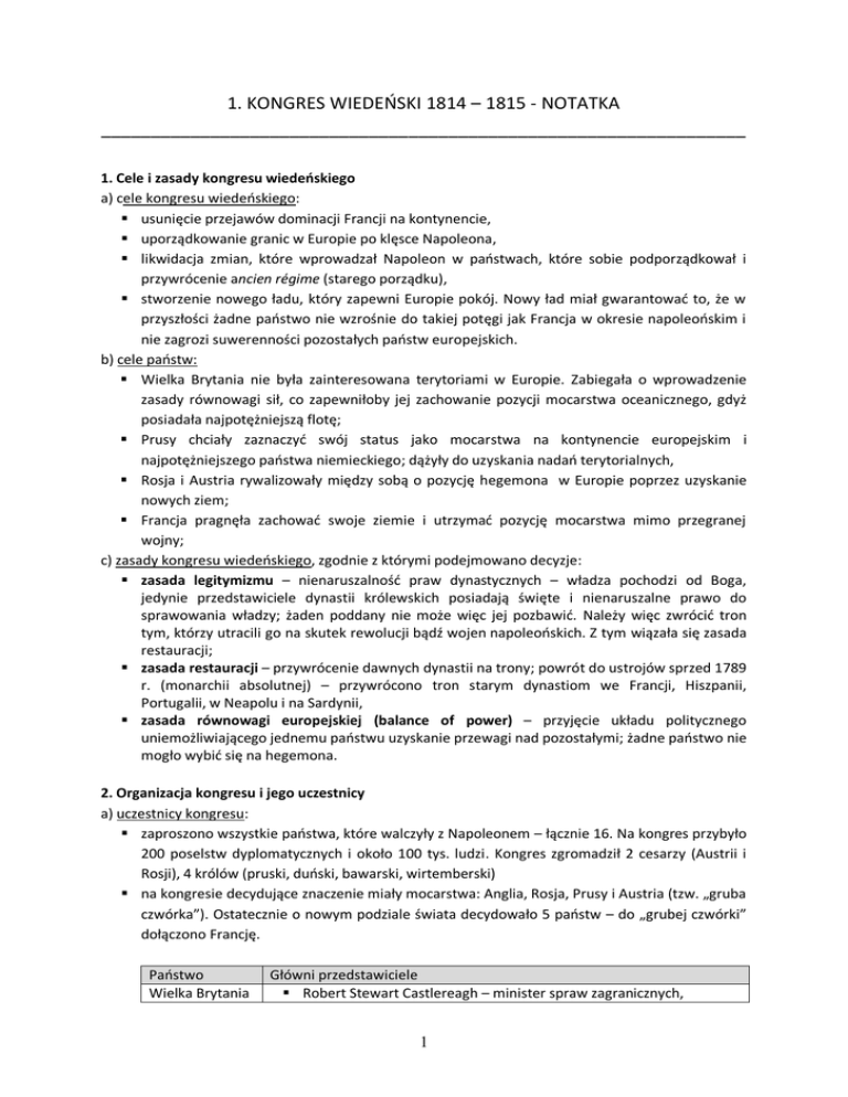1. KONGRES WIEDEOSKI 1814 – 1815 - NOTATKA _________________________________________________________________ 1. Cele i zasady kongresu wiedeoskiego a) cele kongresu wiedeoskiego: usunięcie przejawów dominacji Francji na kontynencie, uporządkowanie granic w Europie po klęsce Napoleona, likwidacja zmian, które wprowadzał Napoleon w paostwach, które sobie podporządkował i przywrócenie ancien régime (starego porządku), stworzenie nowego ładu, który zapewni Europie pokój. Nowy ład miał gwarantowad to, że w przyszłości żadne paostwo nie wzrośnie do takiej potęgi jak Francja w okresie napoleooskim i nie zagrozi suwerenności pozostałych paostw europejskich. b) cele paostw: Wielka Brytania nie była zainteresowana terytoriami w Europie. Zabiegała o wprowadzenie zasady równowagi sił, co zapewniłoby jej zachowanie pozycji mocarstwa oceanicznego, gdyż posiadała najpotężniejszą flotę; Prusy chciały zaznaczyd swój status jako mocarstwa na kontynencie europejskim i najpotężniejszego paostwa niemieckiego; dążyły do uzyskania nadao terytorialnych, Rosja i Austria rywalizowały między sobą o pozycję hegemona w Europie poprzez uzyskanie nowych ziem; Francja pragnęła zachowad swoje ziemie i utrzymad pozycję mocarstwa mimo przegranej wojny; c) zasady kongresu wiedeoskiego, zgodnie z którymi podejmowano decyzje: zasada legitymizmu – nienaruszalnośd praw dynastycznych – władza pochodzi od Boga, jedynie przedstawiciele dynastii królewskich posiadają święte i nienaruszalne prawo do sprawowania władzy; żaden poddany nie może więc jej pozbawid. Należy więc zwrócid tron tym, którzy utracili go na skutek rewolucji bądź wojen napoleooskich. Z tym wiązała się zasada restauracji; zasada restauracji – przywrócenie dawnych dynastii na trony; powrót do ustrojów sprzed 1789 r. (monarchii absolutnej) – przywrócono tron starym dynastiom we Francji, Hiszpanii, Portugalii, w Neapolu i na Sardynii, zasada równowagi europejskiej (balance of power) – przyjęcie układu politycznego uniemożliwiającego jednemu paostwu uzyskanie przewagi nad pozostałymi; żadne paostwo nie mogło wybid się na hegemona. 2. Organizacja kongresu i jego uczestnicy a) uczestnicy kongresu: zaproszono wszystkie paostwa, które walczyły z Napoleonem – łącznie 16. Na kongres przybyło 200 poselstw dyplomatycznych i około 100 tys. ludzi. Kongres zgromadził 2 cesarzy (Austrii i Rosji), 4 królów (pruski, duoski, bawarski, wirtemberski) na kongresie decydujące znaczenie miały mocarstwa: Anglia, Rosja, Prusy i Austria (tzw. „gruba czwórka”). Ostatecznie o nowym podziale świata decydowało 5 paostw – do „grubej czwórki” dołączono Francję. Paostwo Wielka Brytania Główni przedstawiciele Robert Stewart Castlereagh – minister spraw zagranicznych, 1 Rosja Austria Prusy Francja Arthur Wellesley, książę Wellington; głównodowodzący armii bryt. car Aleksander I Romanow Karl Robert Nesselrode – minister spraw zagranicznych, cesarz Franciszek I Habsburg Klemens von Metternich – minister spraw zagranicznych, król Fryderyk Wilhelm III Hohenzollern, Karl Hardenberg – kanclerz, Charles de Talleyrand – minister spraw zagranicznych, Źródło – R. Śniegocki, Historia 2. Od kongresu wiedeoskiego do I wojny światowej. b) organizacja kongresu Kongres miał charakter nieformalny. Nigdy nie został oficjalnie otwarty i zamknięty. Za jego początek uważa się inauguracyjny bal maskowy z 2 października 1814 r., a za jego koniec podpisanie aktu koocowego 9 czerwca 1815 r. Obrady toczyły się podczas nieoficjalnych spotkao – balów, polowao, przyjęd, dlatego też kongres nazywano „taoczącym”. 3. Postanowienia kongresu wiedeoskiego: Francja miała: powrócid do granic sprzed 1792 r. Po 100 dniach Napoleona podpisano 20.11.1815 r. II pokój paryski. zmieniono to postanowienie i zmniejszono terytorium Francji do granic z roku 1790 r. , Francja miała zapłacid wysoką kontrybucję, tron przywrócono dynastii Burbonów ( zasiadł na nim Ludwik XVIII); zwrócid zagrabione dzieła sztuki, Szwajcaria – miała byd paostwem wieczyście neutralnym złożonym z 22 kantonów; powstała niepodległa Konfederacja Szwajcarska, Rosja zyskała: Finlandię kosztem Szwecji, Besarabię kosztem Turcji, częśd Księstwa Warszawskiego, Szwecja – do Szwecji przyłączono Norwegię (jako rekompensatę za Finlandię) kosztem Danii, Dania – otrzymała Wyspy Owcze, które wcześniej należały do Norwegii, sprawa niemiecka: paostwa walczące u boku Napoleona zostały ukarane (zabrano im częśd ziem) , nie przywrócono tronów wszystkim władcom by nie dopuścid do rozdrobnienia kraju, Prusy otrzymały 2/5 Saksonii, Pomorze Szwedzkie z wyspą Rugią oraz Westfalię i Nadrenię, a także częśd Księstwa Warszawskiego, utrzymano podział Niemiec – rozwiązano Związek Reoski a na jego miejsce powołano Związek Niemiecki pod przywództwem Austrii (był to luźny związek paostw niemieckich – 34 paostwa i 4 wolne miasta): na czele Związku stał cesarz Austrii, głównym organem stanowiącym został Bundestag (dwuizbowy parlament), który zwoływano do Frankfurtu nad Menem; przy podejmowaniu decyzji obowiązywała zasada jednomyślności, sprawa włoska: przywrócono Paostwo Kościelne papieżowi, Wenecję i Lombardię przekazano Austrii, Modenę i Toskanię przywrócono poprzednim władcom, Parmę otrzymała dożywotnio żona Napoleona (córka cesarza austriackiego), Neapol połączono z Sycylią tworząc Królestwo Obojga Sycylii (dynastia Burbonów), Piemont połączono z Sardynią tworząc Królestwo Sardynii (dynastia sabaudzka), 2 połączono Belgię (Niderlandy Południowe), Holandię (Niderlandy) i Luksemburg tworząc Królestwo Niderlandów (dynastia oraoska), Austria: uzyskała częśd Księstwa Warszawskiego, otrzymała również Lombardię, Wenecję i Dalmację z Istrią, otrzymała Tyrol i Salzburg, stanęła na czele Związku Niemieckiego, Wielk