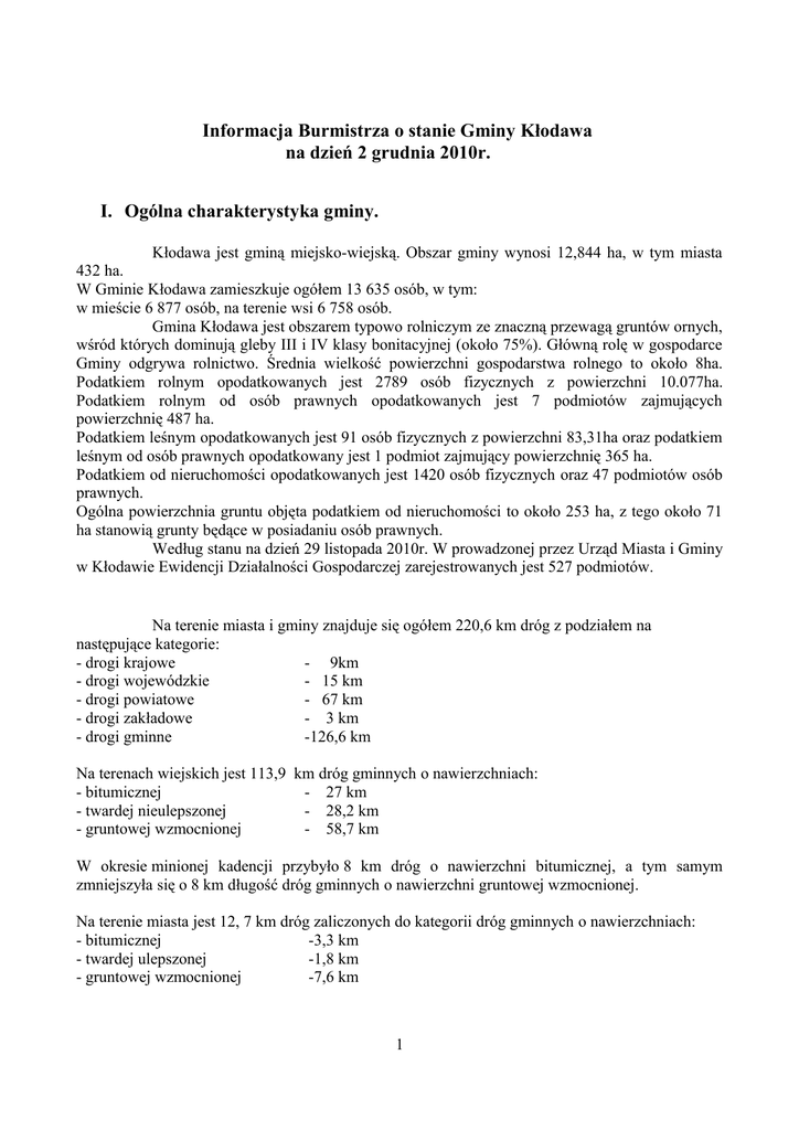 Informacja Burmistrza o stanie Gminy Kłodawa na dzień 2 grudnia 2010r. I. Ogólna charakterystyka gminy. Kłodawa jest gminą miejsko-wiejską. Obszar gminy wynosi 12,844 ha, w tym miasta 432 ha. W Gminie Kłodawa zamieszkuje ogółem 13 635 osób, w tym: w mieście 6 877 osób, na terenie wsi 6 758 osób. Gmina Kłodawa jest obszarem typowo rolniczym ze znaczną przewagą gruntów ornych, wśród których dominują gleby III i IV klasy bonitacyjnej (około 75%). Główną rolę w gospodarce Gminy odgrywa rolnictwo. Średnia wielkość powierzchni gospodarstwa rolnego to około 8ha. Podatkiem rolnym opodatkowanych jest 2789 osób fizycznych z powierzchni 10.077ha. Podatkiem rolnym od osób prawnych opodatkowanych jest 7 podmiotów zajmujących powierzchnię 487 ha. Podatkiem leśnym opodatkowanych jest 91 osób fizycznych z powierzchni 83,31ha oraz podatkiem leśnym od osób prawnych opodatkowany jest 1 podmiot zajmujący powierzchnię 365 ha. Podatkiem od nieruchomości opodatkowanych jest 1420 osób fizycznych oraz 47 podmiotów osób prawnych. Ogólna powierzchnia gruntu objęta podatkiem od nieruchomości to około 253 ha, z tego około 71 ha stanowią grunty będące w posiadaniu osób prawnych. Według stanu na dzień 29 listopada 2010r. W prowadzonej przez Urząd Miasta i Gminy w Kłodawie Ewidencji Działalności Gospodarczej zarejestrowanych jest 527 podmiotów. Na terenie miasta i gminy znajduje się ogółem 220,6 km dróg z podziałem na następujące kategorie: - drogi krajowe - 9km - drogi wojewódzkie - 15 km - drogi powiatowe - 67 km - drogi zakładowe - 3 km - drogi gminne -126,6 km Na terenach wiejskich jest 113,9 km dróg gminnych o nawierzchniach: - bitumicznej - 27 km - twardej nieulepszonej - 28,2 km - gruntowej wzmocnionej - 58,7 km W okresie minionej kadencji przybyło 8 km dróg o nawierzchni bitumicznej, a tym samym zmniejszyła się o 8 km długość dróg gminnych o nawierzchni gruntowej wzmocnionej. Na terenie miasta jest 12, 7 km dróg zaliczonych do kategorii dróg gminnych o nawierzchniach: - bitumicznej -3,3 km - twardej ulepszonej -1,8 km - gruntowej wzmocnionej -7,6 km 1 II. Jednostki organizacyjne Gminy Gmina nałożone na nią zadania wykonuje poprzez swe jednostki organizacyjne, którymi są: 1/ Urząd Miasta i Gminy w Kłodawie, 2/ Ośrodek Pomocy Społecznej w Kłodawie, 3/ Gminny Ośrodek Kultury w Kłodawie, 4/ Biblioteka Publiczna w Kłodawie, 5/ Zakład Wodociągów i Kanalizacji w Kłodawie, 6/ Zarząd Budynków i Usług Komunalnych w Kłodawie, 7/ Zespół Szkół Nr 1 w Kłodawie, 8/ Zespół Szkół Nr 2 w Kłodawie, 9/ Gimnazjum Nr 3 w Rysinach Kolonii, 10/ Szkoła Podstawowa w Górkach, 11/ Szkoła Podstawowa im. Gen. Tadeusza Kutrzeby w Bierzwiennej Długiej, 12/ Szkoła Podstawowa w Lubońku, 13/ Szkoła Podstawowa im. Wincentego Witosa w Dębinie, 14/ Przedszkole Nr 1 im. Jana Brzechwy w Kłodawie. III. Plany zagospodarowania przestrzennego i inne programy. Rozwój miasta i gminy określają uchwały Rady Miejskiej w Kłodawie. Uchwałami o szczególnym znaczeniu są: – miejscowy plan zagospodarowania przestrzennego miasta i gminy Kłodawa uwzględniający tereny pod działalność handlowo – usługową oraz przemysł, – strategia Rozwoju Gminy Kłodawa, – plan Rozwoju Lokalnego Gminy Kłodawa – lokalny Program Rewitalizacji Miasta Kłodawa – Program Ochrony Środowiska – Program usuwania azbestu i wyrobów zawierających azbest – Planu Gospodarki Odpadami dla Związku Międzygminnego „Kolski Region Komunalny” na lata 2009 – 2012 z perspektywą na lata 2013 – 2016 wraz z prognozą oddziaływania na środowisko. W czasie ostatniej kadencji uchwalono jedną aktualizację istniejącego planu w miejscowości Zbójno dostosowując plan miejscowy do aktualnych potrzeb inwestora związanego z eksploatacją kruszyw. Kolejnym dokumentem planistycznym jest studium uwarunkowań i kierunków zagospodarowania przestrzennego Gminy. Jest to opracowanie składające się z części mapowej i opisowej, wskazujące w ogólnym kształcie kierunki rozwoju gminy, jej sposób zabudowy oraz wyznaczenie nowych terenów budowlanych. Dzięki posiadanym dokumentom planistycznym gmina jest przygotowana na przyjęcie nowych inwestorów składających propozycje wszelkiego rodzaju inwestycji. W rejonie Kopalni Soli oraz w Pomarzanach istnieją rezerwy terenów zabezpieczonych w planach miejscowych pod usługi komercyjne i działalność gospodarczą. Z uwagi na dużą powierzchnię tych terenów mogą to być obiekty kubaturowe o dużej powierzchni zabudowy. W ostatnim okresie obserwujemy zmniejszenie intensywności nowej zabudowy, zarówno mieszkaniowej jaki i usługowej mimo dużych rezerw wolnych terenów budowlanych, które 2 znajdują się w rejonie ulic: Zawodniej, Barbary, Gruntowej, Cegielnianej i Orzeszkowej. Na terenach przeznaczonych pod zabudowę mieszkaniową dopuszcza się lokalizację obiektów usługowych, nie stanowiących uciążliwości dla sąsiedniej zabudowy. Taka elastyczność zasad planistycznych rozwiązuje problem dla małych przedsiębiorców, którzy na wolnych działkach budowlanych przeznaczonych pod zabudowę mieszkaniową mogą lokalizować np. obiekty handlowe lub małe zakłady usługowe. Wadą istniejących dokumentów planistycznych jest ich wiek. Studium z 1998 r. i miejscowy plan zagospodarowania przestrz. z 2001 r. wymagają już aktualizacji celem dostosowania ich do postępujących przemian społecznych. IV. Budżet Gminy Kłodawa w latach 2006-2010 1.Dochody budżetu Gminy Kłodawa w latach 2006-2010 przedstawiają się następująco: Dochody Ogółem 2006 2007 2008 2009 2010 23 121 067 23 645 530 27 278 154 27 668 542 28 313 705 Dochody własne 10 475 975 10 356 733 12 383 468 11 614 140 11 446 523 Dotacje Subwencje Dynamika 5 518 878 5 303 975 6 055 498 5 252 914 5 833 789 7 126 214 7 984 822 8 839 188 10 798 488 11 033 393 x 100,90 116,91 101,43 102,33 Udział dochodów własnych w dochodach og