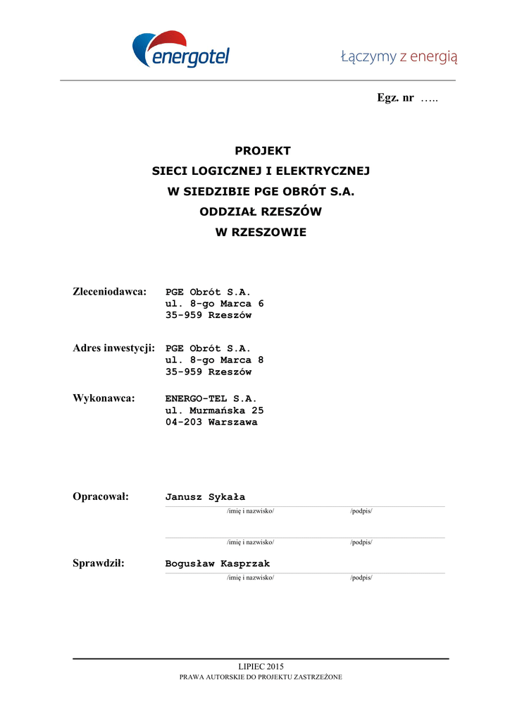 Egz. nr ….. PROJEKT SIECI LOGICZNEJ I ELEKTRYCZNEJ W SIEDZIBIE PGE OBRÓT S.A. ODDZIAŁ RZESZÓW W RZESZOWIE Zleceniodawca: PGE Obrót S.A. ul. 8-go Marca 6 35-959 Rzeszów Adres inwestycji: PGE Obrót S.A. ul. 8-go Marca 8 35-959 Rzeszów Wykonawca: ENERGO-TEL S.A. ul. Murmańska 25 04-203 Warszawa Opracował: Janusz Sykała ________________________________________________________________________________________________________________________________________ /imię i nazwisko/ /podpis/ ________________________________________________________________________________________________________________________________________ /imię i nazwisko/ Sprawdził: /podpis/ Bogusław Kasprzak ________________________________________________________________________________________________________________________________________ /imię i nazwisko/ LIPIEC 2015 PRAWA AUTORSKIE DO PROJEKTU ZASTRZEŻONE /podpis/ ENERGO-TEL S.A. Spis treści 1. PODSTAWA OPRACOWANIA. .................................................................................................................. 3 2. PRZEDMIOT OPRACOWANIA. ................................................................................................................ 3 3. ZAKRES OPRACOWANIA. ...................................................................................................................... 3 4. MATERIAŁY WYJŚCIOWE. LITERATURA. ............................................................................................. 4 5. ZAŁOŻENIA PROJEKTOWE. .................................................................................................................. 5 6. OKABLOWANIE STRUKTURALNE. ........................................................................................................... 6 6.1. PUNKT DYSTRYBUCYJNY. ............................................................................................................. 10 6.2. OKABLOWANIE POZIOME. ............................................................................................................. 11 6.3. GNIAZDA ODBIORCZE. ................................................................................................................. 12 6.4. SYSTEM KORYTOWY...................................................................................................................... 12 6.5. ZALECENIA EKSPLOATACYJNE SYSTEMU OKABLOWANIA STRUKTURALNEGO...................................... 13 6.6. ADMINISTRACJA I DOKUMENTACJA. ................................................................................. 14 6.7. ODBIORY I POMIARY SIECI. ............................................................................................. 14 6.8. UWAGI KOŃCOWE. ................................................................................................................... 17 7. OKABLOWANIE ELEKTRYCZNE............................................................................................................ 18 7.1. SIEĆ WYDZIELONEGO ZASILANIA. ............................................................................................... 18 7.2. SIEĆ ZASILANIA OGÓLNEGO. ...................................................................................................... 21 7.3. OBLICZENIA TECHNICZNE. .......................................................................................................... 22 8. PODSTAWOWE ZESTAWIENIA MATERIAŁÓW. ........................................................................................ 26 9. PLANY I SCHEMATY. ....................................................................................................................... 27 10. ZAŁĄCZNIKI. ................................................................................................................................ 28 PROJEKT SIECI LOGICZNEJ I ELEKTRYCZNEJ W SIEDZIBIE PGE OBRÓT S.A. ODDZIAŁ RZESZÓW (NA TERENIE PGE DYSTRYBUCJA S.A. ODDZIAŁ RZESZÓW) W RZESZOWIE LIPIEC 2015 2 ENERGO-TEL S.A. 1. Podstawa opracowania. 1.1. Umowa na wykonanie sieci logicznej i elektrycznej w obiekcie PGE Dystrybucja S.A., Oddział Rzeszów (pomieszczenia biurowca) użytkowanych przez PGE Obrót S.A. O/Rzeszów; 1.2. Wizje lokalne oraz uzgodnienia przeprowadzone ze Zleceniodawcą oraz Właścicielem obiektu; 1.3. Archiwalne dokumentacje architektoniczne przedmiotowego budynku udostępnione przez PGE Obrót S.A.; 1.4. Ogólne wytyczne Zleceniodawcy prac. 2. Przedmiot opracowania. 2.1. Przedmiotem opracowania jest instalacja sieci logicznej i elektrycznej (sieci zasilania ogólnego i dedykowanego na potrzeby stanowisk komputerowych) w adaptowanych pomieszczeniach biurowca Oddziału spółki PGE Dystrybucja S.A. użytkowanym przez PGE Obrót S.A. Oddział Rzeszów. 3. Zakres opracowania. Projektowana instalacja obejmuje następujące elementy: 3.1. 3.2. 3.3. 3.4. 3.5. 3.6. 3.7. 3.8. Opis funkcjonalny, określenie podstawowych komponentów okablowania; Strukturę wykonanej sieci telekomunikacyjnej w pomieszczeniach; Pośredni punkt dystrybucyjny; Sposób prowadzenia instalacji, sposób numeracji przyłączy; Kryteria pomiarowe przy odbiorze; Strukturę wykonanej sieci elektrycznej w pomieszczeniach; Schematy tablic zasilających Rzuty poszczególnych pomieszczeń, gdzie rozmieszczono nowo projektowane przyłącza logiczne wraz z instalacją zasilającą na potrzeby sieci komputerowej oraz stowarzyszone z nimi gniazda ogólnej sieci zasilającej; 3.9. Pozostałe wytyczne pomiarowe, instalacyjne, inne wymagania, itp. PROJEKT SIECI LOGICZNEJ I ELEKTRYCZNEJ W SIEDZIBIE PGE OBRÓT S.A. ODDZIAŁ RZESZÓW (NA TERENIE PGE DYSTRYBUCJA S.A. ODDZIAŁ RZESZÓW) W RZESZOWIE LIPIEC 2015 3 ENERGO-TEL S.A. 4. Materiały wyjściowe. Literatura. Prace projektowe oparto na: 4.1. Istniejących podkładach architektonicznych pomieszczeń biurowca PGE Dystrybucja S.A. O/Rzeszów; 4.2. Polskich normach dotyczących systemów okablowania strukturalnego, m.in.: PN-EN 50173-1:2009 - Technika informatyczna. Systemy