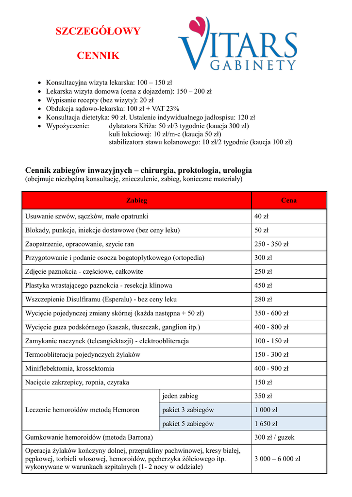 SZCZEGÓŁOWY CENNIK Konsultacyjna wizyta lekarska: 100 – 150 zł Lekarska wizyta domowa (cena z dojazdem): 150 – 200 zł Wypisanie recepty (bez wizyty): 20 zł Obdukcja sądowo-lekarska: 100 zł + VAT 23% Konsultacja dietetyka: 90 zł. Ustalenie indywidualnego jadłospisu: 120 zł Wypożyczenie: dylatatora Kříža: 50 zł/3 tygodnie (kaucja 300 zł) kuli łokciowej: 10 zł/m-c (kaucja 50 zł) stabilizatora stawu kolanowego: 10 zł/2 tygodnie (kaucja 100 zł) Cennik zabiegów inwazyjnych – chirurgia, proktologia, urologia (obejmuje niezbędną konsultację, znieczulenie, zabieg, konieczne materiały) Zabieg Cena Usuwanie szwów, sączków, małe opatrunki 40 zł Blokady, punkcje, iniekcje dostawowe (bez ceny leku) 50 zł Zaopatrzenie, opracowanie, szycie ran 250 - 350 zł Przygotowanie i podanie osocza bogatopłytkowego (ortopedia) 300 zł Zdjęcie paznokcia - częściowe, całkowite 250 zł Plastyka wrastającego paznokcia - resekcja klinowa 450 zł Wszczepienie Disulfiramu (Esperalu) - bez ceny leku 280 zł Wycięcie pojedynczej zmiany skórnej (każda następna + 50 zł) 350 - 600 zł Wycięcie guza podskórnego (kaszak, tłuszczak, ganglion itp.) 400 - 800 zł Zamykanie naczynek (teleangiektazji) - elektroobliteracja 100 - 150 zł Termoobliteracja pojedynczych żylaków 150 - 300 zł Miniflebektomia, krossektomia 400 - 900 zł Nacięcie zakrzepicy, ropnia, czyraka 150 zł Leczenie hemoroidów metodą Hemoron jeden zabieg 350 zł pakiet 3 zabiegów 1 000 zł pakiet 5 zabiegów 1 650 zł Gumkowanie hemoroidów (metoda Barrona) 300 zł / guzek Operacja żylaków kończyny dolnej, przepukliny pachwinowej, kresy białej, pępkowej, torbieli włosowej, hemoroidów, pęcherzyka żółciowego itp. wykonywane w warunkach szpitalnych (1- 2 nocy w oddziale) 3 000 – 6 000 zł Operacja plastyczna stulejki; obrzezanie 1 000 zł Plastyka (wydłużenie) operacyjne wędzidełka napletka 450 zł Cewnikowanie pęcherza moczowego 30 zł Wymiana cewnika; duże opatrunki 50 zł Odprowadzenie załupka 130 zł Cennik zabiegów laserowych (obejmuje konsultację, znieczulenie, zabieg) Zabieg Cena Usunięcie pojedynczej zmiany skórnej 150 - 300 zł Usuwanie licznych, drobnych zmian skórnych bez znieczulenia 300 zł / 15 min. Podcięcie wędzidełka języka, górnej wargi, dolnej wargi 200 zł Podcięcie - plastyka wędzidełka napletka 250 zł Usuwanie grudek perlistych żołędzi prącia 600 - 900 zł Usuwanie prosaków skóry penisa, moszny, warg sromowych 400 - 1 400 zł Usuwanie kłykcin kończystych okolic płciowych i odbytu 450 zł / 15 min. zależnie od wielkości 20 - 50 zł Biostymulacja laserowa ran i owrzodzeń Leczenie blizn – laser Er:Yag frakcyjny iPixel pakiet 10 zabiegów rabat 20% do 3 cm2 150 - 350 zł 3 - 5 cm2 350 - 550 zł 5 - 10 cm2 550 - 700 zł powyżej 10 cm2 wycena indywidualna po cięciu cesarskim 400 - 500 zł po usunięciu tarczycy 300 zł pooparzeniowe 300 - 600 zł / 50 cm2 Potrądzikowe - skronie; boki policzków; linia żuchwy 700 zł potrądzikowe - policzki 800 zł potrądzikowe - cała twarz 1 200 zł pakiet 3 zabiegów rabat 10% plecy; piersi; biodra; łydki; ramiona 500 - 1 500 zł Leczenie rozstępów – laser Er:Yag frakcyjny iPixel brzuch; uda; pośladki 800 – 2 000 zł pakiet 3 zabiegów rabat 10% Peeling laserowy – laser Er:Yag frakcyjny iPixel Wygładzanie zmarszczek, resurfacing skóry - laser frakcyjny Er:Yag iPixel twarz 1 100 zł szyja 800 zł dekolt 800 - 1 100 zł twarz + szyja 1 400 zł twarz + szyja + dekolt 1 700 zł ramiona 500 - 1 000 zł twarz; biust 1 200 zł szyja 900 zł dekolt 900 - 1 200 zł twarz + szyja 1 600 zł twarz+szyja+dekolt; dekolt+biust 2 000 zł powieki górne + dolne 400 - 500 zł czoło; okolice ust 550 zł grzbiety rąk 800 zł brzuch; wewnętrzna strona ud; uda nad kolanami 1 000 - 2 000 zł Cennik wybranych badań dodatkowych Zabieg Cena Usg prostaty przezbrzuszne i transrektalne; jąder; ginekologiczne; tarczycy 80 zł Usg sutka + węzłów pachowych; brzucha; ginekologiczne transvaginalne 100 zł Usg położnicze; genetyczne w ciąży 140 zł Usg położnicze + Doppler 180 zł Kolposkopia 100 zł Rektoskopia sprzętem jednorazowego użytku 140 zł Badanie histopatologiczne preparatu 60 zł Cytologia, posiewy mikrobiologiczne 50 zł Genodiet Completo – analiza DNA 2 500 zł Cennik zabiegów pielęgniarskich w gabinecie Zabieg Cena Zastrzyk podskórny / domięśniowy / dożylny 20 / 30 / 40 zł Założenie wenflonu + iniekcja dożylna 55 zł Pomiar poziomu glukozy we krwi za pomocą glukometru 15 zł Pomiar ciśnienia tętniczego 5 zł Pobranie krwi do badań laboratoryjnych 10 zł Cytologia; posiewy mikrobiologiczne (bakteriologia, mykologia) 50 zł Cennik zabiegów - kosmetyka, podologia (obejmuje konsultację, zabieg, konieczne kosmetyki) Zabieg Cena Masaż manualny twarzy z digitopresurą 70 zł Darsonwalizacja 10 - 20 zł Peelingi depigmentacyjne - Cosmelan / Dermamelan 1 250 zł Peelingi medyczne od 150 zł Peeling kawitacyjny, sonoforeza (bez ceny preparatu) 60 - 180 zł Mikrodermabrazja korundowa bezpyłowa lub proszkowa ramiona; dekolt 100 zł twarz 150 zł plecy 250 zł rozstępy 500 zł Higieniczne oczyszczanie skóry 150 zł Lecznicze oczyszczanie skóry 200 - 250 zł Zabieg pielęgnacyjny Exuviance Professional Mezoterapia mikroigłowa DermaFrac Korekcja wrastającego paznokcia metodą Arkady okolica oczu 150 zł twarz + szyja + dekolt 250 zł twarz + oczy + szyja + dekolt 300 zł pojedynczy zabieg 420 zł pakiet 3 zabiegów 1 160 zł pakiet 6 zabiegów 2 120 zł paluch 250 - 350 zł palce II - V 200 zł / szt. paluch 190 zł palce II - V 100 zł /szt. założenie klamry 3TO 150 zł założenie klamry Podofix 120 zł założenie klamry COMBIped 100 zł kontrola 30 zł przełożenie 65 zł Rekonstrukcja paznokcia Klamry ortonyksyjne Pedicure medyczny 150 zł Usuwanie (frezowanie) nagniotków i modzeli 40 zł / szt. Cennik zabiegów medycyny estetycznej (obejmuje konsultację, zabieg, konieczne prepara