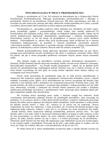 PSYCHOANALIZA W PRACY PRZEDSZKOLNEJ Pracuję w przedszkolu od 15 lat. Od czterech lat dokształcam się w Krakowskiej Szkole Psychoterapii Psychoanalitycznej. Dlaczego psychoterapia psychoanalityczna? I dlaczego w przedszkolu. Można by się doszukiwać różnych przyczyn. Dla mnie najważniejszy jest fakt, że rozwijam się jako nauczyciel, pracuję nad sobą, zdobywam wiedzę potrzebną mi w pracy a przede wszystkim, poszerzyłam zakres patrzenia na dzieci poprzez psychoanalizę. Psychoanaliza to: „dyscyplina naukowa, która obejmuje trzy niezależne od siebie części: teorię psychologii ogólnej i psychopatologii, rodzaj terapii oraz metodę badawczą”.[1] Psychoanaliza jest dziedziną wiedzy, która zajmuje się badaniem ludzkiej psychiki. Opiera się na dwóch podstawowych hipotezach: determinizmu psychicznego i istnienia nieświadomości. Determinizm oznacza, że nic nie dzieje się przypadkowo w naszym życiu: myśli, działania fantazje,... Nieświadomość to „ukryta sfera życia psychicznego, która uwidacznia się w naszym codziennym funkcjonowaniu, na przykład w naszych pomyłkach, marzeniach sennych, „oderwanych myślach”, skojarzeniach, w sposobie naszego wchodzenia w relacje; nieświadomość sprawia, że dokonujemy czasem wyborów, których sami nie umiemy uzasadnić.”[2] Metoda psychoanalityczna, której głównym sposobem komunikowania się jest słowo, pomaga nam nieświadomie uczynić świadomym, aby ulżyć w cierpieniu, zrozumieć siebie. Może też pomóc, tak jak w moim przypadku spróbować zrozumieć innych, pomóc innym zrozumieć siebie. Aby dziecko mogło się prawidłowo rozwijać powinno doświadczać przyjemności i frustracji. Dzięki frustracji dziecko aktywnie poszukuje, działa, rozwija swoje zdolności i percepcję. Doświadczanie przyjemności – wg Freuda zasada przyjemności - opiera się na dążeniu przez dziecko do natychmiastowego zaspokajania potrzeb. Dziecko uczy się w trakcie rozwoju, że nie może dostać wszystkiego od razu gdyż na swojej drodze napotyka różne zakazy, nakazy czy wymagania czyli rzeczywistość. Dzieci, które przychodzą do przedszkola mają już za sobą pewien ukształtowany w mniejszym lub większym stopniu bagaż umiejętności nawiązywania kontaktów, bycia z innymi osobami, wyrażania uczuć, lęków. Są to doświadczenia nie zawsze zrozumiałe dla dziecka, jego rodziców a tym bardziej osób z dzieckiem nie związanych-nauczycieli. Potrzeba dużo czasu, aby poznać dziecko, ale żeby je zrozumieć i zrozumieć jego działanie i reakcję potrzebny jest nie tylko czas, obserwacja, wywiady z rodzicami ale również bardzo pomocna jest wiedza z dziedziny analitycznej psychologii rozwojowej i mechanizmów, które motywują nasze działania takich jak: opór, pragnienia, popędy, lęki, przeniesienie. We wrześniu dzieci spotykają nowe osoby, z którymi zostają bez rodziców. Jeżeli wcześniejsze doświadczenia separacji dziecka nie przebiegały prawidłowo, teraz zaczynają się problemy. Co to oznacza: jeżeli w wieku około dwóch lat któryś z rodziców nadmiernie przywiąże dziecko do siebie, proces separacji od rodziców będzie utrudniony. Jeżeli natomiast w wieku dwóch lat dziecko zacznie mówić o sobie „Ja”, oznacza to, że proces ten się rozpoczął. „Proces rozdzielenia się może być zaburzony z wielu powodów, ale wcześniej lub później przejawy tego zakłócenia będą widoczne. Jednym z nich jest to, że dziecko nie może przebywać bez matki. ...Każde dziecko, które rozpoczyna edukację przedszkolną, przeżywa pewien stres... Na ogół dziecko sobie z tym radzi. Jeżeli w pierwszym momencie płacze za mamą, to tylko oznacza, ze jest do niej przywiązane...za chwilę pojawi się nowa zabawka, przyjdzie nowa pani, pogłaska po głowie, da lalkę, dziecko pobawi się nią w kącie...i w końcu przystosuje się do przedszkola... Natomiast, jeżeli dziecko ma zbyt duży lęk separacyjny, jego oddzielenie się nie jest wystarczające, to nie wypuści matki z przedszkola. Przyczepi się do niej, a gdy matka mimo to wyjdzie, ono nie ruszy się z kąta, nie wstanie, niby jest w tym przedszkolu, ale go nie ma.”[3] W wieku trzech lat w sferze intelektualnej na pierwszy plan w umyśle dziecka wysuwa się niepewność i konfuzja wobec świata. Pojawiają się pierwsze zabawy grupowe, Jest to związane z wytworzeniem się choćby w minimalnym stopniu społecznego sumienia, (czyli super ego). Dziecko, aby było zdolne do zabawy z innymi musi być zdolne do przeżywania współczucia, troski wobec innych. Wiąże się to z depresyjnym poczuciem winy. Dziecko, aby bawić się z innymi musi kontrolować swoją złość i nienawiść, które to stany pojawiają się w sposób naturalny w sytuacji frustracji zachcianek. Symboliczna zabawa wg A. Freud i M.Klein wykazuje podobieństwa do śnienia i może być symbolicznym powtarzaniem sytuacji budzących lęk. Dalsza zabawa przynosi ukojenie a co za tym idzie rozładowanie napięcia natomiast nieudana zabawa lub jej notoryczne przerywanie pozostawia napięcie, a wraz z nim nienawiść dziecka. W praktyce zauważyłam, że dzieci potrzebują niekiedy dużo czasu, aby zdecydować czy bawić się z drugim dzieckiem. Dzieci mają do tego pełne prawo i same decydują, kiedy i z kim się bawić. Należy im dać czas i możliwości wyboru. W mojej grupie są jeszcze takie maluszki, które podejmują próby zabawy zespołowej, ale też często bawią się jeszcze same. Mają wtedy miejsce, zabawki i czas dla siebie. Ale jest coś, co przykuwa moją uwagę, a mianowicie to, że dzieci te ( nie zawsze i nie wszystkie), bacznie obserwują bawiących się w grupie. Widać wtedy jak wiele emocji towarzyszy dziecku bawiącemu się samotnie: ciągle zerka w stronę bawiących się przerywając swoją zabawę, uśmiecha się, gdy inne się śmieją, smuci się, gdy te w grupce są smutne, odczuwa lęk, gdy pozostałe się sprzeczają, czy są złe