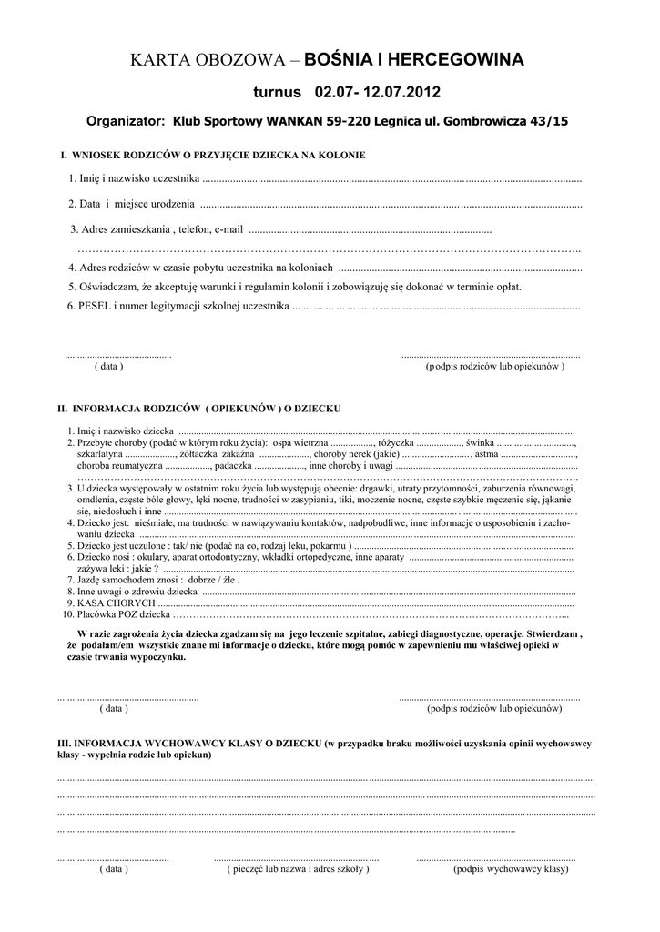 KARTA OBOZOWA – BOŚNIA I HERCEGOWINA turnus 02.07- 12.07.2012 Organizator: Klub Sportowy WANKAN 59-220 Legnica ul. Gombrowicza 43/15 I. WNIOSEK RODZICÓW O PRZYJĘCIE DZIECKA NA KOLONIE 1. Imię i nazwisko uczestnika ............................................................................................... .......................................... 2. Data i miejsce urodzenia .......................................................................................................................................... 3. Adres zamieszkania , telefon, e-mail ........................................................................................ ……………………………………………………………………………………………………………………….. 4. Adres rodziców w czasie pobytu uczestnika na koloniach ........................................................................................ 5. Oświadczam, że akceptuję warunki i regulamin kolonii i zobowiązuję się dokonać w terminie opłat. 6. PESEL i numer legitymacji szkolnej uczestnika ... ... ... ... ... ... ... ... ... ... ... ............................................................ ........................................... ( data ) ........................................................................ (p odpis rodziców lub opiekunów ) II. INFORMACJA RODZICÓW ( OPIEKUNÓW ) O DZIECKU 1. Imię i nazwisko dziecka ......................................................................................................... ...................................................... 2. Przebyte choroby (podać w którym roku życia): ospa wietrzna ................., różyczka .................., świnka ..............................., szkarlatyna ...................., żółtaczka zakaźna ...................., choroby nerek (jakie) ........................... , astma .............................., choroba reumatyczna .................., padaczka ...................., inne choroby i uwagi ................................. ........................................ ……………………………………………………………………………………………………………………………………. 3. U dziecka występowały w ostatnim roku życia lub występują obecnie: drgawki, utraty przytomności, zaburzenia równowagi, omdlenia, częste bóle głowy, lęki nocne, trudności w zasypianiu, tiki, moczenie nocne, częste szybkie męczenie się, jąkanie się, niedosłuch i inne ...................................................................................................................... ................................................ 4. Dziecko jest: nieśmiałe, ma trudności w nawiązywaniu kontaktów, nadpobudliwe, inne informacje o usposobieniu i zachowaniu dziecka .............................................................................................................. ................................................................. 5. Dziecko jest uczulone : tak/ nie (podać na co, rodzaj leku, pokarmu ) ........................................................................................ 6. Dziecko nosi : okulary, aparat ortodontyczny, wkładki ortopedyczne, inne aparaty .................................................................. zażywa leki : jakie ? ...................................................................................................... ............................................................... 7. Jazdę samochodem znosi : dobrze / źle . 8. Inne uwagi o zdrowiu dziecka ............................................................................................ .......................................................... 9. KASA CHORYCH ...................................................................................................................................... ................................. 10. Placówka POZ dziecka ………………………………………………………………………………………………………... W razie zagrożenia życia dziecka zgadzam się na jego leczenie szpitalne, zabiegi diagnostyczne, operacje. Stwierdzam , że podałam/em wszystkie znane mi informacje o dziecku, które mogą pomóc w zapewnieniu mu właściwej opieki w czasie trwania wypoczynku. ......................................................... ( data ) ......................................................................... (podpis rodziców lub opiekunów) III. INFORMACJA WYCHOWAWCY KLASY O DZIECKU (w przypadku braku możliwości uzyskania opinii wychowawcy klasy - wypełnia rodzic lub opiekun) ............................................................................................................................. ........................................................................................... .................................................................................................................................................... .................................................................... ............................................................................................................................................................................................ ............................ ....................................................................................................... ................................................................................. ............................................. ( data ) .............................................................. .... ( pieczęć lub nazwa i adres szkoły ) ................................................................ (podpis wychowawcy klasy) IV. INFORMACJA O SZCZEPIENIACH lub przedstawienie książeczki zdrowia z aktualnym wpisem szczepień Szczepienia ochronne (podać rok): tężec .............., błonica .....…......, dur ................, inne .................... .........