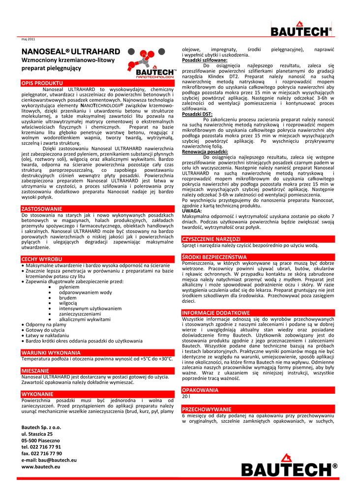 maj 2011 NANOSEAL® ULTRAHARD Wzmocniony krzemianowo‐litowy preparat pielęgnujący OPIS PRODUKTU Nanoseal ULTRAHARD to wysokowydajny, chemiczny pielęgnator, utwardzacz i uszczelniacz do powierzchni betonowych i cienkowarstwowych posadzek cementowych. Najnowsza technologia wykorzystująca elementy NANOTECHNOLOGII® związków krzemowo‐ litowych, dzięki przenikaniu i utwardzeniu betonu w strukturze molekularnej, a także maksymalnej zawartości litu pozwala na uzyskanie ultrawytrzymałej matrycy cementowej o ekstremalnych właściwościach fizycznych i chemicznych. Preparat na bazie krzemianu litu głęboko penetruje warstwę betonu, reagując z wolnym wodorotlenkiem wapnia, tworzy twardą, wytrzymałą, szczelną i zwarta strukturę. Dzięki zastosowaniu Nanoseal ULTRAHARD nawierzchnia jest zabezpieczona przed pyleniem, przenikaniem substancji płynnych (olej, roztwory soli), wilgocią oraz alkalicznymi wykwitami. Bardzo twarda, odporna na ścieranie powierzchnia pozostaje cały czas strukturą paroprzepuszczalną, co zapobiega powstawaniu destrukcyjnych ciśnień wewnątrz płyty posadzki. Powierzchnia zabezpieczona preparatem Nanoseal ULTRAHARD jest łatwa w utrzymaniu w czystości, a proces szlifowania i polerowania przy zastosowaniu dodatkowo preparatu Nanocoat nadaje jej bardzo wysoki połysk. ZASTOSOWANIE Do stosowania na starych jak i nowo wykonywanych posadzkach betonowych w magazynach, halach produkcyjnych, zakładach przemysłu spożywczego i farmaceutycznego, obiektach handlowych i sakralnych. Nanoseal ULTRAHARD może być stosowany na bardzo porowatych nawierzchniach o niskiej jakości jak i powierzchniach pylących i ulegających degradacji zapewniając maksymalne utwardzenie. CECHY WYROBU Maksymalne utwardzenie i bardzo wysoka odporność na ścieranie Znacznie lepsza penetracja w porównaniu z preparatami na bazie krzemianów potasu czy litu Zapewnia długotrwałe zabezpieczenie przed: pyleniem odparowywaniem wody brudem wilgocią intensywnym użytkowaniem zanieczyszczeniami alkalicznymi wykwitami Odporny na plamy Gotowy do użycia Łatwy w nakładaniu Bardzo krótki okres oddania posadzki do użytkowania WARUNKI WYKONANIA Temperatura podłoża i otoczenia powinna wynosić od +5°C do +30°C. MIESZANIE Nanoseal ULTRAHARD jest dostarczany w postaci gotowej do użycia. Zawartość opakowania należy dokładnie wymieszać. WYKONANIE Powierzchnia posadzki musi być jednorodna i wolna od zanieczyszczeń. Przed przystąpieniem do aplikacji preparatu należy usunąć mechanicznie wszelkie zanieczyszczenia (brud, kurz, pył, plamy Bautech Sp. z o.o. ul. Staszica 25 05‐500 Piaseczno tel. 022 716 77 91 fax. 022 716 77 90 e‐mail: [email protected] www.bautech.eu olejowe, impregnaty, środki pielęgnacyjne), naprawić i wypełnić ubytki i uszkodzenia. Posadzki szlifowane: Do osiągnięcia najlepszego rezultatu, zaleca się przeszlifowanie powierzchni szlifierkami planetarnymi do gradacji narzędzia Klindex DT2. Preparat należy nanosić na suchą nawierzchnię metodą natryskową i rozprowadzić mopem mikrofibrowym do uzyskania całkowitego pokrycia nawierzchni aby podłoga pozostała mokra przez 15 min w miejscach wysychających szybciej powtórzyć aplikację. Następnie należy odczekać 3‐6h w zależności od wentylacji pomieszczenia i kontynuować proces szlifowania. Posadzki DST: Po zakończeniu procesu zacierania preparat należy nanosić na suchą nawierzchnię metodą natryskową i rozprowadzić mopem mikrofibrowym do uzyskania całkowitego pokrycia nawierzchni aby podłoga pozostała mokra przez 15 min w miejscach wysychających szybciej powtórzyć aplikację. Po wyschnięciu przykrywamy nawierzchnię folią. Renowacja posadzki: Do osiągnięcia najlepszego rezultatu, zaleca się wstępne przeszlifowanie powierzchni istniejących posadzek czarnym padem w celu ich wyczyszczenia. Następnie należy nanieść preparat Nanoseal ULTRAHARD na suchą nawierzchnię metodą natryskową i rozprowadzić mopem mikrofibrowym do uzyskania całkowitego pokrycia nawierzchni aby podłoga pozostała mokra przez 15 min w miejscach wysychających szybciej powtórzyć aplikację. Następnie należy odczekać 3‐6h w zależności od wentylacji pomieszczenia. Po wyschnięciu przystępujemy do nanoszenia preparatu Nanocoat, zgodnie z kartą techniczną produktu. UWAGA: Maksymalna odporność i wytrzymałość uzyskana zostanie po około 7 dniach. Podczas użytkowania powierzchnia będzie zwiększać swoją twardość, wytrzymałość oraz połysk. CZYSZCZENIE NARZĘDZI Sprzęt i narzędzia należy czyścić bezpośrednio po użyciu wodą. ŚRODKI BEZPIECZEŃSTWA Pomieszczenia, w których wykonywane są prace muszą być dobrze wietrzone. Pracownicy powinni używać ubrań, butów, okularów i rękawic ochronnych. W przypadku kontaktu ze skórą zabrudzone miejsca należy natychmiast przemyć wodą z mydłem. Preparat jest alkaliczny i może spowodować podrażnienie oczu i skóry. W razie wystąpienia uczulenia udać się do lekarza. Preparat gruntujący nie jest środkiem szkodliwym dla środowiska. Przechowywać poza zasięgiem dzieci. INFORMACJE DODATKOWE Wszystkie informacje odnoszą się do wyrobów przechowywanych i stosowanych zgodnie z naszymi zaleceniami i podane są w dobrej wierze i uwzględniają aktualny stan wiedzy oraz posiadane doświadczenie firmy Bautech. Użytkownik zobowiązany jest do stosowania produktu zgodnie z jego przeznaczeniem i zaleceniami Bautech. Wszystkie podane dane techniczne bazują na próbach i testach laboratoryjnych. Praktyczne wyniki pomiarów mogą nie być identyczne ze względu na warunki, umiejscowienie, sposób aplikacji i inne okoliczności, na które firma Bautech nie ma wpływu. Odmienne zalecania naszych pracowników wymagają formy pisemnej, aby były ważne. Wraz z ukazaniem się niniejszej instrukcji, wszystkie poprzednie tracą ważność. OPAKOWANIA 20 l PRZECHOWYWANIE 6 miesięcy od daty podanej na opakowaniu przy przechowywaniu 