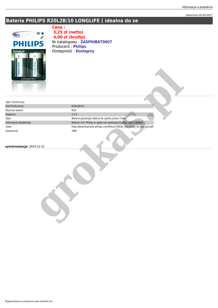 Informacje o produkcie Utworzono 02-03-2017 Bateria PHILIPS R20L2B/10 LONGLIFE ( idealna do ze Cena : 3,25 zł (netto) 4,00 zł (brutto) Opis Techniczny: .p l Nr katalogowy : ZASPHIBAT0007 Producent : Philips Dostępność : Dostępny R20L2B/10 Rozmiar baterii R20 Napięcie 1,5 V Opis Bateria pozostaje zdatna do użytku przez 3 lata Informacje dodatkowe Baterie ZnC Philips w ogóle nie zawierają kadmu, rtęci i ołowiu www http://download.p4c.philips.com/files/r/r20l2b_10/r20l2b_10_pss_pol.pdf Gwarancja 24M gr ok synchronizacja: 2014-12-12 as Kod Producenta Wygenerowano w programie www.oscGold.com