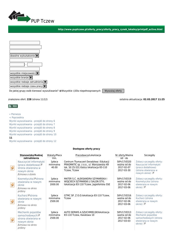 PUP Tczew http://www.puptczew.pl/oferty_pracy/oferty_pracy_rynek_lokalny/printpdf_active.html Ukryj wyszukiwarke dowolne wykształcenie ▼ wszystkie miejscowości ▼ wszystkie branże ▼ wszystkie rodzaje zatrudnienia ▼ wszystkie rodzaje czasu pracy ▼ Do Jakiej grupy osób kierować wyszukiwanie? Wszystkie Dla niepełnosprawnych Wyszukaj oferty znaleziono ofert: 228 (strona 11/12) ostatnia aktualizacja: 02.03.2017 11:25 « Pierwsza < Poprzednia Wyniki wyszukiwania - przejdź do strony 6 Wyniki wyszukiwania - przejdź do strony 7 Wyniki wyszukiwania - przejdź do strony 8 Wyniki wyszukiwania - przejdź do strony 9 Wyniki wyszukiwania - przejdź do strony 10 11 Wyniki wyszukiwania - przejdź do strony 12 Dostępne oferty pracy Stanowisko/Rodzaj zatrudnienia Nauczyciel informatyki (praca dodatkowa) strona otwierana w nowym oknie /Umowa o dzieło Kosmetyczka strona otwierana w nowym oknie /Umowa na okres Wakaty/Płaca Pracodawca/Lokalizacja min. 1płaca Centrum Tłumaczeń Doradztwa i Edukacji minimalna PRAGMATIC sp. z o.o., ul. Warszawska 49 40.00 lok. 50 25-531 Kielce lokalizacja 83-110 Tczew, Tczew Nr oferty/Ważna od - do StPr/17/0320 ważna od do 2017-02-07 2017-03-30 Szczegóły Zobacz szczegóły oferty: Nauczyciel informatyki (praca dodatkowa) (strona otwierana w nowym oknie) 1płaca minimalna 2000.00 MATER S.C. ALEKSANDRA SZYMAŃSKA I WOJCIECH SZYMAŃSKI // SALON STYL lokalizacja 83-110 Tczew, Jagiellońska 55E StPr/17/0319 ważna od do 2017-02-06 2017-03-06 Zobacz szczegóły oferty: Kosmetyczka (strona otwierana w nowym oknie) 1płaca minimalna 2500.00 GTMC SP. Z O.O.lokalizacja 83-110 Tczew, Tczew StPr/17/0316 ważna od do 2017-02-06 2017-03-06 Zobacz szczegóły oferty: Kucharz (strona otwierana w nowym oknie) 1płaca minimalna 2500.00 AUTO SERWIS A.SZUCHMIELSKIlokalizacja 83-110 Tczew, Kwiatowa 10 StPr/17/0313 ważna od do 2017-02-06 2017-03-03 Zobacz szczegóły oferty: Mechanik pojazdów samochodowych (strona otwierana w nowym oknie) próbny Kucharz strona otwierana w nowym oknie /Umowa na okres próbny Mechanik pojazdów samochodowych strona otwierana w nowym oknie /Umowa na okres próbny Stanowisko/Rodzaj zatrudnienia Pracownik ochrony strona otwierana w nowym oknie /Umowa zlecenie Wakaty/Płaca Pracodawca/Lokalizacja min. 1płaca GARDA SP. Z O.O.lokalizacja 83-110 Tczew, minimalna Tczew 13.00 Nr oferty/Ważna od - do StPr/17/0312 ważna od do 2017-02-06 2017-03-03 Szczegóły Zobacz szczegóły oferty: Pracownik ochrony (strona otwierana w nowym oknie) 1płaca minimalna 1000.00 FIRMA HANDLOWO - USŁUGOWA ELMIKRO STREHLAU MIROSŁAWlokalizacja 83-110 Tczew, Jedności Narodu 16 StPr/17/0311 ważna od do 2017-02-06 2017-03-03 Zobacz szczegóły oferty: Florystka- kwiaciarka (1/2 - 1 etat) (strona otwierana w nowym oknie) 5płaca minimalna 49.00 UNIMET SP. Z O.O.lokalizacja StPr/17/0310 ważna od do 2017-02-06 2017-03-03 Zobacz szczegóły oferty: Murarz / Murarz klinkierowy (strona otwierana w nowym oknie) 1płaca minimalna 49.00 UNIMET SP. Z O.O.lokalizacja StPr/17/0309 ważna od do 2017-02-06 2017-03-03 Zobacz szczegóły oferty: Operator żurawia wieżowego (strona otwierana w nowym oknie) 3płaca minimalna 2000.00 BONA DEA ANNA OSTROWSKAlokalizacja 83-110 Tczew, 30 Stycznia 32 StPr/17/0308 ważna od do 2017-02-06 2017-03-03 Zobacz szczegóły oferty: Krojczy (strona otwierana w nowym oknie) 3płaca minimalna 2000.00 BONA DEA ANNA OSTROWSKAlokalizacja 83-110 Tczew, 30 Stycznia 32 StPr/17/0307 ważna od do 2017-02-06 2017-03-03 Zobacz szczegóły oferty: Krawcowa (strona otwierana w nowym oknie) 3płaca minimalna 2000.00 BONA DEA ANNA OSTROWSKAlokalizacja 83-110 Tczew, 30 Stycznia 32 StPr/17/0306 ważna od do 2017-02-06 2017-03-03 Zobacz szczegóły oferty: Szwaczka (strona otwierana w nowym oknie) 20płaca minimalna 2200.00 "PROGRES SPÓŁKA Z OGRANICZONĄ ODPOWIEDZIALNOŚCIĄ" SPÓŁKA KOMANDYTOWAlokalizacja 83-010 Straszyn, Straszyn 20 StPr/17/0305 ważna od do 2017-02-06 2017-03-06 Zobacz szczegóły oferty: Konsultant telefoniczny (strona otwierana w nowym oknie) 1płaca minimalna 17.00 ZUP ERGOM SP.Z O.Olokalizacja 00-386 Gdańsk, Gdańsk 69 StPr/17/0303 ważna od do 2017-02-03 2017-03-02 Zobacz szczegóły oferty: Monter - Spawacz (strona otwierana w nowym oknie) 1płaca minimalna 2200.00 P.P.H . ART.SPOŻYWCZO-PRZEMYSŁOWYCH - JÓZEF WĄSlokalizacja 83-110 Tczew, Czyżykowska 32 StPr/17/0302 ważna od do 2017-02-03 2017-03-02 Zobacz szczegóły oferty: Sprzedawca (strona otwierana w nowym oknie) Kucharz / Pizzerman (możliwość przyuczenia) strona otwierana w nowym oknie /Umowa zlecenie 1płaca minimalna 13.00 CEZARY SUSKA SCSlokalizacja 83-110 Tczew, Pomorska 1 StPr/17/0301 ważna od do 2017-02-03 2017-03-02 Zobacz szczegóły oferty: Kucharz / Pizzerman (możliwość przyuczenia) (strona otwierana w nowym oknie) Sprzedawca strona otwierana w nowym oknie /Umowa o pracę na czas 1płaca minimalna 2000.00 OMEGA Adam Maciaślokalizacja 83-111 Malenin, Długa 49A StPr/17/0300 ważna od do 2017-02-03 2017-03-02 Zobacz szczegóły oferty: Sprzedawca (strona otwierana w nowym oknie) Florystka- kwiaciarka (1/2 - 1 etat) strona otwierana w nowym oknie /Umowa na okres próbny Murarz / Murarz klinkierowy strona otwierana w nowym oknie /Umowa o pracę na czas określony Operator żurawia wieżowego strona otwierana w nowym oknie /Umowa o pracę na czas określony Krojczy strona otwierana w nowym oknie /Umowa na okres próbny Krawcowa strona otwierana w nowym oknie /Umowa na okres próbny Szwaczka strona otwierana w nowym oknie /Umowa na okres próbny Konsultant telefoniczny strona otwierana w nowym oknie /Umowa o pracę na czas określony Monter - Spawacz strona otwierana w nowym oknie /Umowa o pracę na czas określony Sprzedawca strona otwierana w nowym oknie /Umowa o pracę na czas określony określony Stanowisko/Rodzaj zatrudnienia Sprzedawca (1/2 etatu lub pełen etat) strona otwierana w nowym oknie /Umowa na okres Wakaty/Płaca Pracodawca/Lokalizacja min. 1płaca