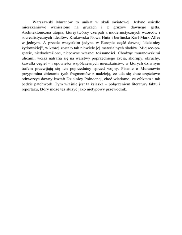 Warszawski Muranów to unikat w skali światowej. Jedyne osiedle mieszkaniowe wzniesione na gruzach i z gruzów dawnego getta. Architektoniczna utopia, której twórcy czerpali z modernistycznych wzorców i socrealistycznych ideałów. Krakowska Nowa Huta i berlińska Karl-Marx-Allee w jednym. A przede wszystkim jedyna w Europie część dawnej "dzielnicy żydowskiej", w której zostało tak niewiele jej materialnych śladów. Miejsce-pogetcie, niedookreślone, niepewne własnej tożsamości. Chodząc muranowskimi ulicami, wciąż natrafia się na warstwy poprzedniego życia, skorupy, okruchy, kawałki cegieł – i opowieści współczesnych mieszkańców, w których dziwnym trafem przewijają się ich poprzednicy sprzed wojny. Pisanie o Muranowie przypomina zbieranie tych fragmentów z nadzieją, że uda się choć częściowo odtworzyć dawny kształt Dzielnicy Północnej, choć wiadomo, że efektem i tak będzie patchwork. Tym właśnie jest ta książka – połączeniem literatury faktu i reportażu, który może też służyć jako nietypowy przewodnik.